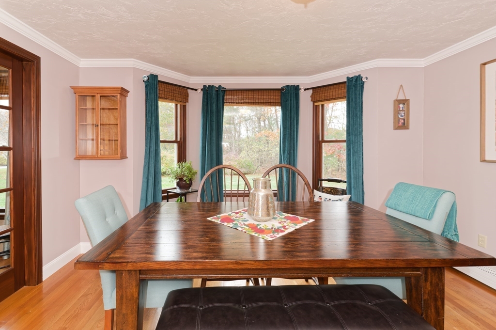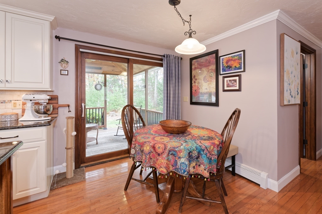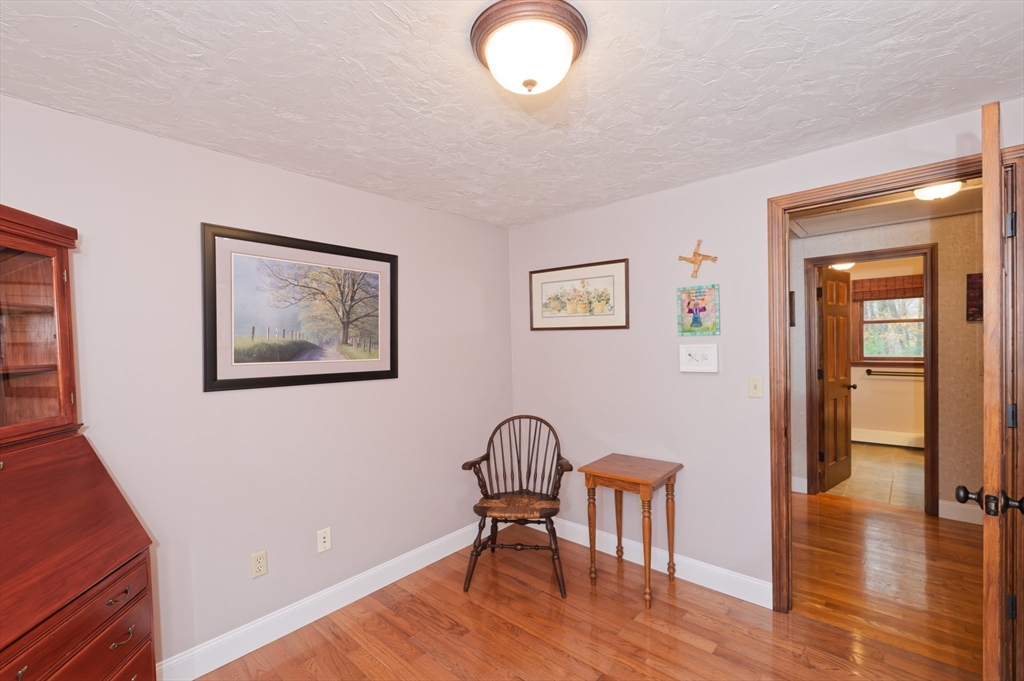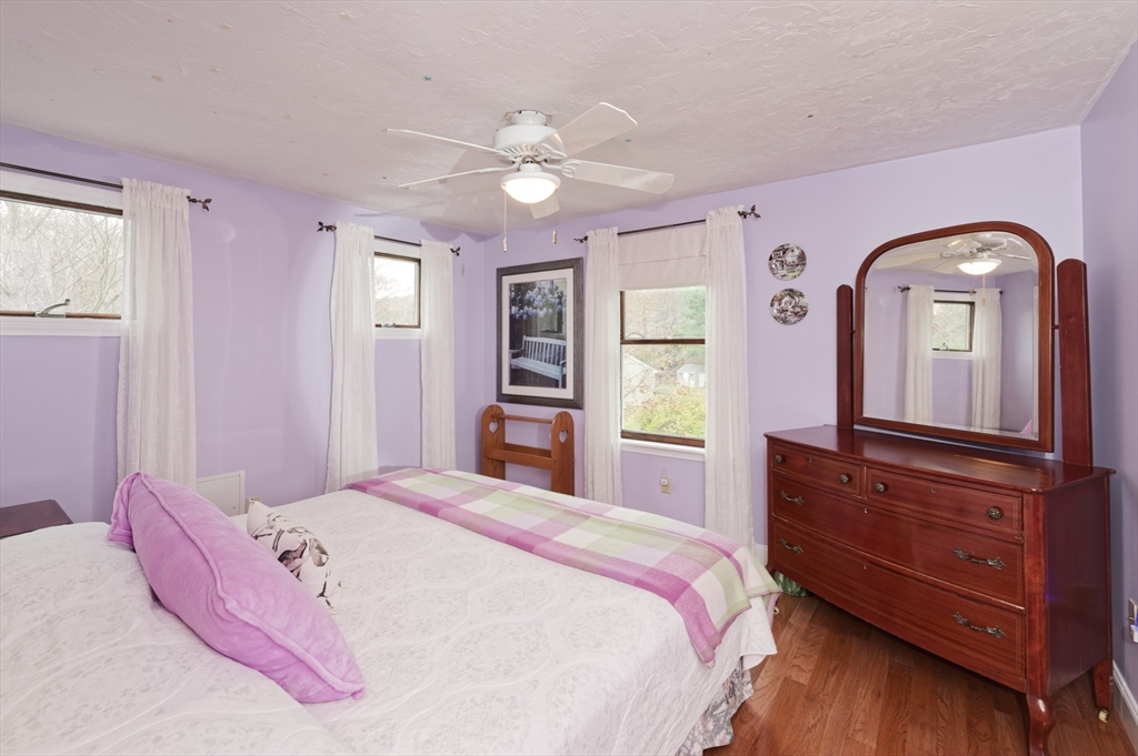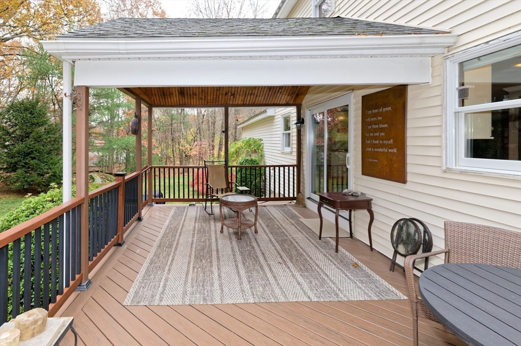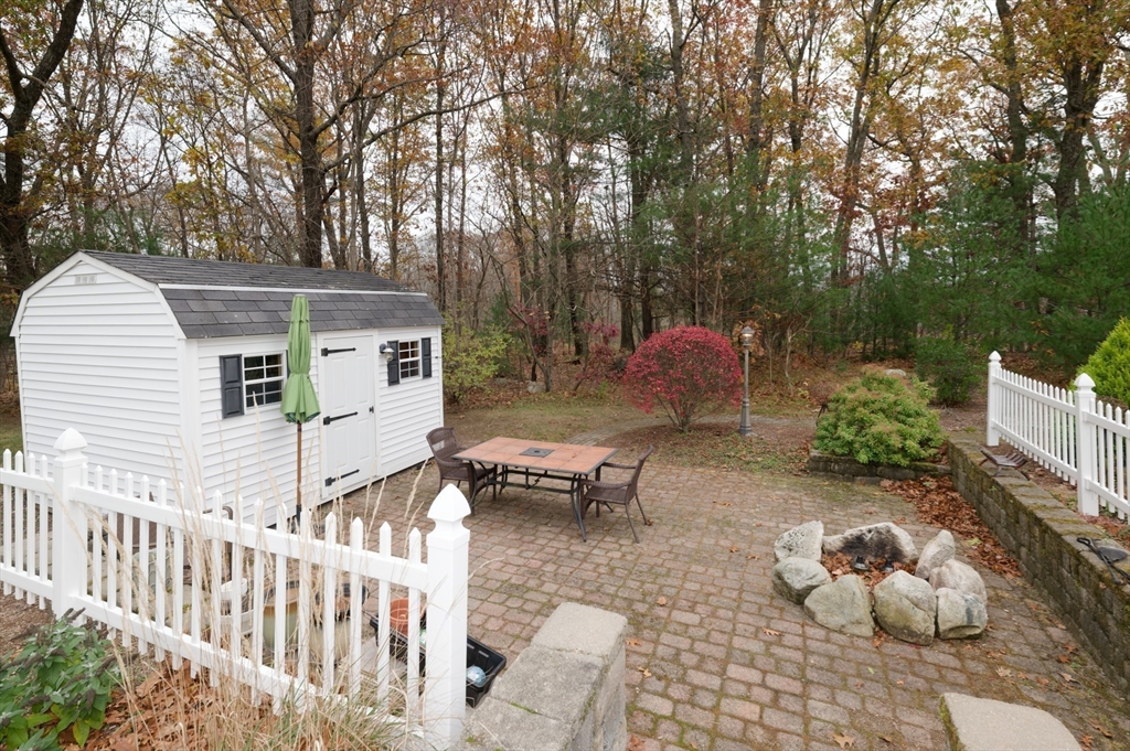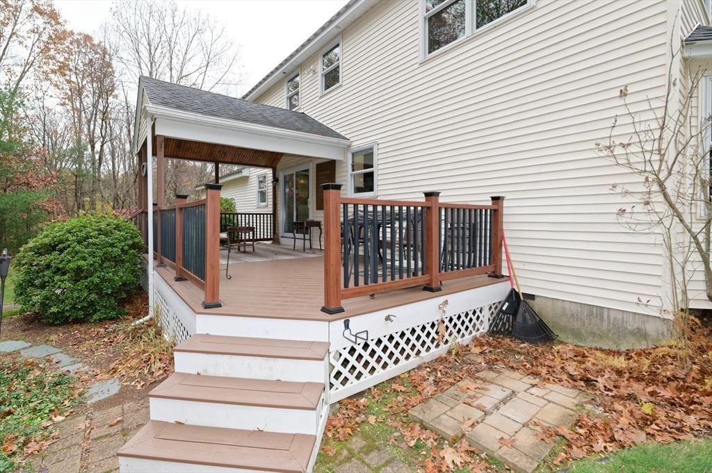 Make this much loved and cared for colonial your new home! Roaming first floor offers flexibility. Spacious family room with gas fireplace allows for several seating options. French doors lead into the more formal dining rm that leads into the cheerful kitchen featuring a center island, mix of solid and glass-front cabinetry - perfect for showcasing fine dinnerware or decorative pieces & a breakfast area overlooking the covered porch & back yard. Fireplaced living rm can function as a den or formal area & a first floor laundry in the updated half bath. Four bedrooms up with the primary boasting a walk in closet & en-suite bath updated with a modern solid surface vanity, tile floor & tiled shower. An add'l full bath services the other bedrooms. Hardwood floors thru 1st AND 2nd floors. Small bonus room finished in the basement. Add to all this an acre lot, oversized 12x24 deck (partially covered), a patio & shed all in a neighborhood setting on a cul-de-sac! Minutes to Rt 495 & shopping.