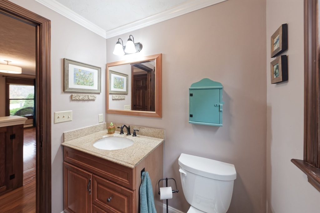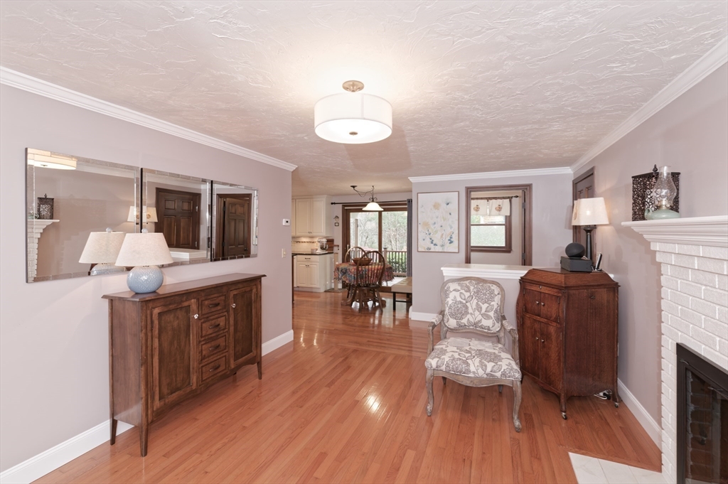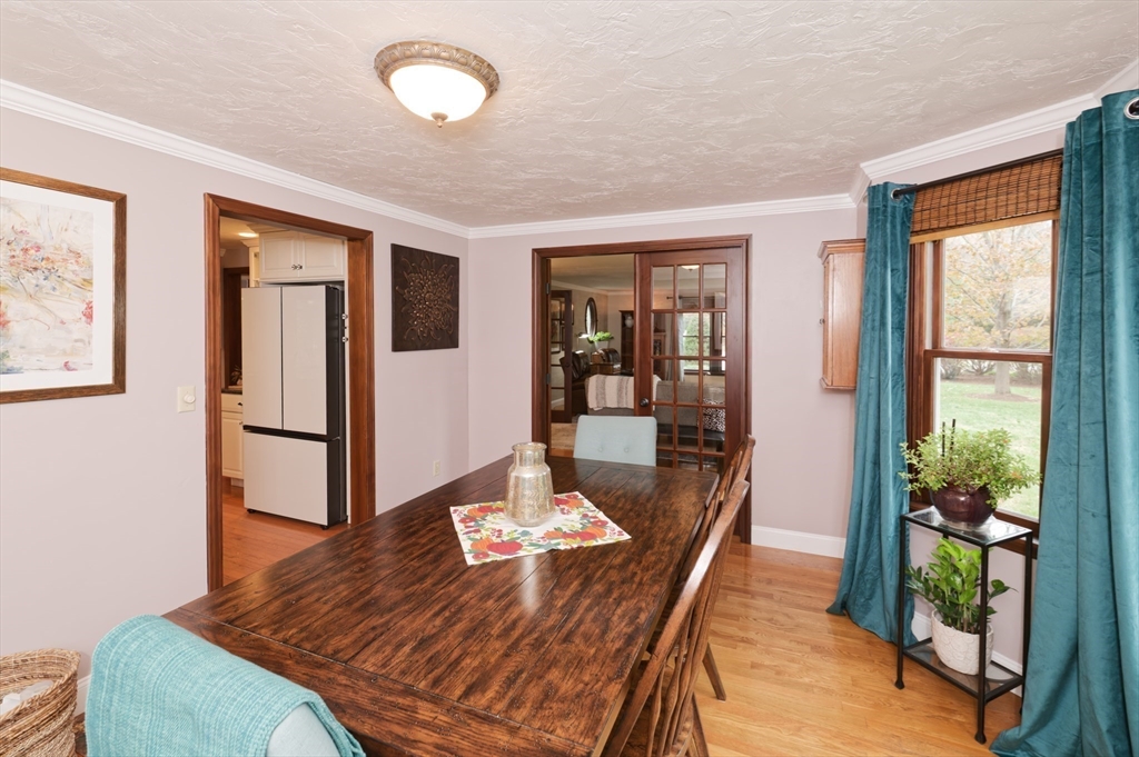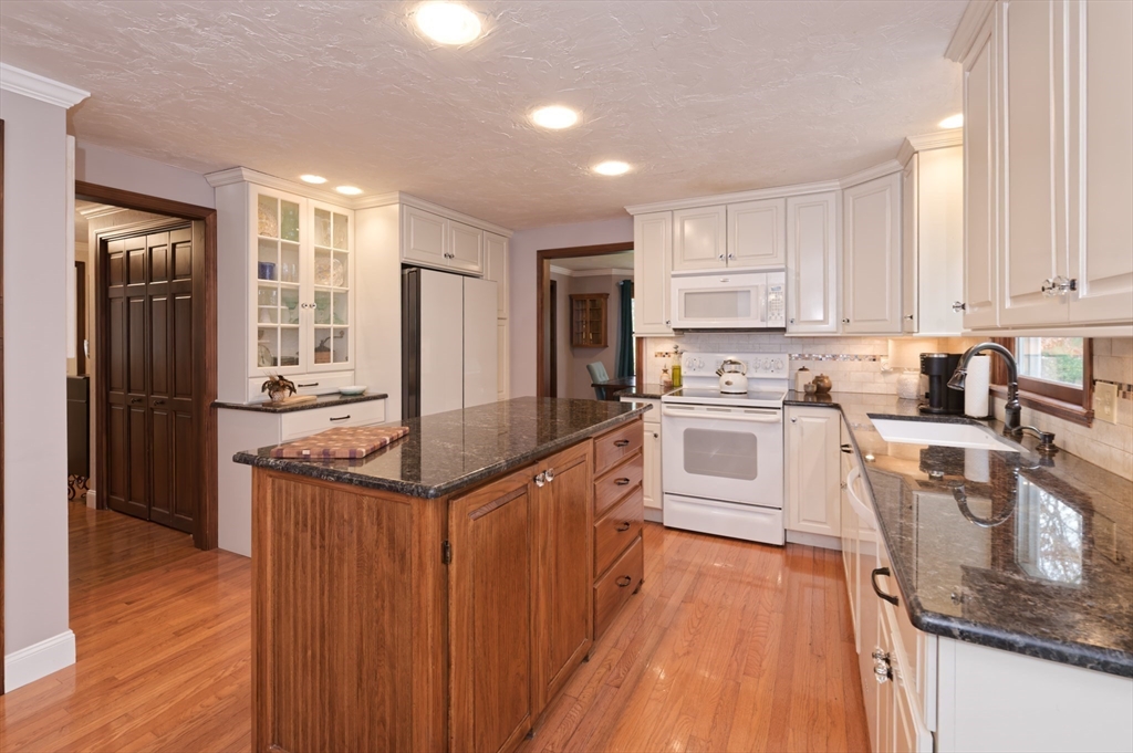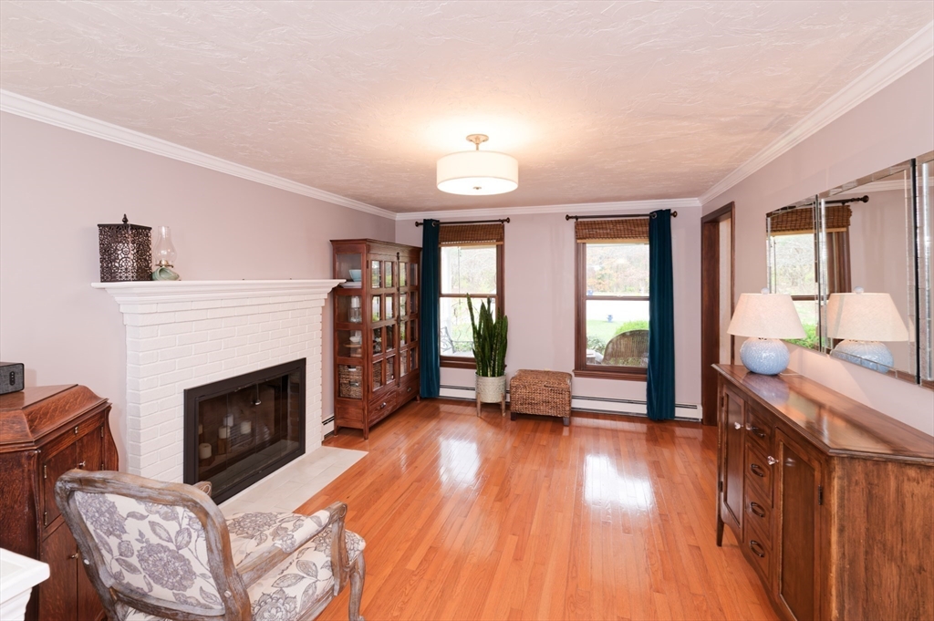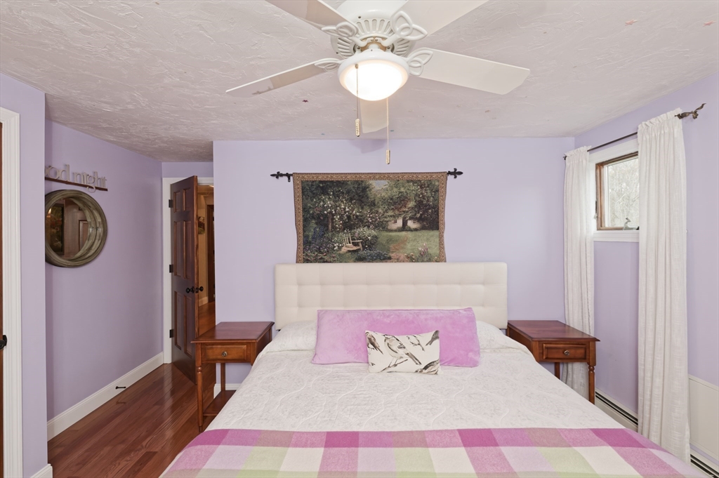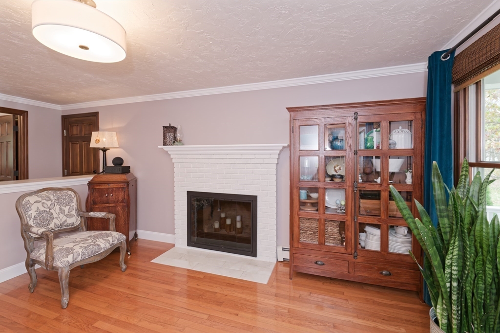 Make this much loved and cared for colonial your new home! Roaming first floor offers flexibility. Spacious family room with gas fireplace allows for several seating options. French doors lead into the more formal dining rm that leads into the cheerful kitchen featuring a center island, mix of solid and glass-front cabinetry - perfect for showcasing fine dinnerware or decorative pieces & a breakfast area overlooking the covered porch & back yard. Fireplaced living rm can function as a den or formal area & a first floor laundry in the updated half bath. Four bedrooms up with the primary boasting a walk in closet & en-suite bath updated with a modern solid surface vanity, tile floor & tiled shower. An add'l full bath services the other bedrooms. Hardwood floors thru 1st AND 2nd floors. Small bonus room finished in the basement. Add to all this an acre lot, oversized 12x24 deck (partially covered), a patio & shed all in a neighborhood setting on a cul-de-sac! Minutes to Rt 495 & shopping.