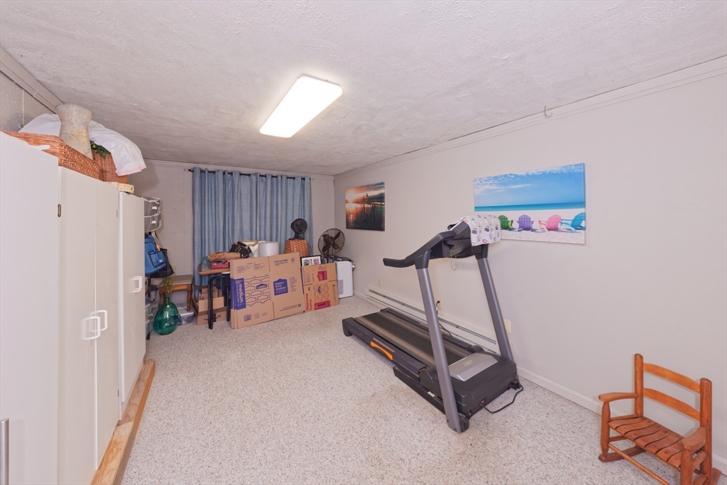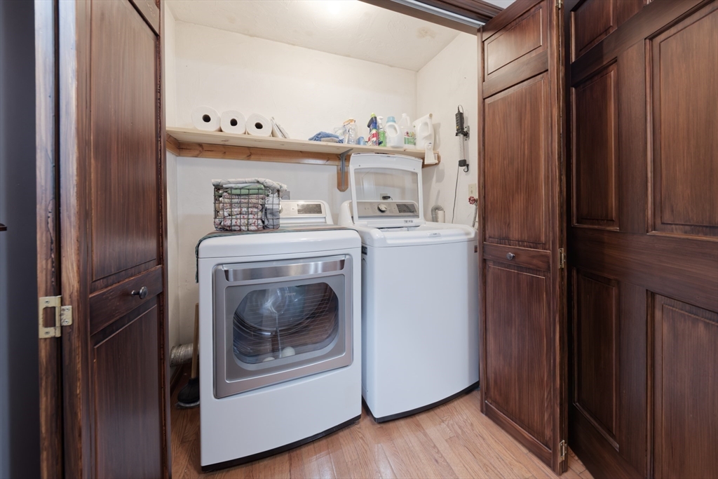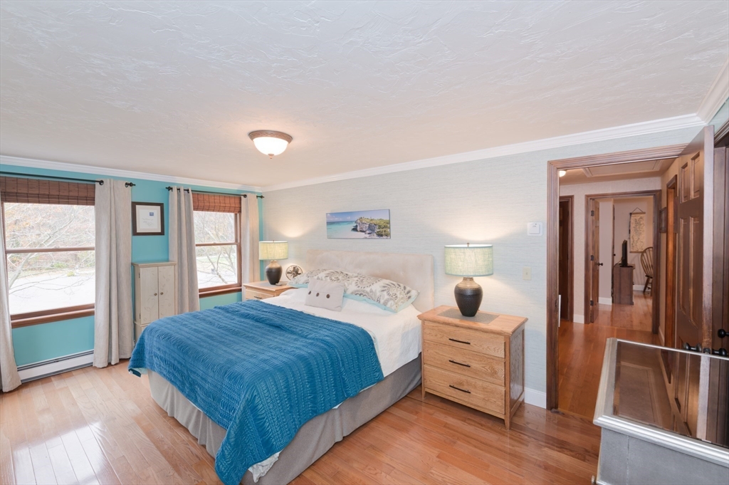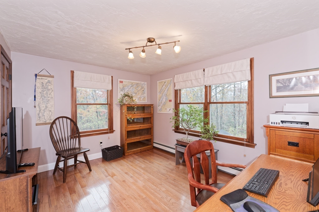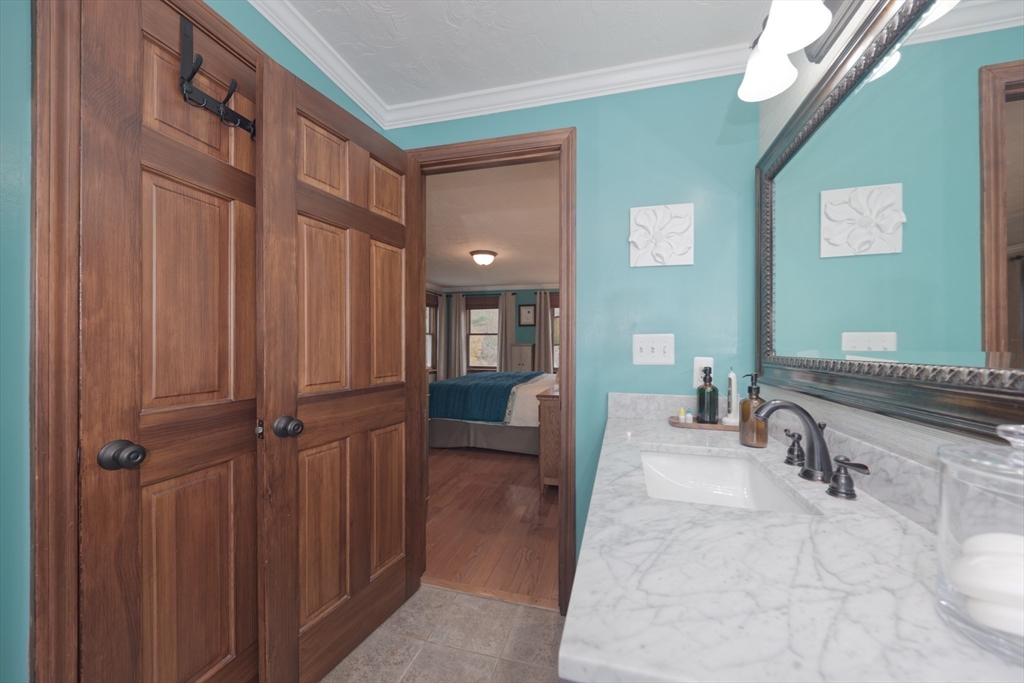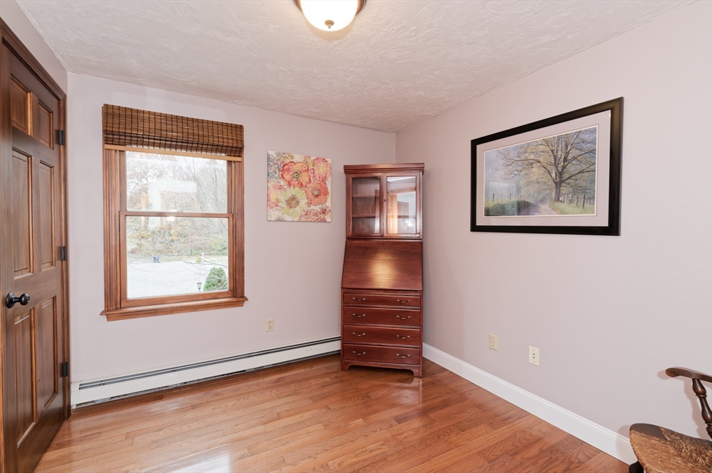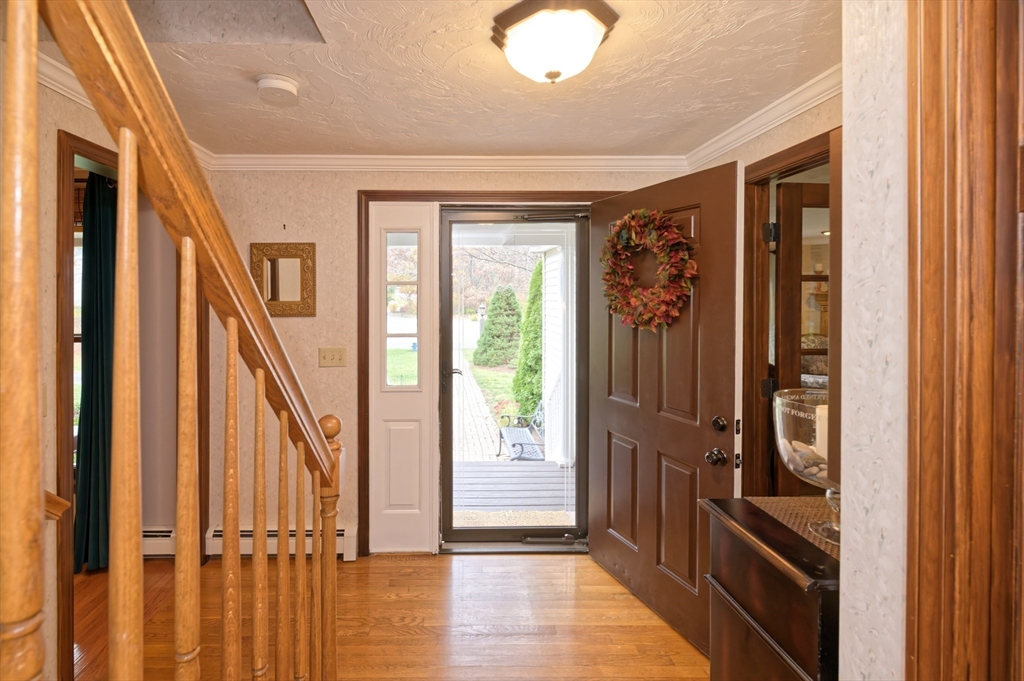 Make this much loved and cared for colonial your new home! Roaming first floor offers flexibility. Spacious family room with gas fireplace allows for several seating options. French doors lead into the more formal dining rm that leads into the cheerful kitchen featuring a center island, mix of solid and glass-front cabinetry - perfect for showcasing fine dinnerware or decorative pieces & a breakfast area overlooking the covered porch & back yard. Fireplaced living rm can function as a den or formal area & a first floor laundry in the updated half bath. Four bedrooms up with the primary boasting a walk in closet & en-suite bath updated with a modern solid surface vanity, tile floor & tiled shower. An add'l full bath services the other bedrooms. Hardwood floors thru 1st AND 2nd floors. Small bonus room finished in the basement. Add to all this an acre lot, oversized 12x24 deck (partially covered), a patio & shed all in a neighborhood setting on a cul-de-sac! Minutes to Rt 495 & shopping.