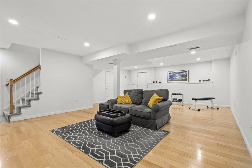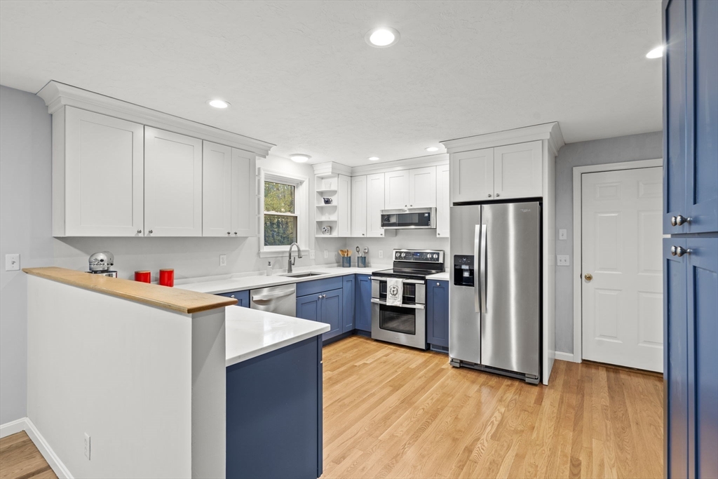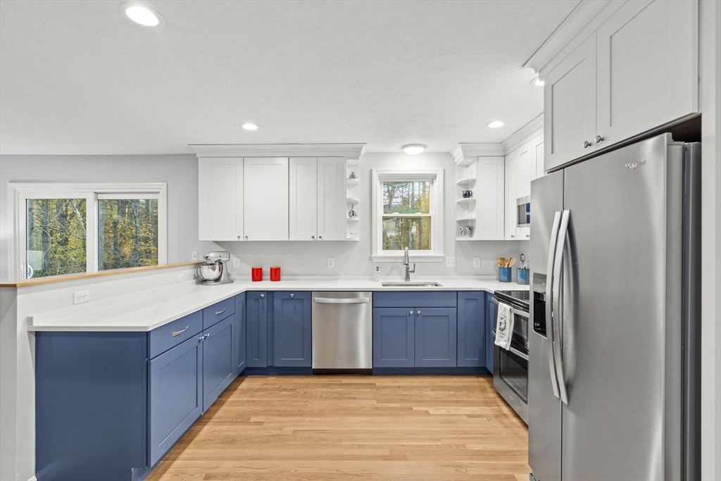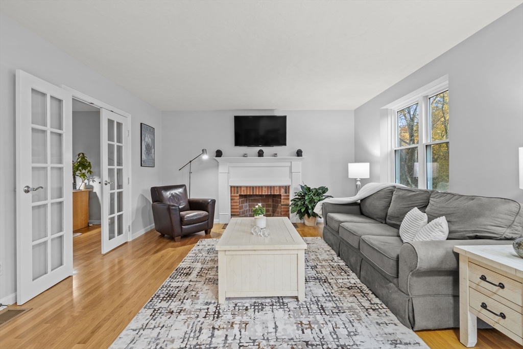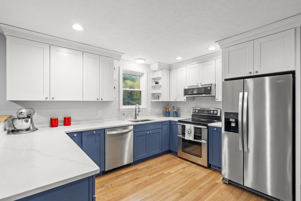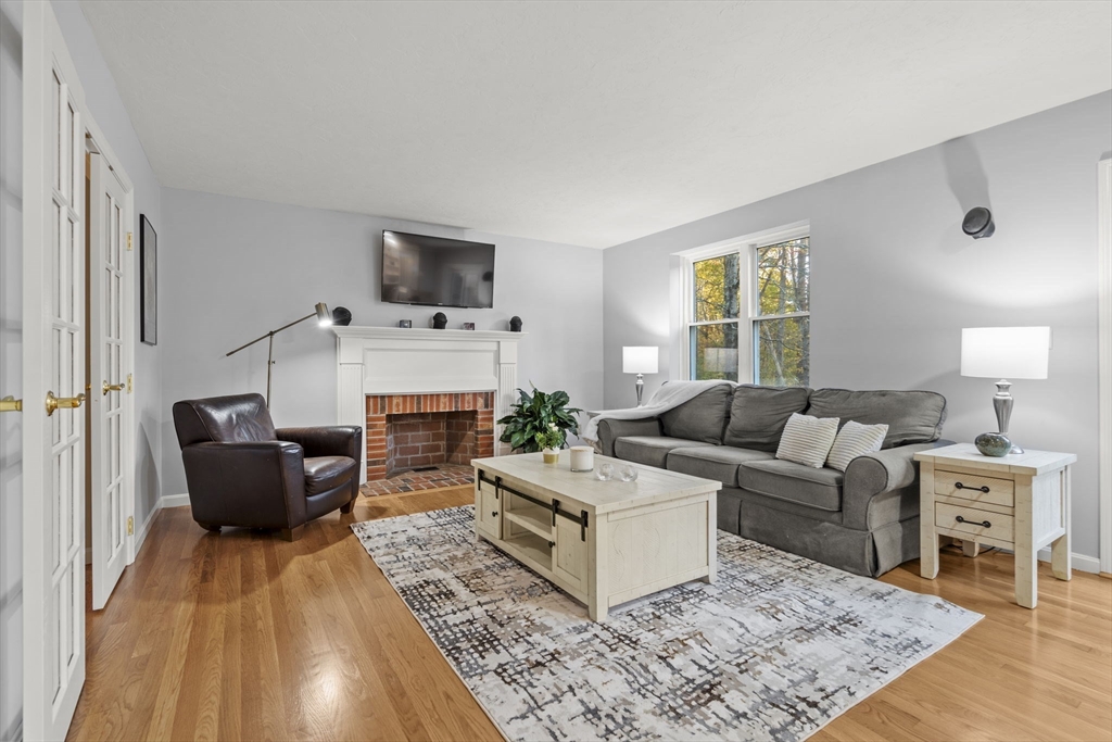 Exceptional and inviting, this beautifully appointed home offers gracious living spaces and upgraded amenities on a generous .92 acre lot. Sun filled interiors feature refinished hardwood floors and new paint throughout. Installed in 2025, the brand new kitchen features gorgeous quartzite counters, all new cabinetry and new stainless steel appliances. Open and airy, the kitchen connects directly with the family room featuring a brick fireplace and hearth as its focal point. The front dining room provides generous room for entertaining and the living room, currently used as a home office, has a wonderful set of French doors that open directly into the family room. Upstairs, the luxurious primary suite includes a spa like bath, amazing closet space and vaulted ceiling. Three additional bedrooms and a full bath round out the second level. All four bedrooms just had new carpets installed. The finished basement has room for both hosting movie nights and a home gym. Attached 2 car garage.