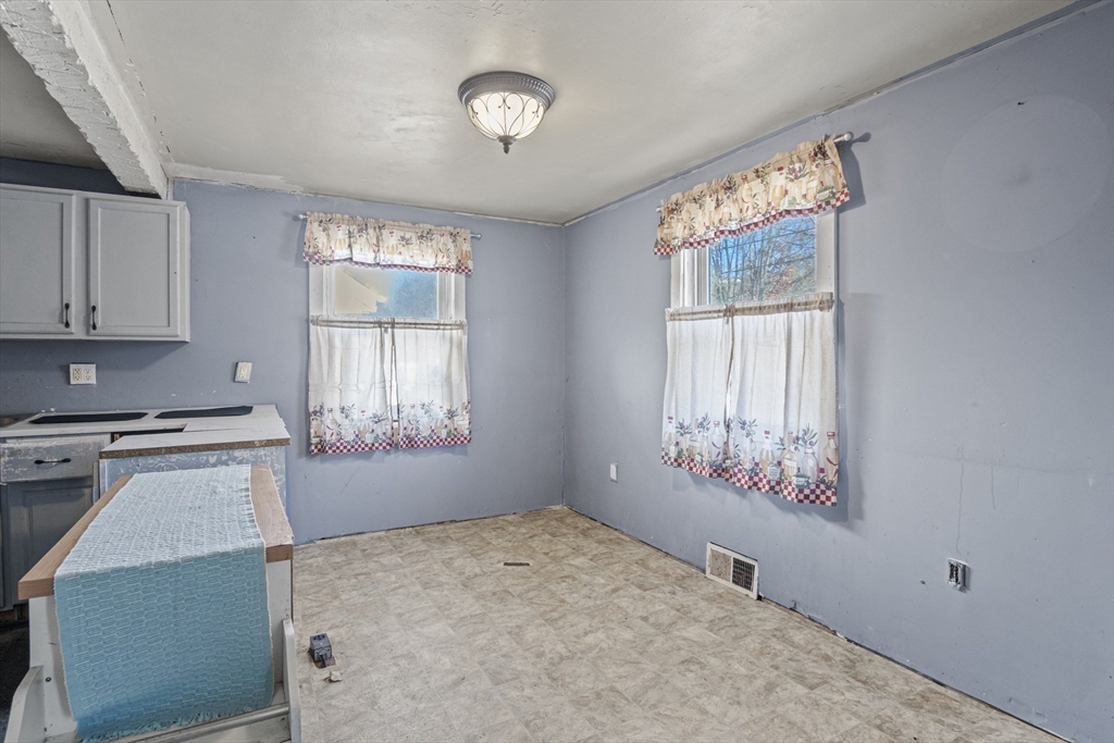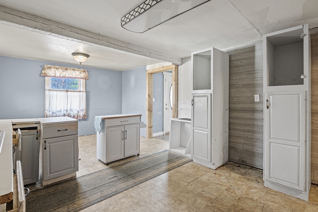 Bring your imagination and some elbow grease to make this hidden gem shine again! Leave the clutter of shoes and coats out of sight in the welcoming breezeway before entering into the large eat-in kitchen. The cozy living room features a wood stove, perfect for chilly evenings, and flows seamlessly into the adjacent formal dining area. A convenient first-floor bedroom and full bath offer flexible living options. Upstairs, you’ll find two additional bedrooms, each with ample closet space. Some of the laminate flooring has original hardwood underneath. Enjoy the beauty of the New England seasons from the inviting three-season porch. Outside, a paved driveway leads to an oversized one-car garage with plenty of space for storage or a workshop area. The partially fenced-in yard is generous in size—ideal for play, entertaining, or gardening. Tucked away in a peaceful setting yet close to shopping, restaurants, and more, this home is ready for your personal touch!