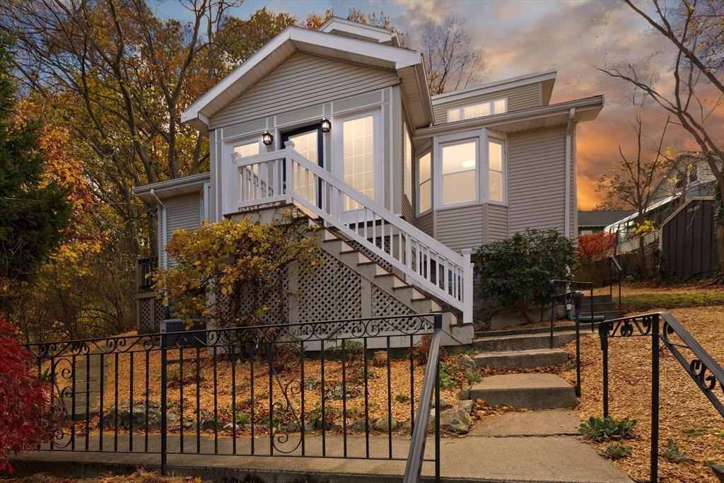Charming cape, sited on lovely tiered lot, up away from street with mature plantings. Welcoming entry way leads to open floor plan featuring light and bright living room with French doors to relaxing deck. Inviting dining room with built-in hutch--great for entertaining--hardwood floors, newer windows. Updated kitchen with granite counters, upgraded appliances, open to comfortable family room with new flooring. First floor bedroom, office, full bath. Newly carpeted second floor--main bedroom with built-in sconces, additional bedroom, bath and generous storage. Full, partially-finished basement with laundry room Improvements and updates throughout. Serene private rear yard abutting conservation land. Storage Shed. Conveniently located to trails, parks, restaurants, and all that Melrose and surrounding towns have to offer. Short distance to highways, universities, hospitals, museums, entertainment, sporting events, and all that Boston has to offer. A truly special property
