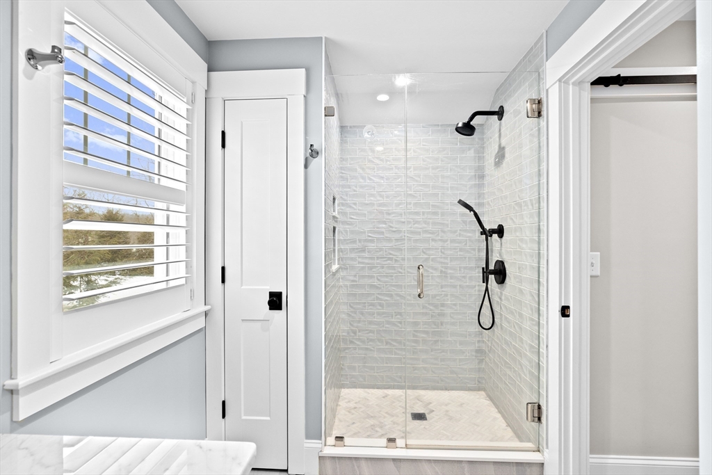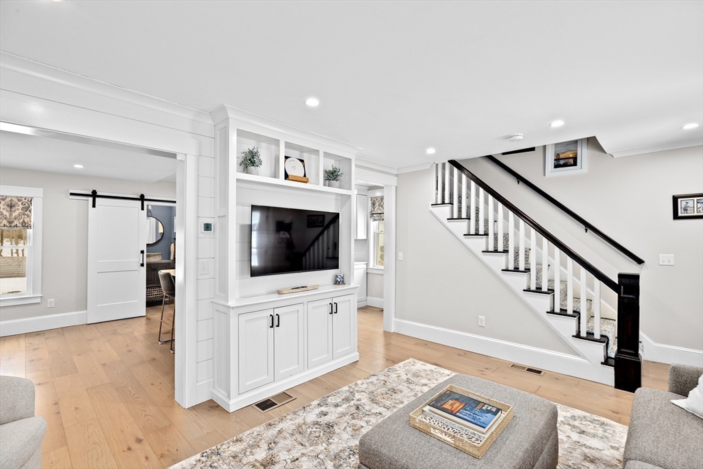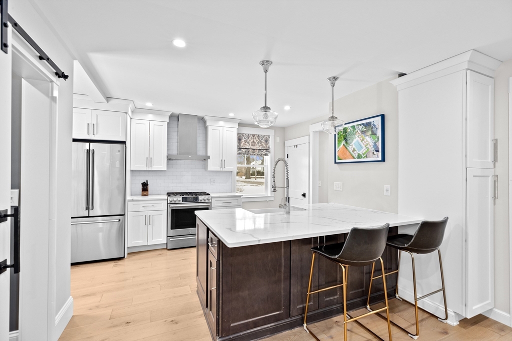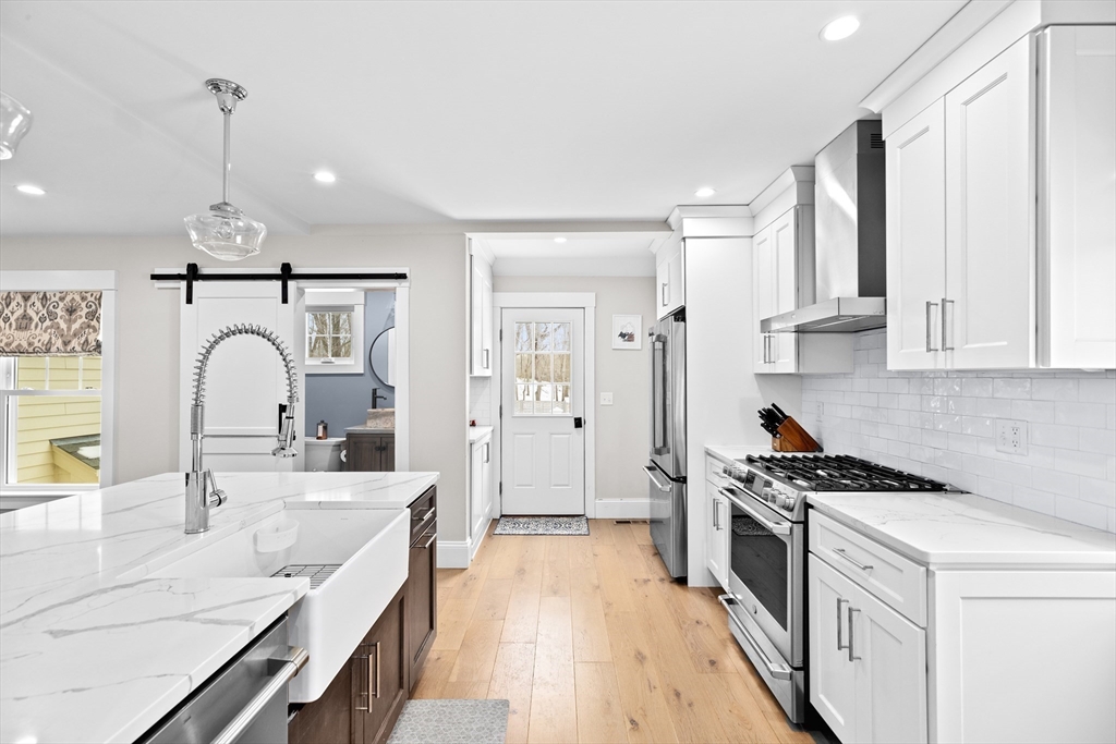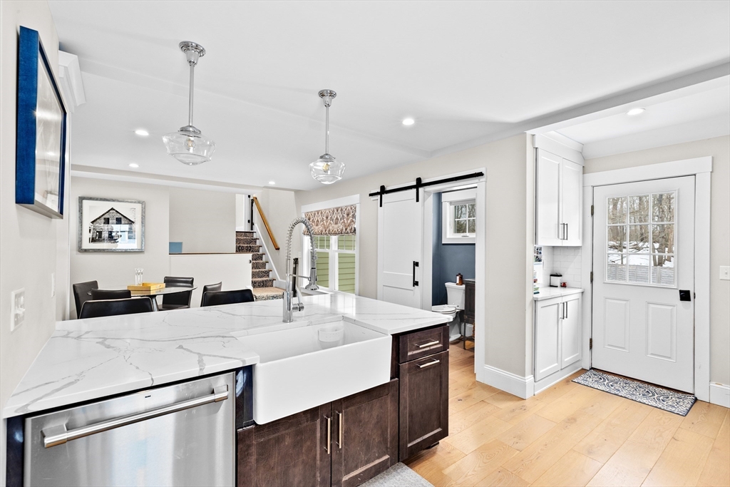 This classic New England farmhouse was beautifully renovated by Oak Development & Design in 2019, blending timeless charm with modern functionality. The main level offers a cozy living room with built-ins and shiplap detail, and a chef’s kitchen featuring quartz countertops and stainless steel appliances. There’s also a stylish half bath with a custom stone vessel sink and barn door, along with a separate dining area. The en-suite primary bedroom boasts vaulted ceilings, two walk-in closets, and a stunning bath with a glass shower. A second bedroom and full laundry room complete this level. Just up a few steps are two additional bedrooms, a spacious second bath, and extra storage. The walkout lower level includes a mudroom and an inviting family room with a gas fireplace and built-in beverage center. Outside, enjoy the newly fenced yard, deck off the kitchen, and a patio with a gas hookup—perfect for entertaining and everyday living.