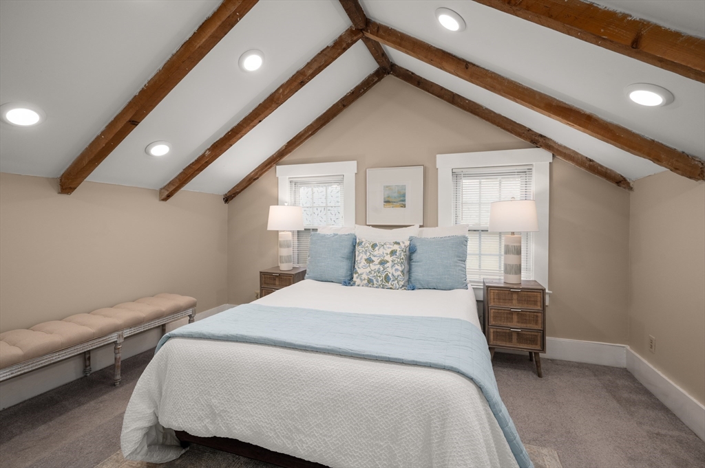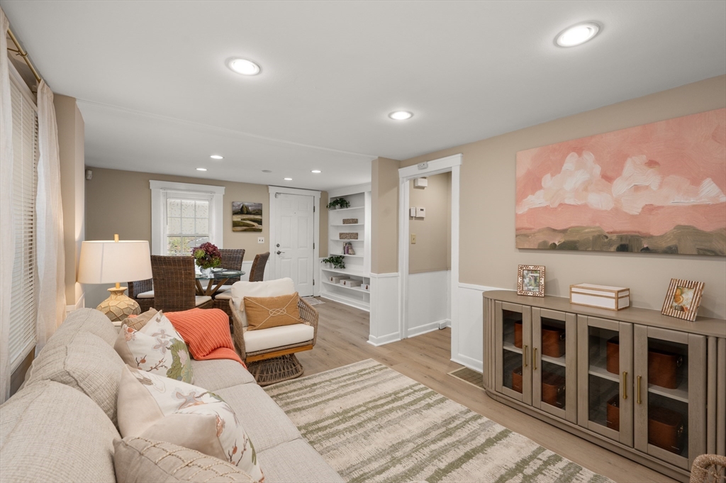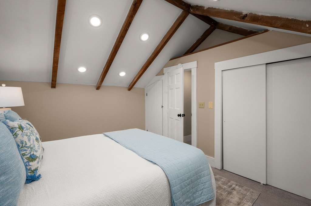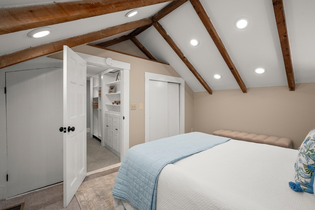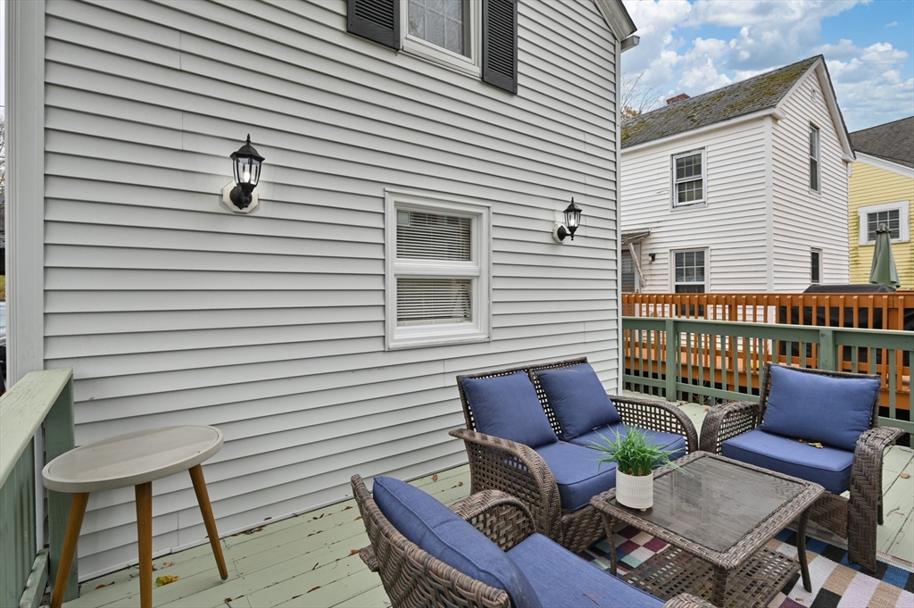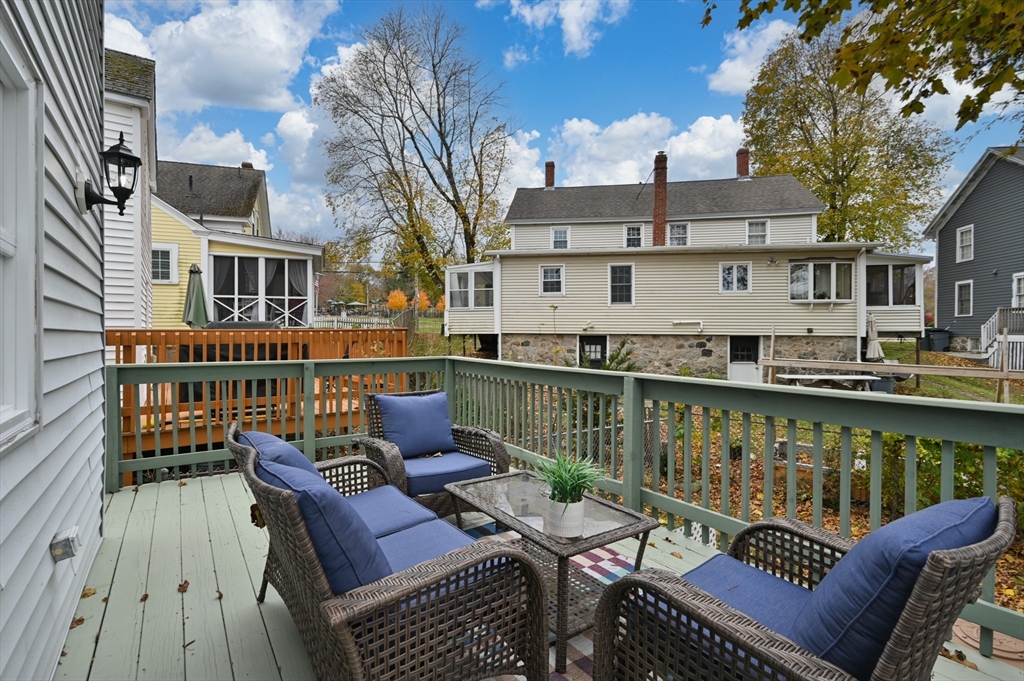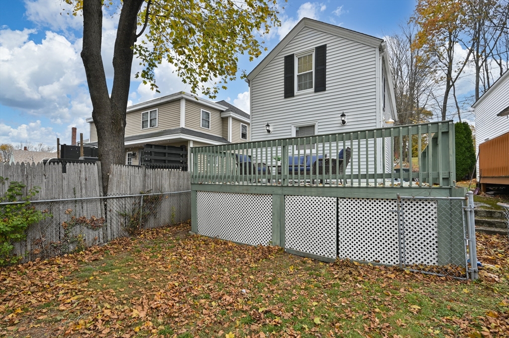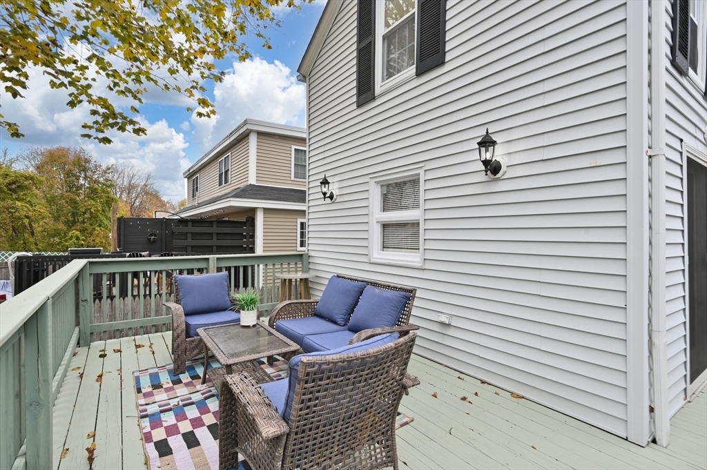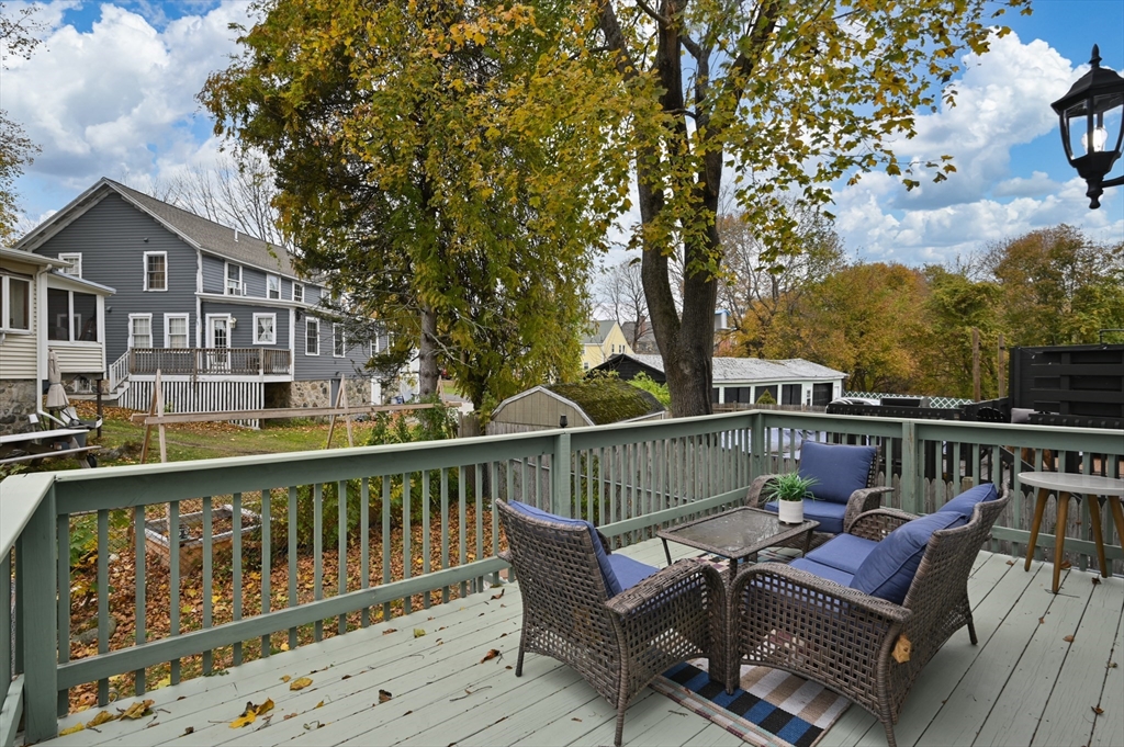 Quintessential charm meets modern day living in the heart of old North Andover. This is truly the sweetest property for new Owners to be home for for Holidays! Warm and inviting entryway into a seemless open concept floorplan. Entertaining ease with a combined living and dining room, thoughtfully designed space. Built ins and beautiful natural light add to the comfortable vibe in the main living area. Kitchen is well sized with french doors to freshly painted wrap around decking. Outdoor area is neat and tidy, fenced in and low maintenance, ideal for carefree lifestyles. Bedrooms with vaulted ceilings and wood beams, create a uniques backdrop for your decorating ideas. Full bath completes the 2nd floor space and has more added charm. Crisp, neutral freshly painted interior and central air are a bonus! Commuter friendly location and nearby to all that the vibrant North Andover community offers. Single family turnkey homes under 500K are few and far between in this sought after town!
