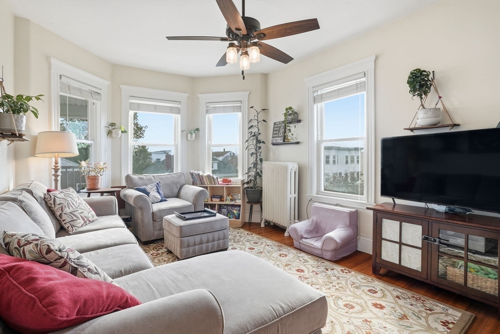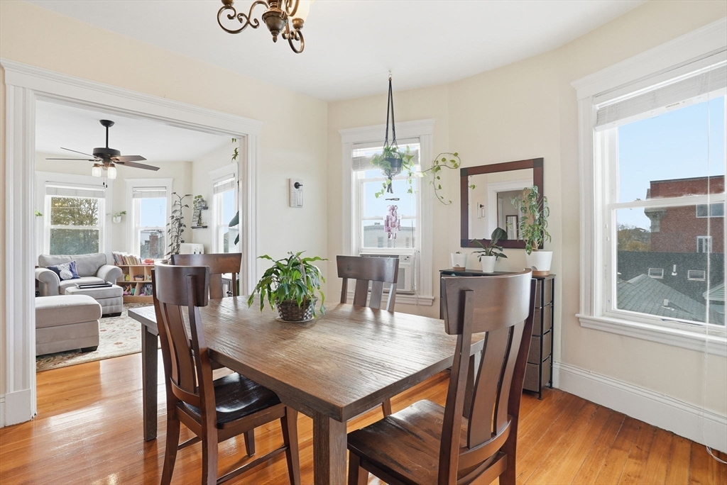 Ideally located just steps from Winthrop Beach, this spacious top-floor condo has been meticulously maintained over the years. Filled with natural light and water views, the unit feels bright and welcoming from the moment you walk in. Hardwood floors throughout, with high ceilings & large windows create an open, bright living space. The living room features charming bay windows and opens to a generous formal dining room, perfect for entertaining. The kitchen, set toward the back of the unit, features stainless steel appliances, a pantry, and a convenient laundry room with a washer & dryer included, plus access to your private back deck. Three comfortable bedrooms all with ceiling fans & closets provide space to relax & unwind or for home office potential. Enjoy your private front porch with year-round ocean views. Just minutes from local beaches, marinas, shops, and restaurants, this home is full of character with beach town vibes. Don't miss your opportunity to call this unit home!
