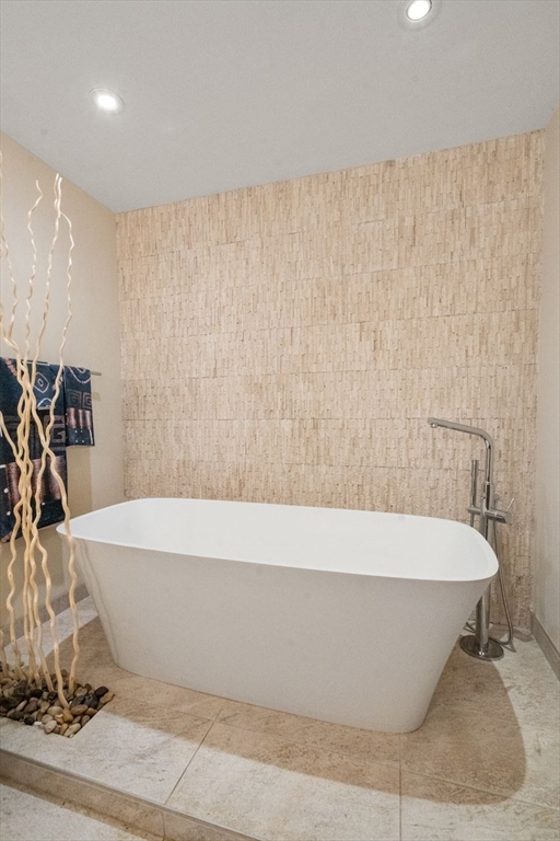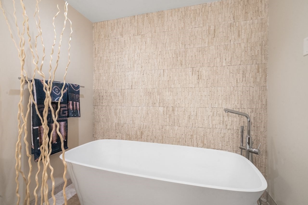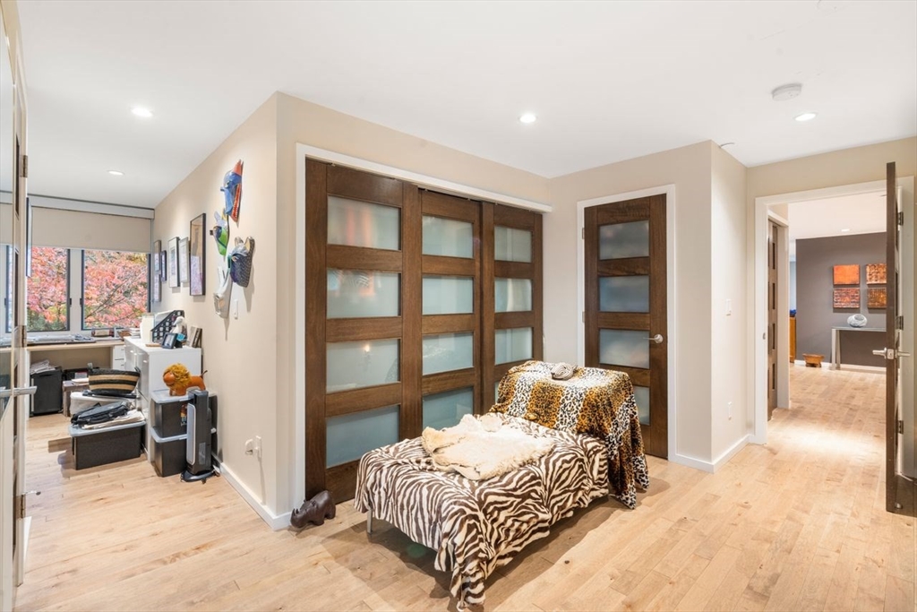 Rarely available one-level condo at Cabot Estate. Quiet back-facing unit in an elevator building with seasonal views of Jamaica Pond. Complete meticulous gut renovation with high-end finishes throughout. Features include aged maple floors, custom Italian kitchen with induction cooktop, beach-glass backsplash, and premium appliances. Expansive open dining and living area with floor-to-ceiling windows and access to private balcony. Separate media room off kitchen. Primary suite offers three custom closets and luxury bath with soaking tub, double vanity, and heated tile floors. Second bath also features heated floors. Office area overlooks beautifully landscaped grounds. New heating system, extra storage, and two garage parking spaces. Designer light fixtures and window shades included. Cabot Estate is a gated community on 23 landscaped acres offering 24-hour security, pool, tennis courts, and exercise facility. Conveniently located across from Jamaica Pond with acess to everything!