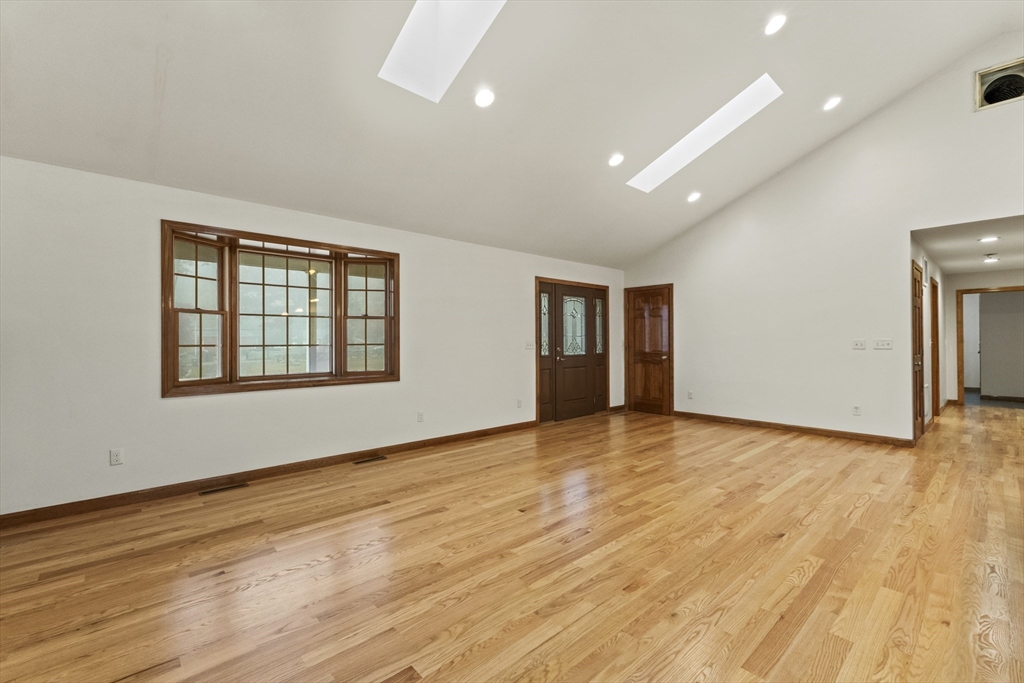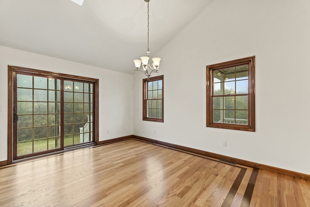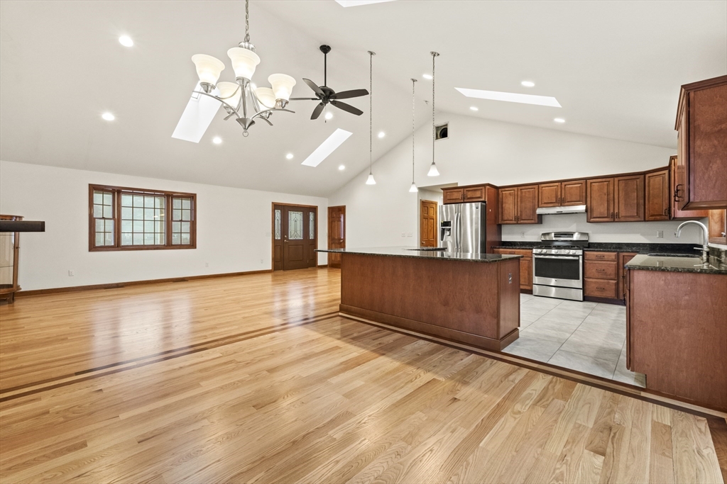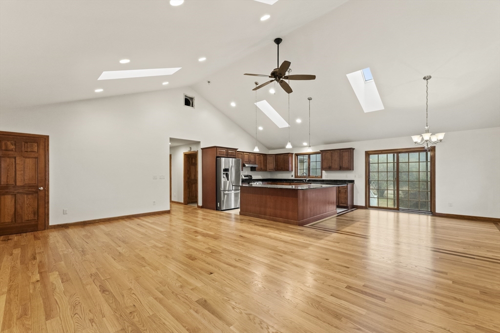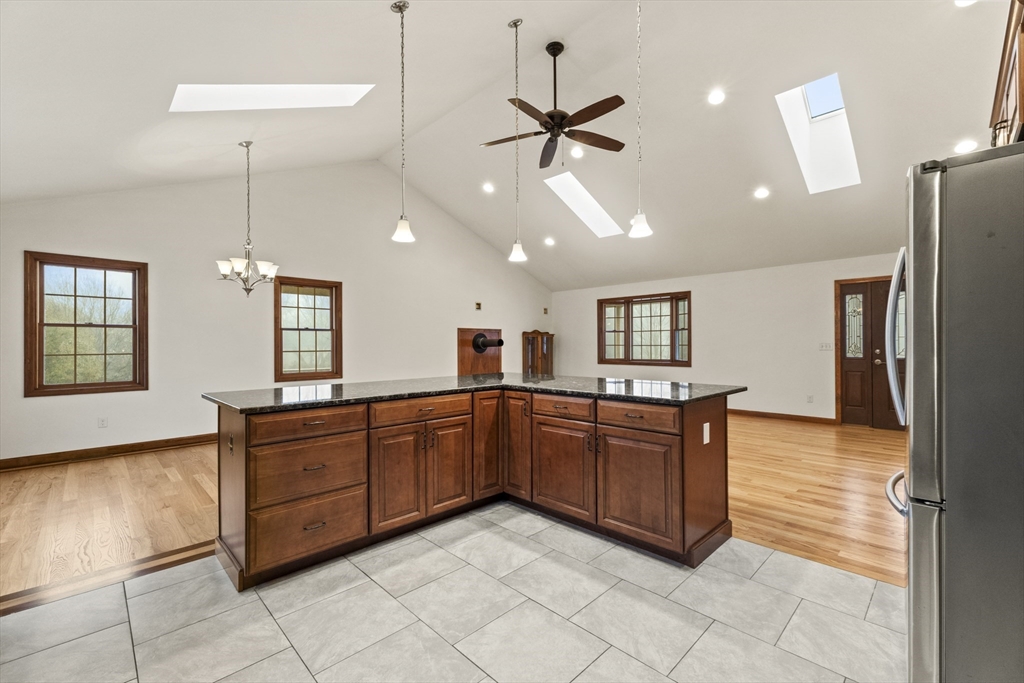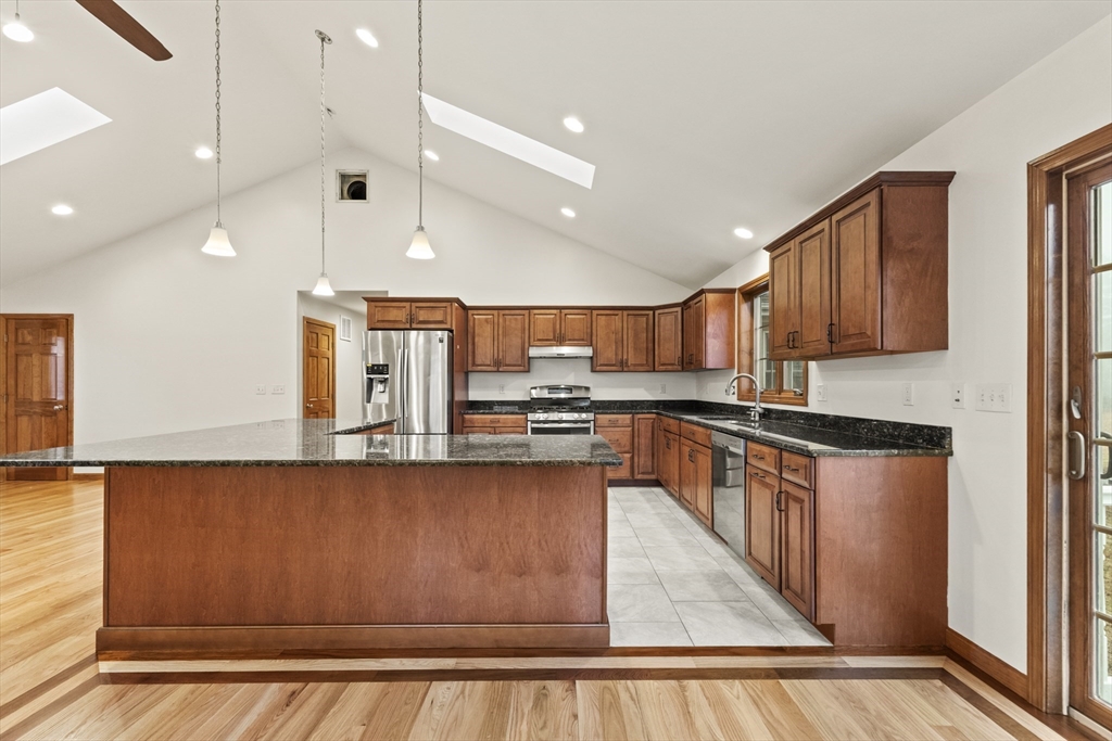 Set on over three acres of privacy, this stunning ranch blends modern comfort with timeless charm. The open-concept layout showcases cathedral ceilings, gleaming hardwood floors, and abundant natural light throughout. The gourmet kitchen offers granite countertops, upgraded cabinetry, a large island, and stainless steel appliances, seamlessly connecting to the dining and living areas for easy entertaining. The spacious main suite features hardwood flooring, recessed lighting, and a luxurious en suite with a whirlpool tub and double vanity. Enjoy quiet mornings on the porch or relax in the peaceful wooded surroundings. With a full basement, attached two-car garage, and central air, this meticulously maintained home offers the perfect balance of style, comfort, and tranquility—an ideal retreat just minutes from city conveniences.