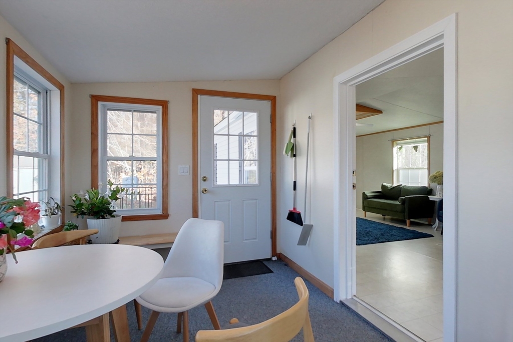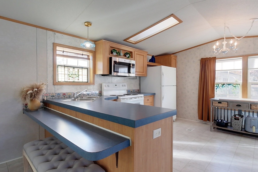 Showings begin immediately! This beautifully maintained 2-bedroom single-wide home in a desirable 55+ community offers comfort, convenience, and low-maintenance living. Built in 2003, it features central AC/heat, off-street parking, and a brand-new roof. Inside, enjoy new flooring, light fixtures, closet doors, and a 2023 heating system with newer appliances. The kitchen shines with light-toned cabinets, counter seating, and a skylight, opening to a dining area. The enclosed porch provides an additional sunny space for relaxing or dining. Down the hall, you’ll find two bedrooms (one larger) and a full bath. Outside, appreciate new landscaping, a storage shed, and a peaceful location within the community, backed by mature trees for privacy. Perfect for downsizing or embracing a simpler lifestyle!
