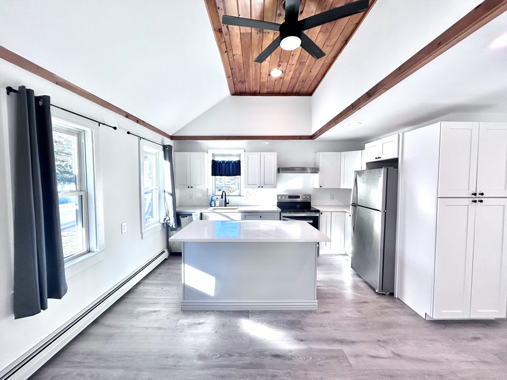 Adorable remodeled two bedroom, two bath cottage, 1.2 miles from Salisbury Beach, situated on 2.4 acres. Make this your accessory dwelling unit and build your dream house on the oversized lot!!! You will be happily surprised when you walk in the front door and see the soaring ceilings, sun filled wide open concept, making this home feel much larger than it is. This home is one level living featuring two bedrooms, primary bedroom complete with ensuite, full tiled bathroom, and laundry, a pretty new eat in kitchen with quartz counter tops, large contrasting island, and stainless appliances, large cathedral living room with modern electric fireplace and pellet stove, new floors throughout, another new 3/4 tiled bathroom, additional bedroom with outdoor access to a large back deck, overlooking the large 2.4 acre lot. Town sewer and water, walk to the beach!!