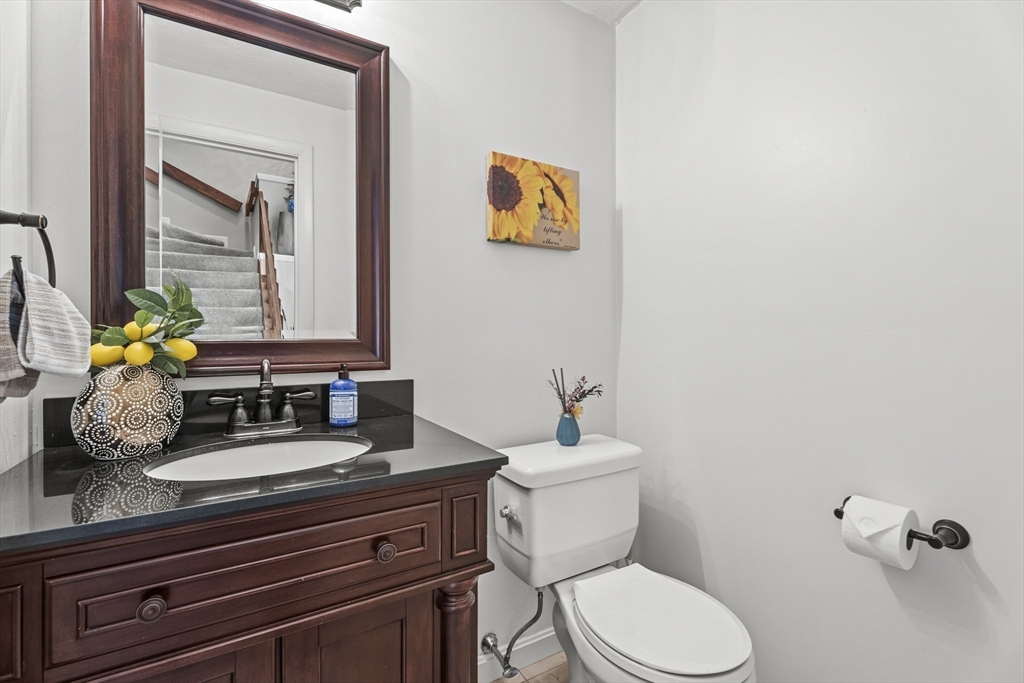 Corner-unit townhouse in desirable Chelmsford Village—over 2,500 sq. ft. of sun-filled, updated living! A bright living room with hardwood floors, fireplace, and sliders to a private composite deck set the tone. The impressive kitchen offers picture windows, granite counters, stainless appliances, an island with seating, breakfast nook, and open dining area—great for entertaining. Remote-access blinds add convenient privacy with a tap. Upstairs features a vaulted-ceiling primary suite with full bath, plus two additional bedrooms and another full bath. The finished lower level provides a large bonus room with direct two-car garage access. Enjoy central air, ample storage, and incredible community amenities including pools, tennis courts, clubhouse, and beautifully maintained grounds—all close to shopping, schools, parks, and major routes.