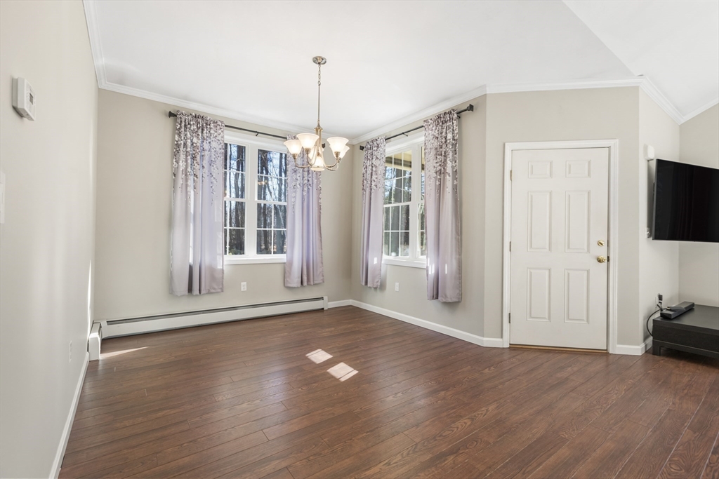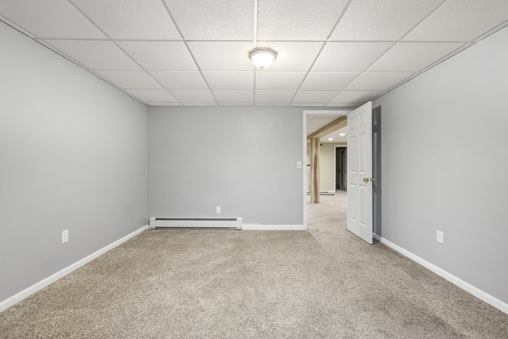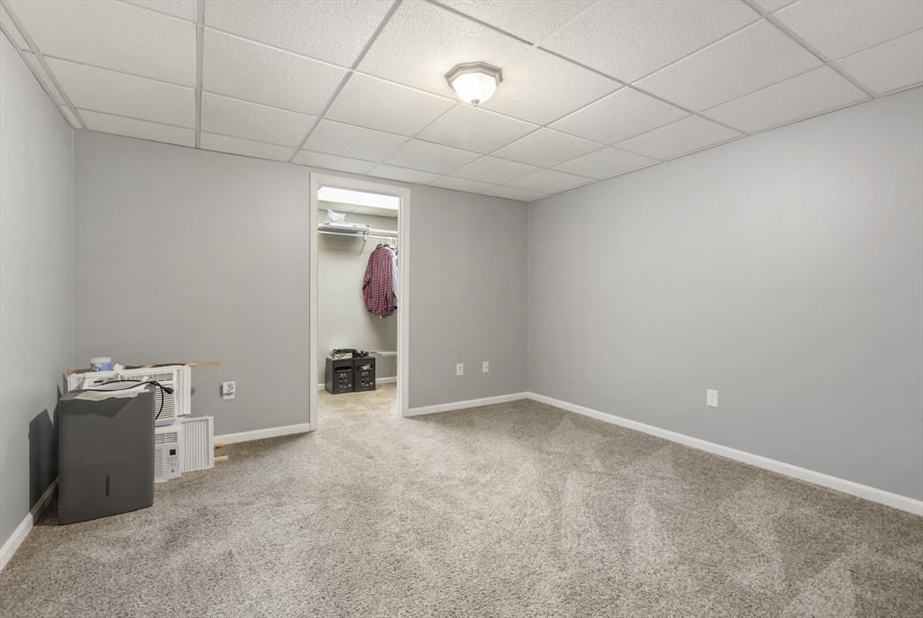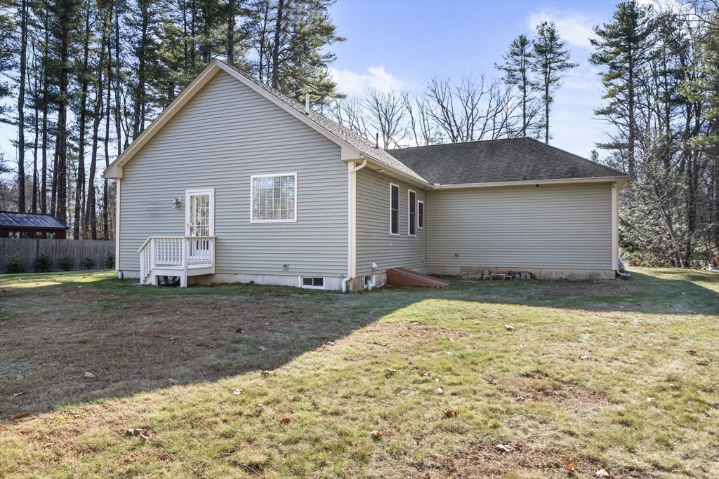 Welcome home to this meticulously maintained three-bedroom, three-bathroom, modern ranch. This open-concept home boasts of 9' ceilings throughout the one level living space. The kitchen, dining area, and vaulted ceiling living room fill with natural light from oversized windows. The primary suite features a walk-in closet and an upgraded bathroom, complete with tile and a soaking tub. The finished basement offers two additional rooms and a full bathroom, with a separate laundry room and workshop. An oversized attached garage completes this property, with 10' ceiling, 9'x8' garage doors, and direct entry to the kitchen. Active radon system 2019, well pump 2024, whole house water treatment system, gutters, and a hookup for a generator are just some of the bonus features. This home sits on over an acre of land, creating a private setting surrounded by nature, with an 8' x 10' storage shed. Easy commuting to major routes, including the Mass Pike, I-84, and Route 20.