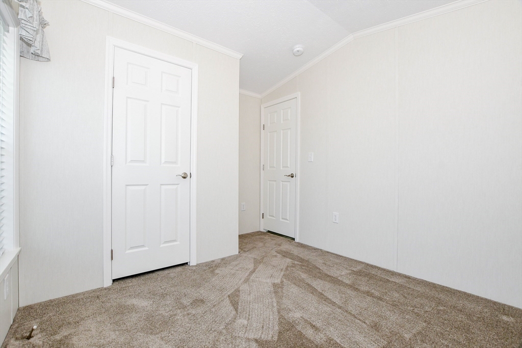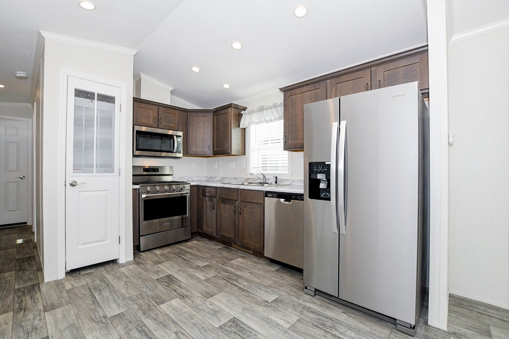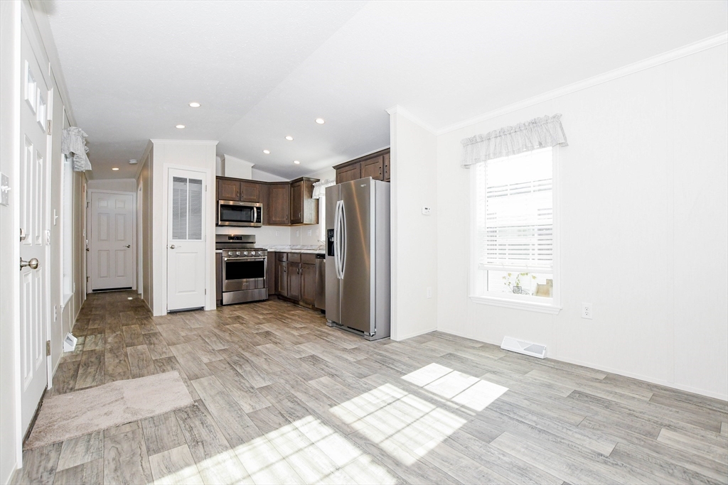 Located at 3040 Cranberry Hwy U:32, East Wareham, Garden Homes Estates East. The heart of this home is undoubtedly the kitchen, featuring shaker cabinets adorned with crown molding, creating an attractive space to craft delicious meals. Imagine preparing your favorite recipes here, with ample storage and a design that blends functionality with classic style. The bedroom is enhanced by crown molding, lending an air of refinement to your personal retreat. Picture relaxing in this comfortable setting, where the architectural detail adds a touch of sophistication to your everyday living. This property offers the convenience of a laundry room, a deck for enjoying the outdoors, and the practical benefit of a shed. The open floor plan enhances the living space, creating a welcoming atmosphere. This 624 square feet mobile home, built in 2025, offers two bedrooms and one full bathroom. The current $525 monthly fee includes, taxes, septic, water, snow removal park roads, trash, lot/land lease.