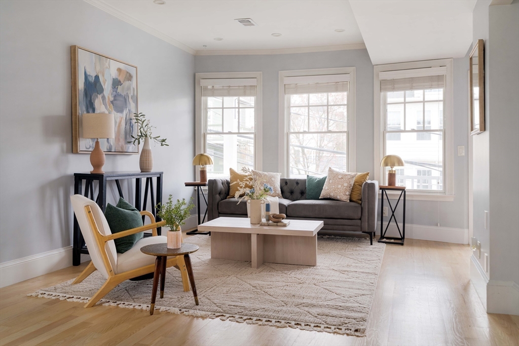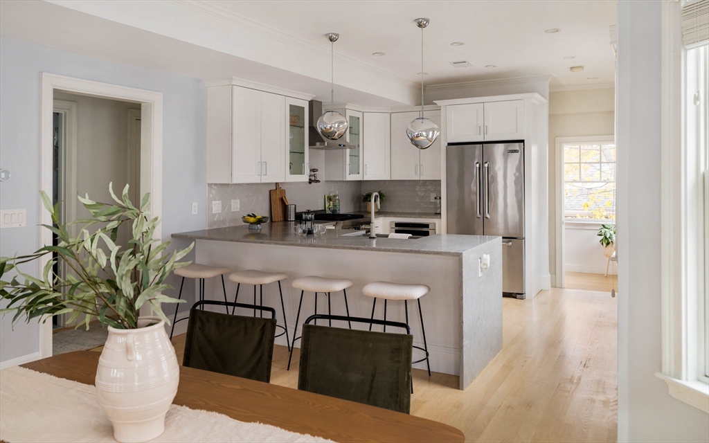 Nested in vibrant Teele Square and just a stone’s throw to Davis Square, this stunning penthouse condo offers modern design and flexible living throughout the top two floors of this well-maintained building. Featuring 3 bedrooms, a home office, 2 baths, and 2 bonus spaces, the home impresses with high ceilings, crown moldings, beautiful hardwood floors, and abundant natural light. The open concept living and dining areas flow into a sleek kitchen with quartz countertops, including a waterfall edge, plentiful cabinets, and JennAir stainless steel appliances. Enjoy your morning coffee on the private front deck or relax in the shared backyard. The primary suite offers generous closet space and a well-appointed marble bath. Additional amenities include central air controlled by Nest thermostats, in-unit laundry, and an unbeatable location near shops, restaurants, parks, and the Red and Green line MBTA stops. This one won’t last!