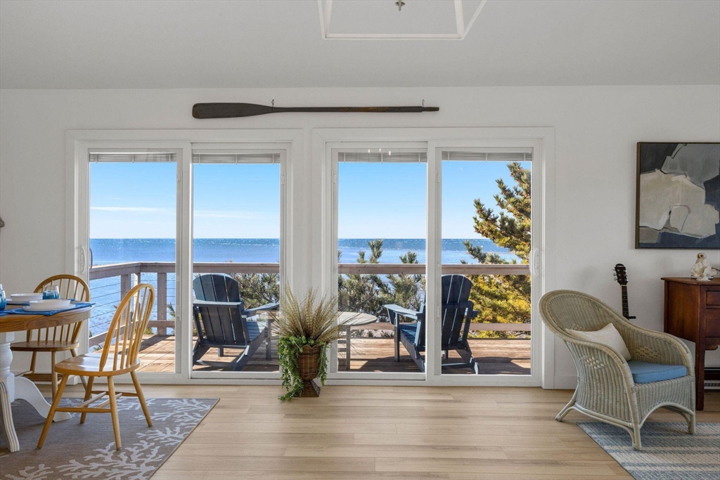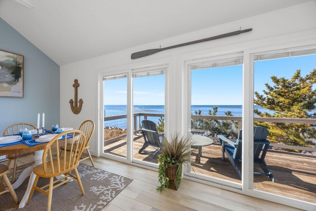 WATERFRONT CAPE COD BAY- located in the highly desired Saltworks area of Eastham this 3 bedroom, 1.5 bath beach house is direct waterfront with a beautiful sandy beach and sunsets that never get old facing west. The three level floor plan offers an open floor plan on the main level with cathedral ceiling with beams, multi glass sliders that allow access to a wraparound cedar deck for enjoying the views with a feel of connection to nature. The middle level offers a half bath, laundry area, a tuck away play area for kids. The lower level offers a full bath, three bedrooms, two of which have exceptional views outward over Cape Cod Bay. A detached two car garage offers plenty of room for water toys and cars. The property has a feel of having a large lot. The property has had numerous upgrades, roof, windows, town water, septic, floors, bathrooms, upgraded revetment with custom stairs, and more! Possible mooring in front of your beach house, and potential of buying turnkey.