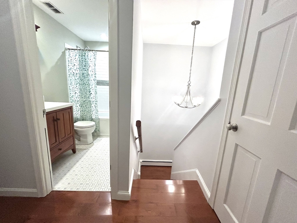 Nothing to do but move in! Tucked away, with woodland views in the front AND back of the unit, this meticulously maintained, 2 bedrm townhouse is chock full of updates & lovely finishes, including 2 full baths w/ tile-surround showers, both in sea glass tones. The front-to-back living/dining room combination is light & bright with a newer over-sized slider, along with newer windows & beautiful laminate floors throughout the house. The updated kitchen features tile flrs, granite counters, stainless appliances & styllish floor to ceiling cabinets w/ pull out drawers-room for everything! The dutch-door leads to a private, fenced-in patio with room for entertaining & gardening. This unit features 3 minisplits for cooling & heating, as well as baseboard heat by h2O, gas heating system & h2O tank was replaced, as well! Brand new over-sized washer & dryer & updated electrical in the basement storage room, as well as 430 sq ft of finished bonus space! A real gem!