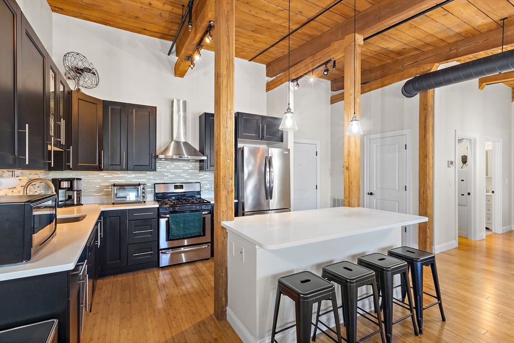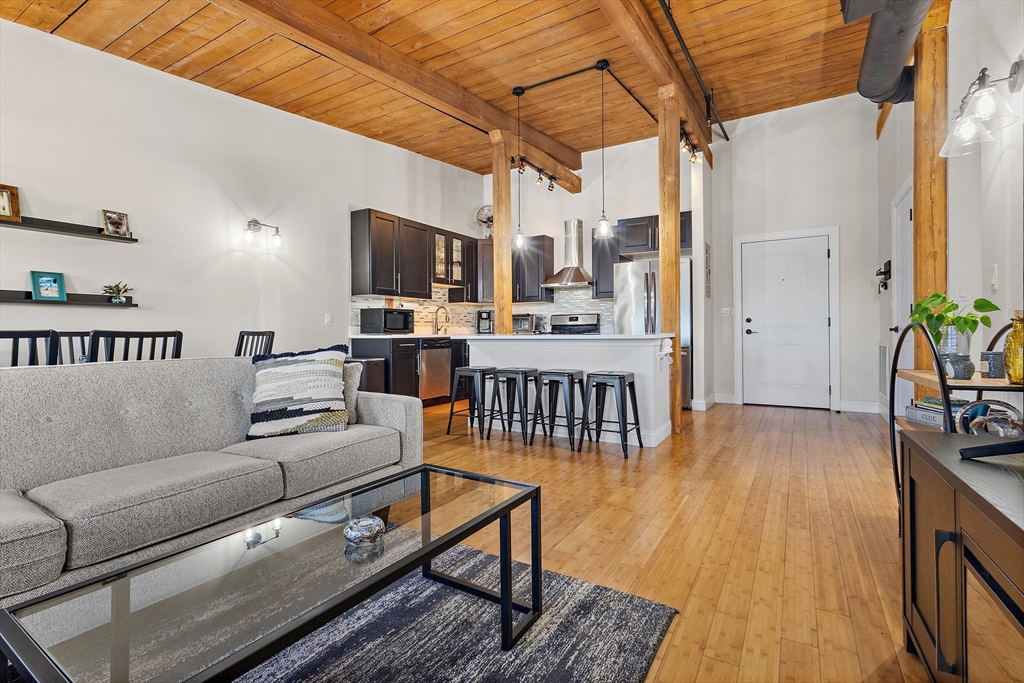 Historic charm combined with the modern luxuries of today in this stunning condo in sought after Howe Shoe Factory Condominiums! Sunfilled, open and airy floor plan which boasts state of the art kitchen with s/s appliances, center island, quartz countertops and cabinet space galore. This dynamite kitchen opens to living room and dining room with 9ft vaulted wood ceilings and bamboo wood flooring. Your primary suite is large enough to include a sitting area complete with walk in closet and en-suite bath. Both bedrooms with soaring wood ceilings and bamboo wood flooring. Gorgeous baths with tub/shower, tile surround and tile flooring. Laundry in unit stackable washer/dryer stay. 75 sq ft storage room on lower level. Minutes to highway, downtown and the Apex Center! This top unit penthouse is a real creampuff.