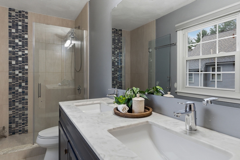 Tucked away on a quiet. cul-de-sac in a beloved Bedford neighborhood, you will find this smart and stylish home! Step inside to find stunning soaring ceilings and sunlight pouring in! The inviting living room is the perfect place to gather for the big game, while the adjacent dining room, with a striking accent wall and vaulted ceilings, will be home to memorable meals. The heart of the home is the beautifully updated kitchen with on-point painted cabinets, newer stainless steel appliances, and granite countertops. Enjoy cozy mornings in the breakfast nook or head out to the paver patio to have your coffee. Upstairs, you'll find three bedrooms, including the primary bedroom with an updated bathroom. There are two additional bedrooms (all with hardwood floors) and another updated bathroom. When summer returns, enjoy the front porch and paver patio out back! The practical side of you will appreciate the 2 car garage, efficient gas heat, and central air. Welcome home!!