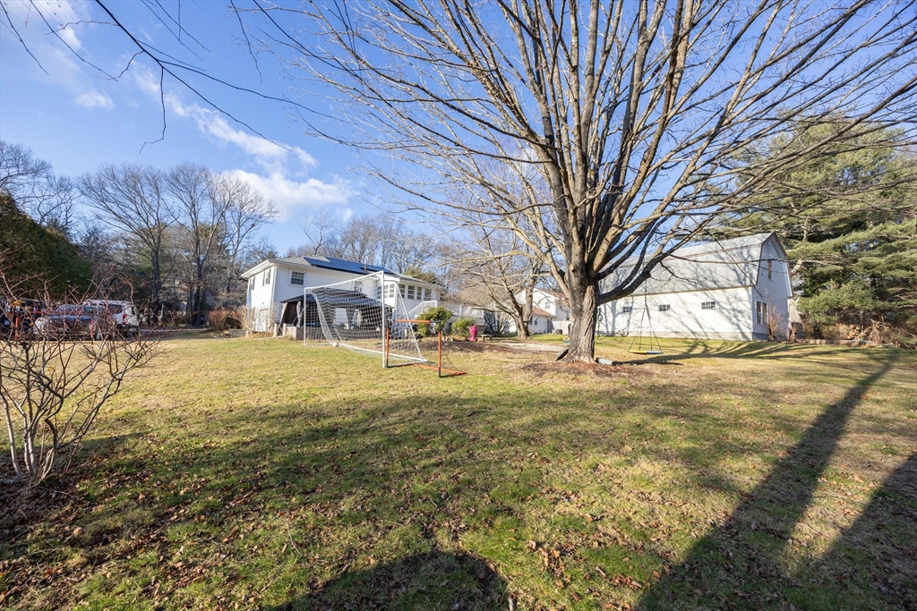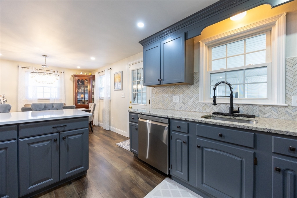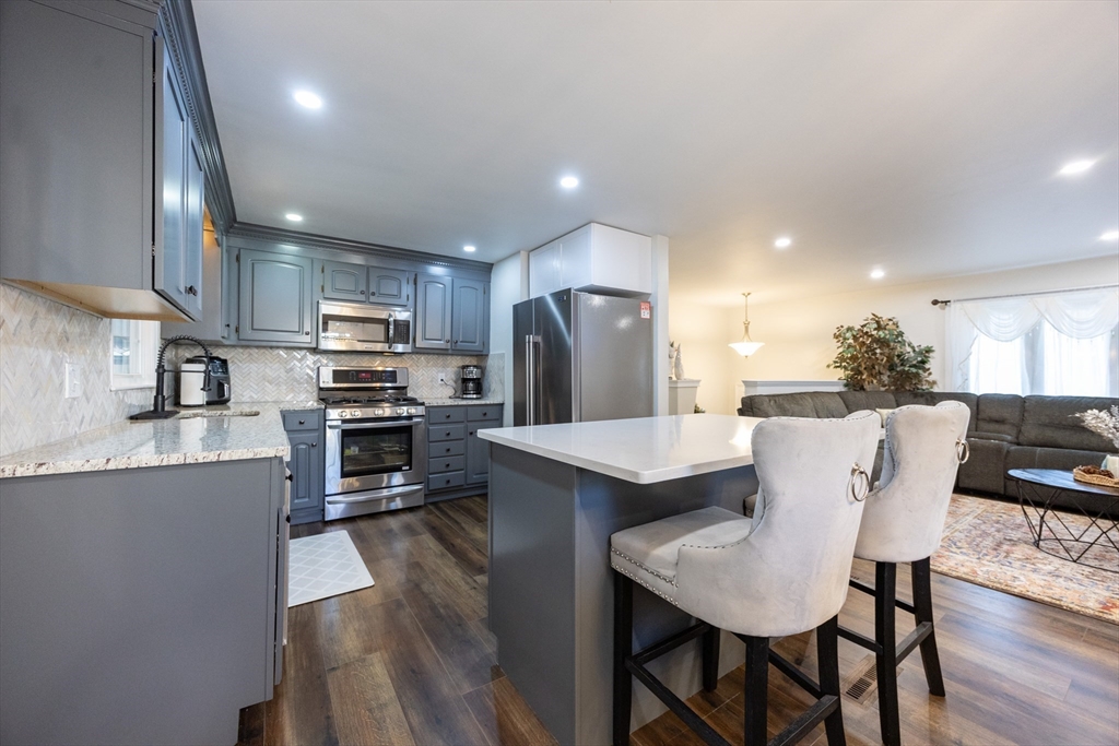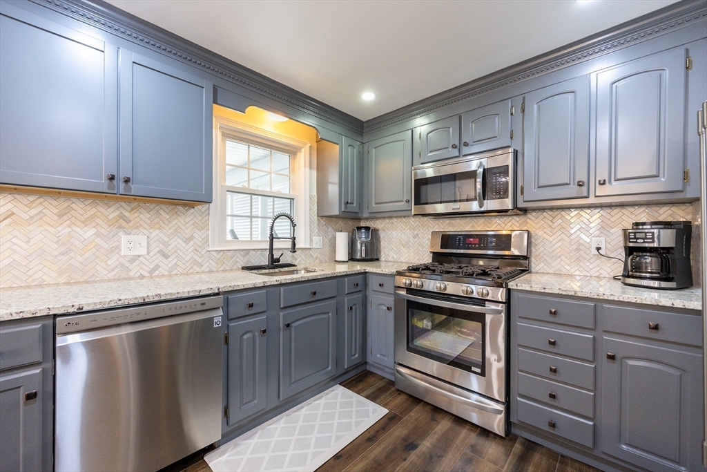 This beautifully renovated home blends modern style with everyday comfort on a 0.85-acre lot in a highly sought-after neighborhood. Large windows fill the home with natural light and offer scenic views of the expansive yard. The thoughtfully designed kitchen features light-blue cabinetry, quartz countertops, beautiful backsplash, and energy-efficient stainless-steel appliances, opening seamlessly to the dining area and a generous living/family room with a cozy wood-burning fireplace. The main level includes a spacious primary bedroom, two additional bedrooms, and a full bath. The finished walk-out lower level adds valuable living space with a game room, guest bedroom, gym, Laundry and another full bath. Enjoy an enclosed porch and spacious composite deck, Outside a huge flat backyard, a large shed, and a charming enclosed stone patio perfect for gatherings or relaxing. Move-in ready, this home offers exceptional updates, space, and style.