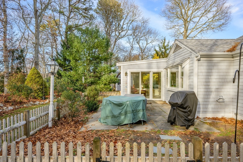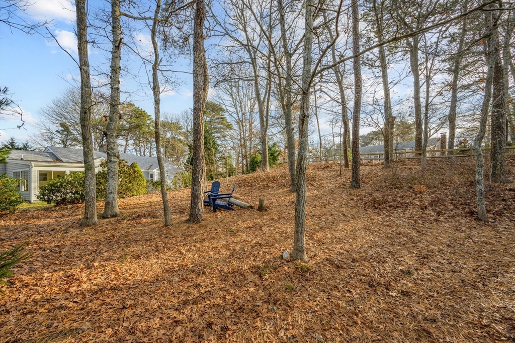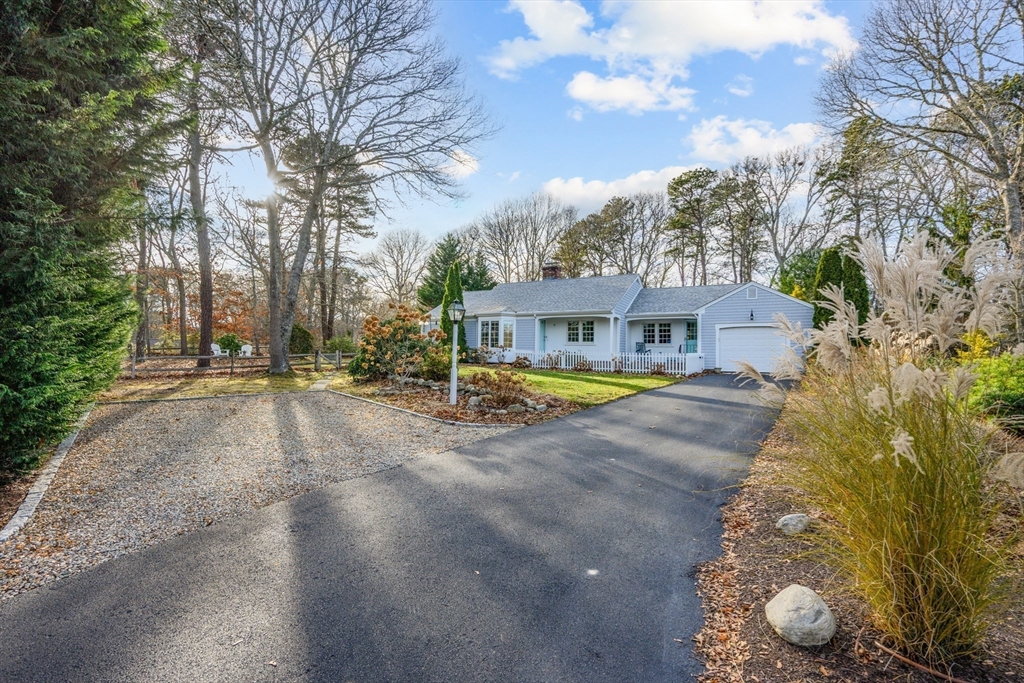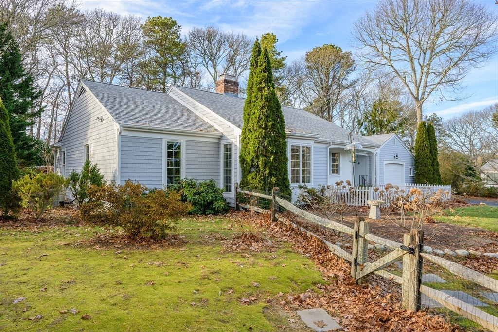 This cheerful ranch is set on a private lot at the top of a knoll graced by a mix of trees, lawn, and perennial gardens that bloom from spring thru fall! A pristine home with multiple living spaces, including a 3-season sunroom! In the living room, enjoy a gas fireplace, large bay window, and a formal dining area. In the family room--built-ins and a huge picture window offering a view to the patio and trees behind. The kitchen is updated with a double oven and a hidden laundry area. Enjoy 1-floor living with 2 spacious bedrooms--1 is a primary suite with a renovated, private bath featuring a walk-in shower and radiant heat! Plus hardwood floors thru-out, newer windows, a 1-car garage, a huge fenced-in area, a shed, and a vast unfinished basement. Equipped with gas hot air heat, central AC, on-demand water heater, and a well-maintained exterior. This home is a smart investment for those seeking comfort and charm in a picturesque Cape village. See video! Buyers/agents to confirm details.