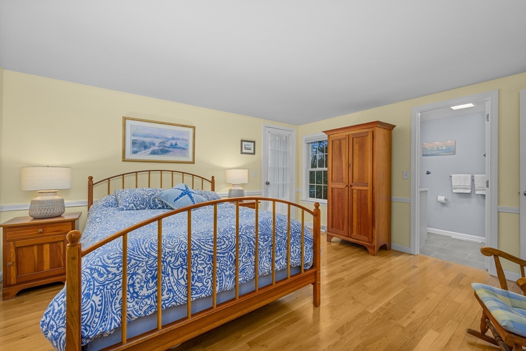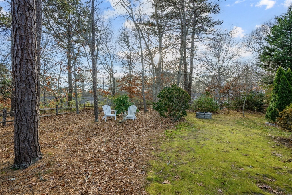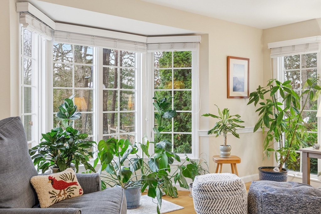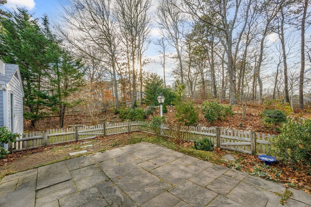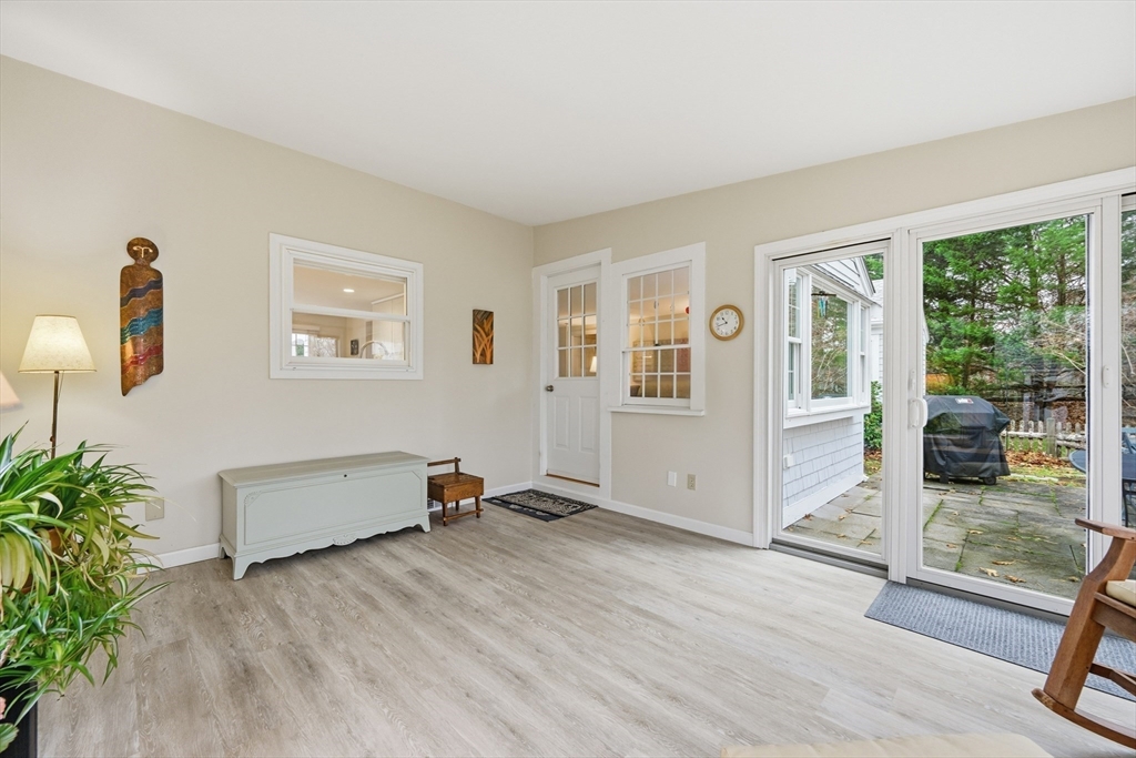 This cheerful ranch is set on a private lot at the top of a knoll graced by a mix of trees, lawn, and perennial gardens that bloom from spring thru fall! A pristine home with multiple living spaces, including a 3-season sunroom! In the living room, enjoy a gas fireplace, large bay window, and a formal dining area. In the family room--built-ins and a huge picture window offering a view to the patio and trees behind. The kitchen is updated with a double oven and a hidden laundry area. Enjoy 1-floor living with 2 spacious bedrooms--1 is a primary suite with a renovated, private bath featuring a walk-in shower and radiant heat! Plus hardwood floors thru-out, newer windows, a 1-car garage, a huge fenced-in area, a shed, and a vast unfinished basement. Equipped with gas hot air heat, central AC, on-demand water heater, and a well-maintained exterior. This home is a smart investment for those seeking comfort and charm in a picturesque Cape village. See video! Buyers/agents to confirm details.