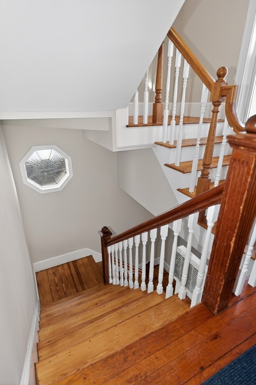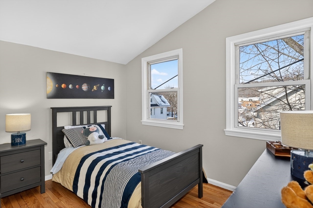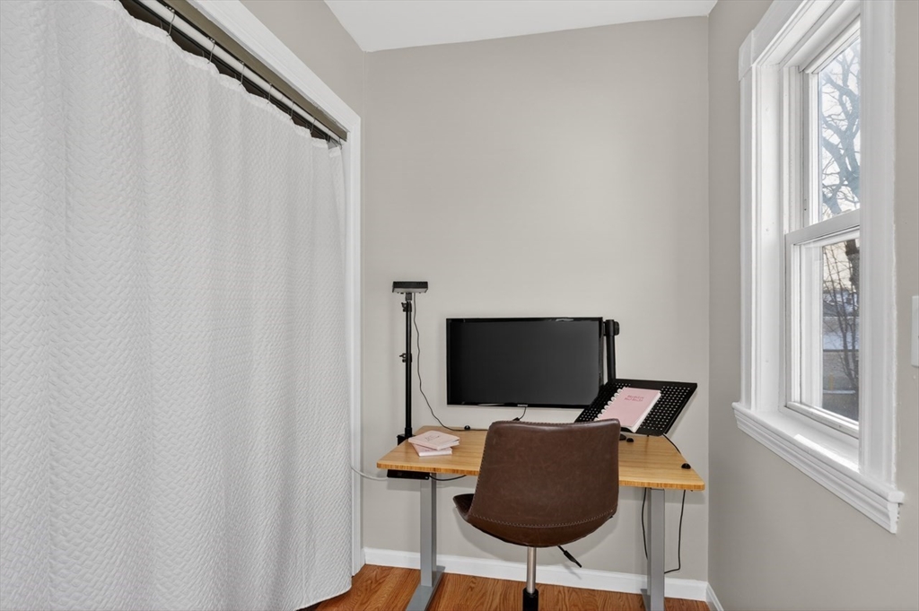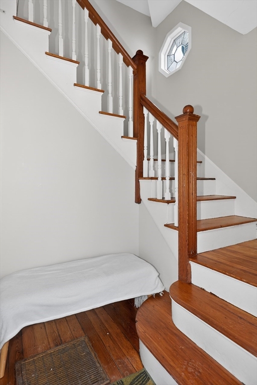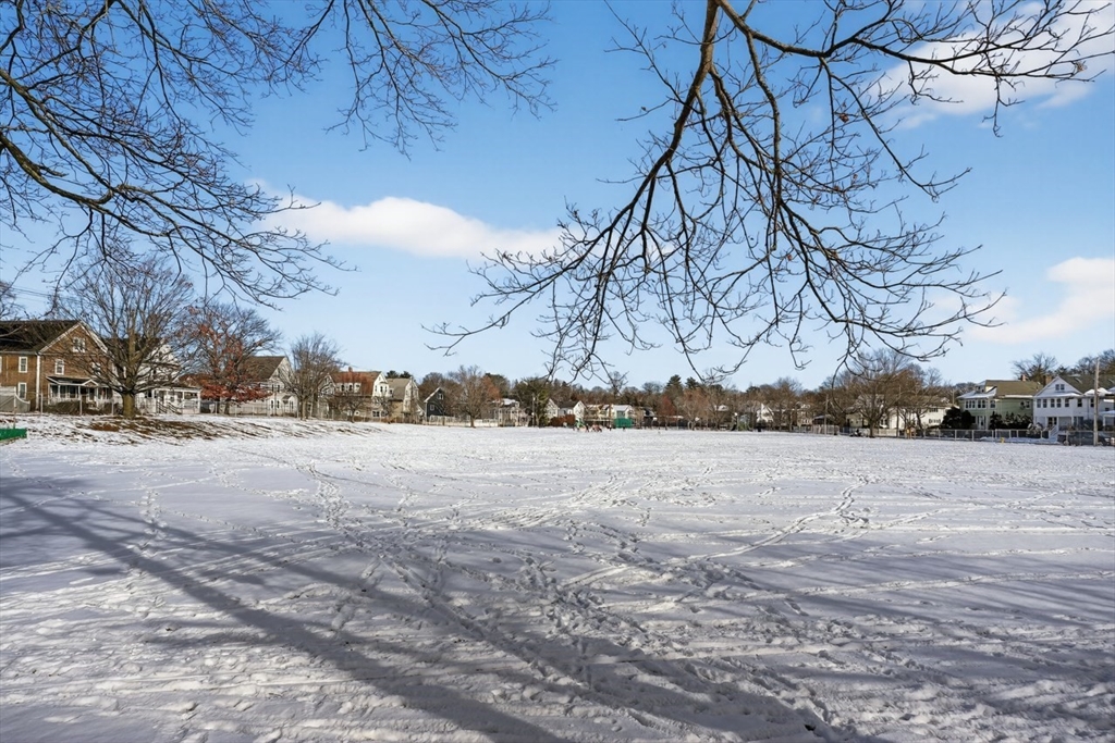 New Year? New House! This gorgeous 4 bed 2 bath 2nd and 3rd flr condo with family room, office nooks, and mudroom is on a dead end street. You enter into a grand living/dining room open floor plan with stunning decorative columns, fireplace, bay windows, and glorious high ceilings. The eat-in kitchen has granite counters, SS appliances, gas cooking & loads of cabinet storage as well as a balcony for outdoor dining. On this level there's also a family room/office as well as two bedrooms. The 3rd floor has a grand primary with cathedral ceilings, skylight, gorgeous huge windows and 2 closets. There's also another bedroom, bathroom w/ shower stall and laundry on this level. Fresh paint and floors refinished. Basement used as an exercise room also has abundant storage. Blown hot air gas heat. This property is located close to public transportation (train/bus) adjacent to park/playground, Senior Ctr, & close to shops, market, dining, florist, cafes, wine/cheese shop, daycares and schools.