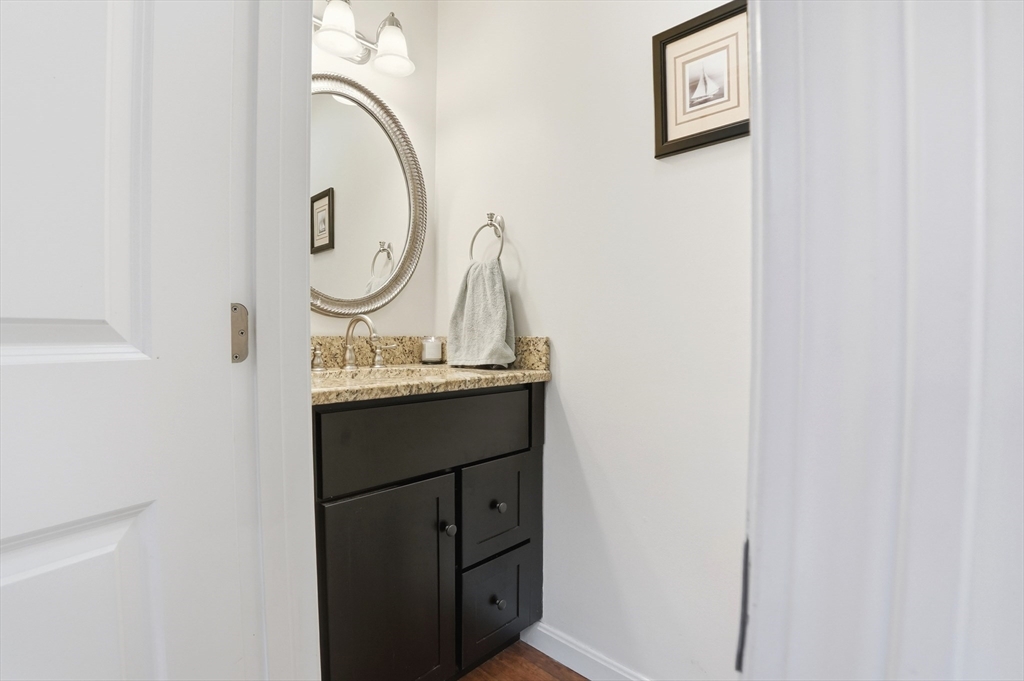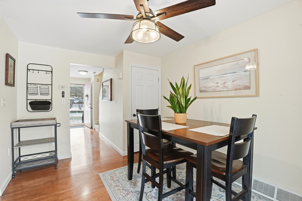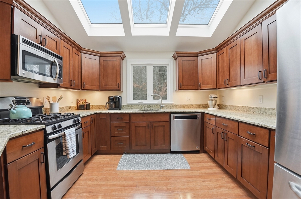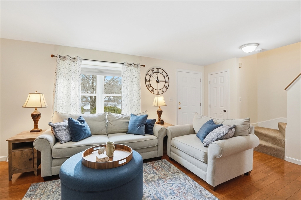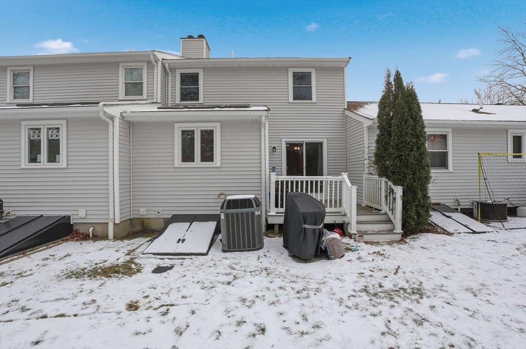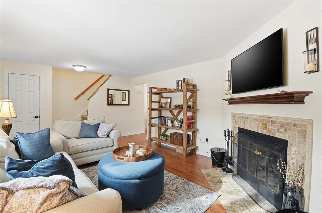 Welcome home to this 2 bedroom townhouse offering the perfect blend of warmth and modern updates. Step inside to a sun-filled living room with gleaming floors and a cozy wood-burning fireplace. The open-concept kitchen and dining area is ideal for everyday living and entertaining, featuring granite countertops, stainless steel appliances, peninsula seating for three, skylights, exposed wood beams & a pantry. A slider leads to the back deck and spacious shared yard. Upstairs, you'll find a large primary bedroom with two closets and direct full bath access. A second generously sized bedroom completes this floor. The finished basement provides flexible living space with built-ins, recessed lighting, a game area, laundry + storage, and bulkhead access. Major updates: (2025) vinyl siding, upstairs windows, front steps & bulkhead (2024) new roof. Easy Highway access and close proximity to the Xfinity Center & Wheaton College.