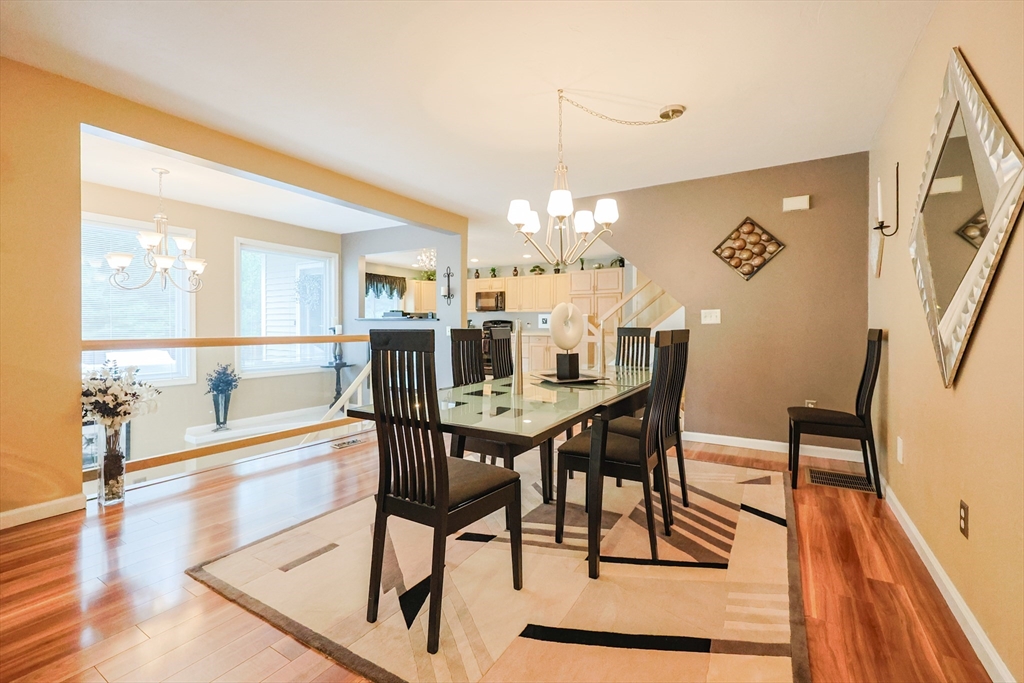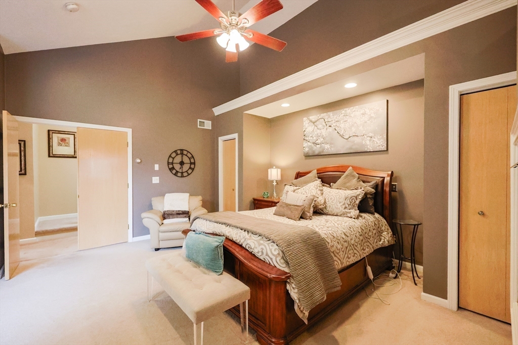 Step into this elegantly designed townhome and feel immediately at home. Ascend the curved staircase to the open main level, where dramatic windows fill the space with natural light. The living and dining areas connect beautifully, centered around a warm gas fireplace—perfect for today’s casual lifestyle. The kitchen features generous cabinetry, gas cooking, and a custom breakfast bar overlooking the yard. Upstairs, the expansive primary suite offers soaring ceilings, a sunny sitting area, a dual-sided gas fireplace shared with the luxurious en-suite bath, and generous closets. A spacious second bedroom includes its own bath, cathedral ceiling, and ceiling fan. The versatile loft is ideal for an office or hobby space. The finished lower-level family room opens to the yard through sliding glass doors.