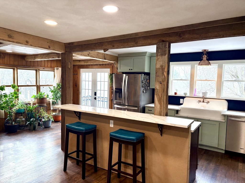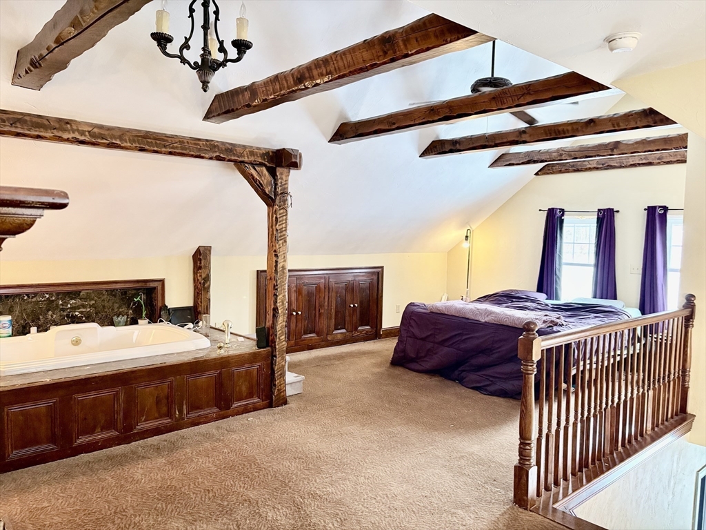 Welcome to this beautifully updated antique home offering timeless charm and modern comfort. Enjoy classic curb appeal, freshly painted exterior, and attractive landscaping. The updated kitchen features an island, granite counters, ceramic sink, and new appliances, opening to a spacious sitting and dining area with exposed beams, new vinyl flooring, recessed lighting, and fresh paint. The first floor includes a bedroom option, brand-new tiled bath, and a large mudroom with first-floor laundry and space for custom storage. Upstairs is an impressive primary suite with gas fireplace, jacuzzi tub, double vanity, glass block shower, and custom walk-in closet. Flexible living areas could accommodate a third bedroom. Full walkout basement, one-car garage with workshop and oversized storage above. Potential for ADU or in-law setup subject to buyer due diligence, zoning, and permitting. Walk to town location with easy access to Route 495.