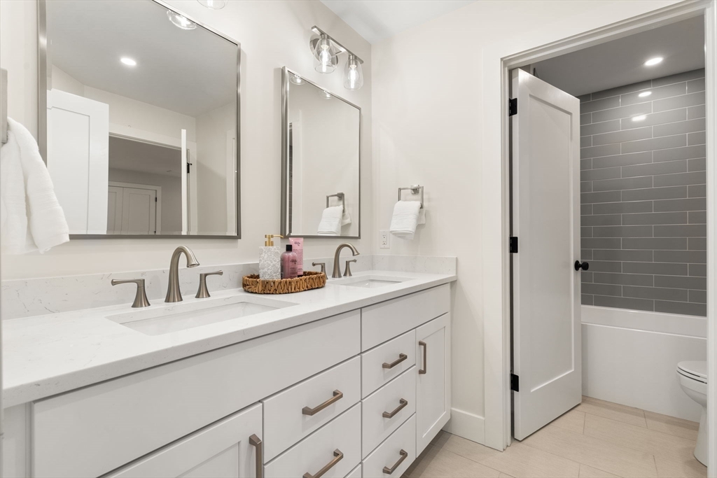 Elegantly crafted NEW CONSTRUCTION designed for today’s living, this townhouse-style home offers 3 bedrooms, 3.5 baths, and a 2-car garage w/custom finishes and a flexible open floor plan ideal for everyday living & entertaining. The main level features a high-end kitchen w/quartz counters & backsplash, painted cabinetry & gorgeous cashew-stained island w/beverage center, Thermador SS appliances, gas range, and built-in microwave. The kitchen opens to a sun-filled family room with gas fireplace, quartz surround, custom mantel, detailed wall molding, high ceilings, recessed lighting & hardwood floors throughout. The primary suite includes a spa-like bath with soaking tub, separate vanities, makeup vanity with lighted mirror, and custom closet. The finished LL offers two finished rooms, a full bath & vinyl plank flooring. Laundry room w/cabinetry w/quartz counters. Black matte hardware throughout, abundant natural light, rare large backyard, easy highway access complete this a MUST SEE!