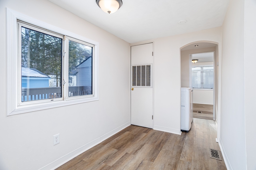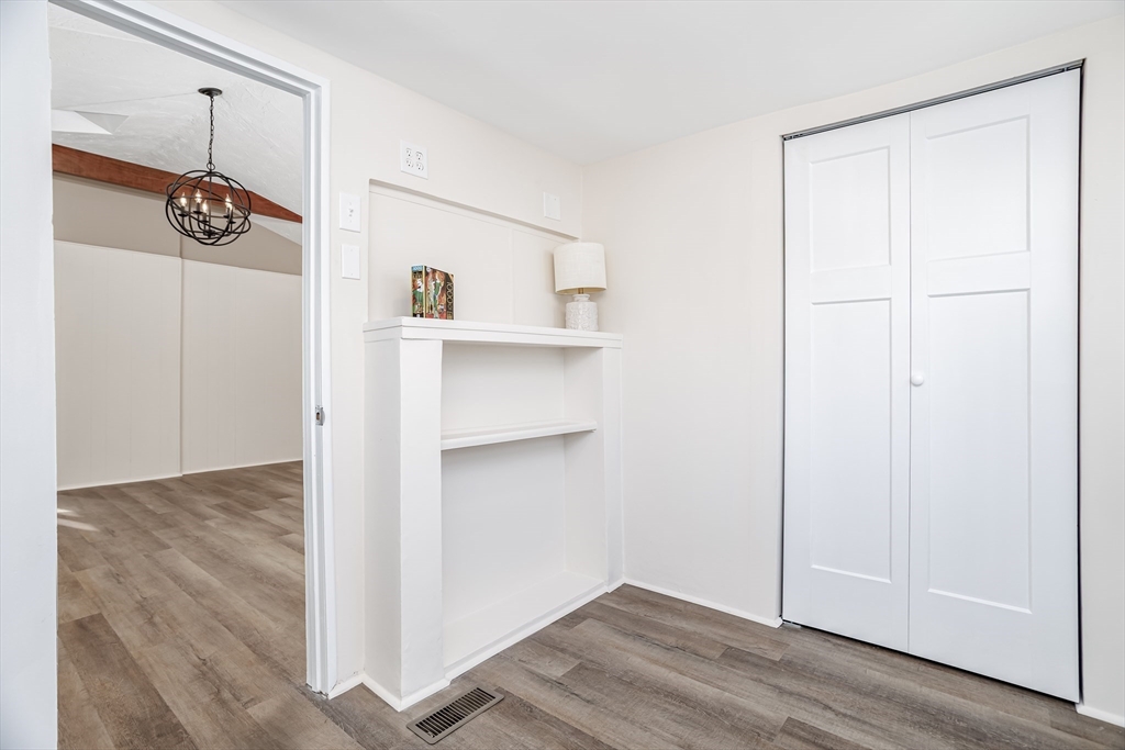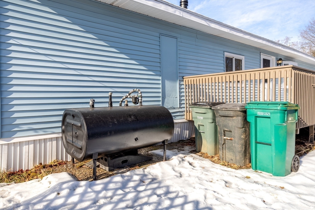 Welcome to single-level living in Pepperell within an all-ages, pet-friendly community. This manufactured home offers new vinyl plank flooring throughout, new appliances including washer and dryer, a recently installed water heater, and a newer roof. The open living area features a vaulted ceiling with decorative beam detail and skylights, creating a bright, spacious feel. A pellet stove provides an additional heating source and may be used as the primary heat if desired. The home includes two bedrooms - a primary bedroom and a second room - well suited for a home office, guest room, or flexible living space. Step outside to enjoy your private deck and take advantage of the storage shed for all your extras. The park fee covers water, sewer, trash, snow removal, and property taxes, making this a low-maintenance, budget-friendly way to own. A new blank canvas, ready for your touch.