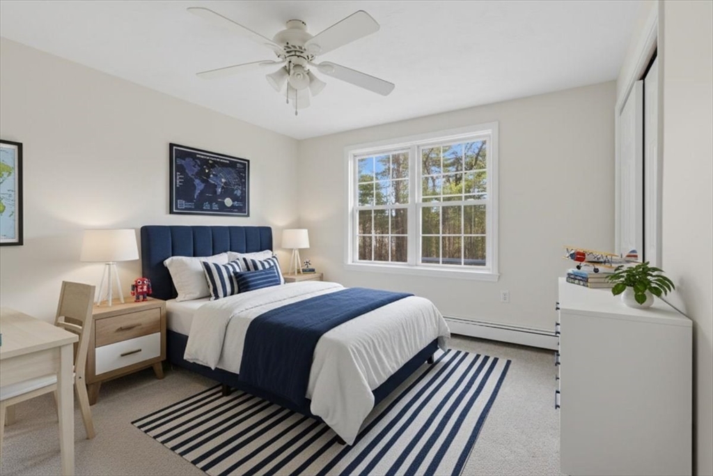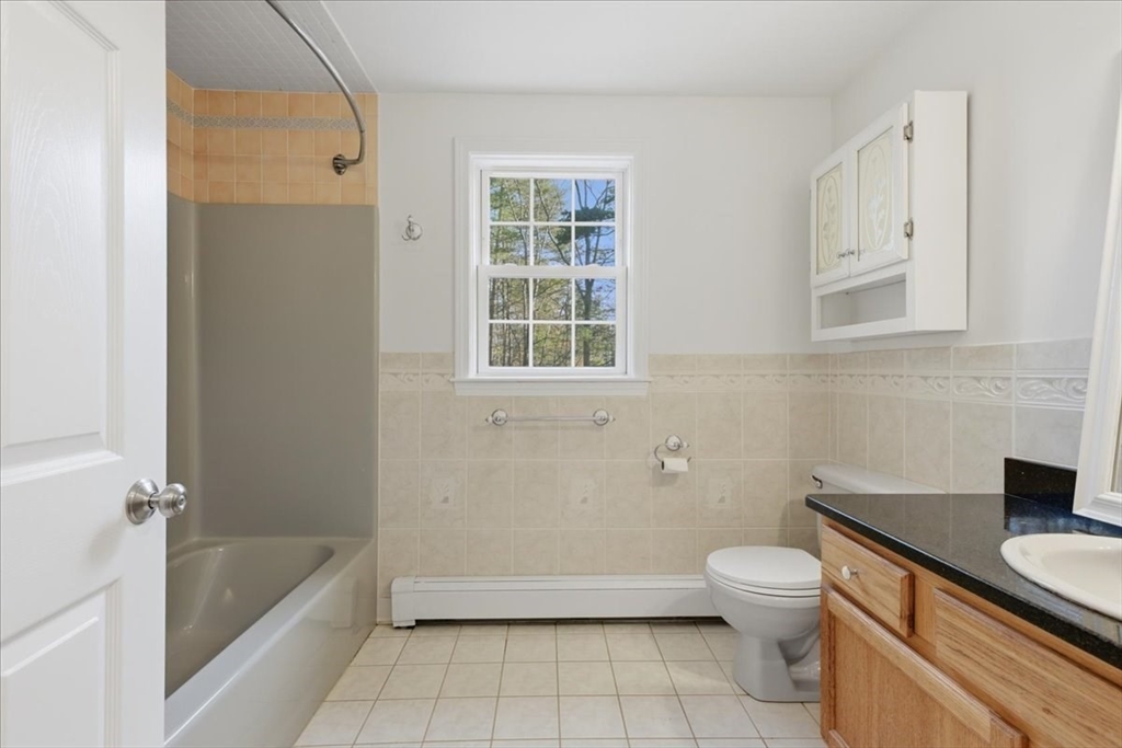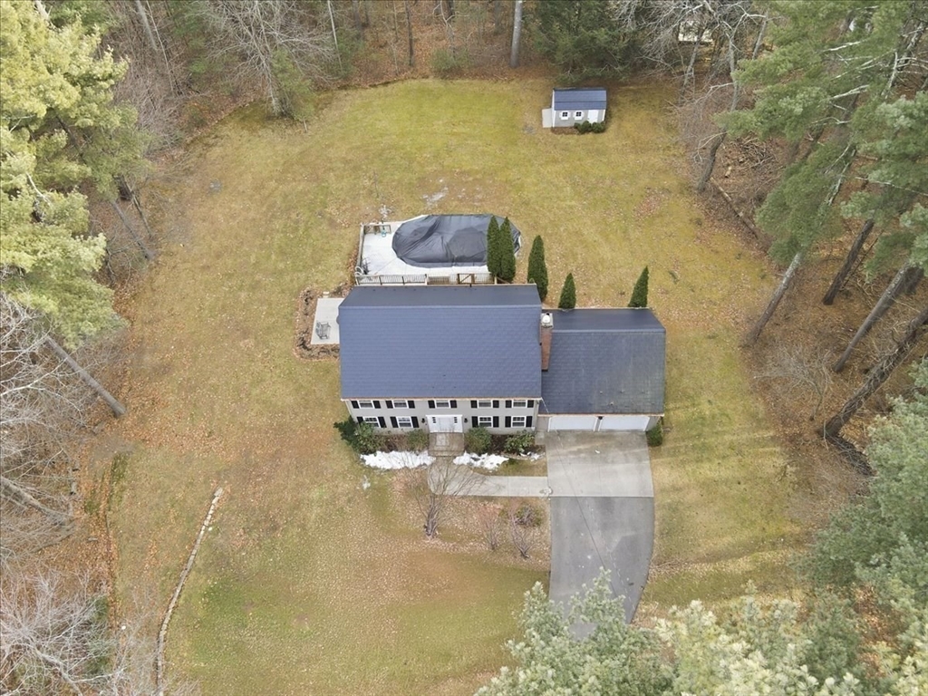 Built in 1999, this beautifully maintained 8-room, 3-bedroom, 2.5-bath Colonial is set on over an acre of level land in a tranquil, wooded setting Near Box Pond. Newer long lasting composite roof. Brand new septic. Attached two-car garage. Updates include a freshly painted interior, brand new vinyl flooring and carpet, formal living and dining room with refinished hardwood flooring with a cozy fire-placed family room. 1st floor half-bath with laundry enhances functionality. The modern oak cabinet eat-in kitchen features granite countertops and s/s appliances. Slider to backyard is ideal for entertaining, featuring a walk-out deck leading to an above-ground pool and hot tub. Awesome yard w/shed. The finished basement offers flexible living space and includes a wet-bar. Upstairs, you will find a spacious primary suite with a soaring vaulted ceiling, walk-in closet, and private bath, as well as 2 more generously sized beds and a 2nd full bath. Easy access to Train and 495. Welcome home!