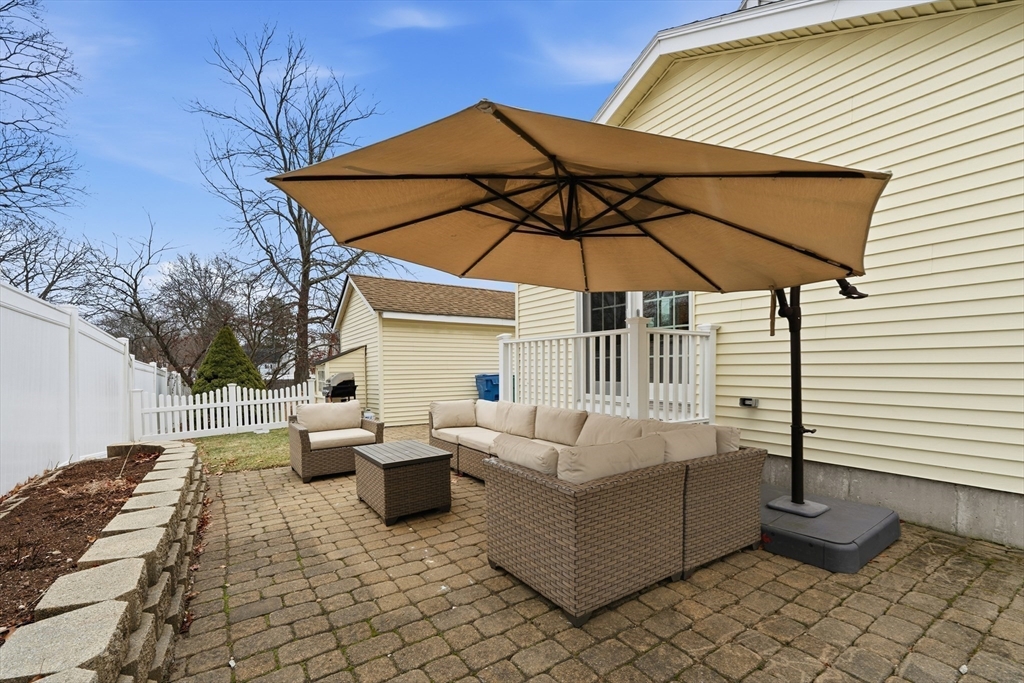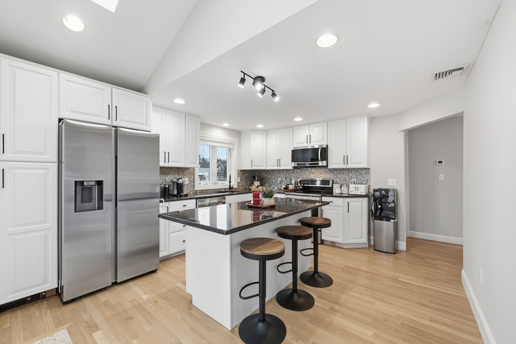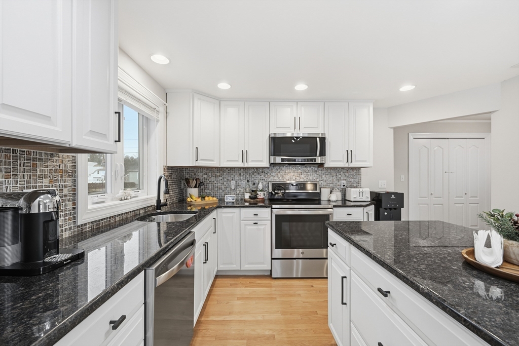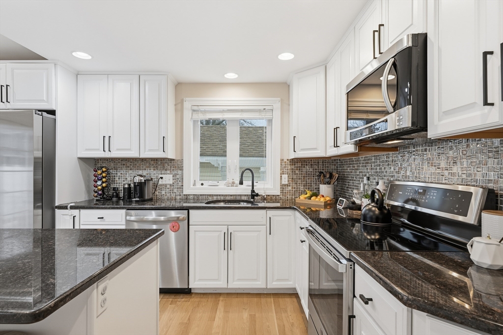 Welcome to this truly sweet and meticulously maintained home, tucked away on a beautiful, quiet residential street in the desirable River Pines area of Billerica. Set on a generous lot with lovely landscaping, this home offers an easy, inviting layout and thoughtful updates throughout. The newer modern kitchen is a standout, featuring skylights, granite countertops, abundant cabinetry, a large island, and a charming diner-style seating area, with direct access to the deck, stone patio, and expansive yard—perfect for entertaining or relaxing outdoors. The home includes two updated, tiled full baths and conveniently located laundry just steps from the bedrooms. The large, heated basement is partially finished and offers great potential for a family room, guest suite, gym, or home office. Additional highlights include central air, a spacious driveway, and a detached one-car garage. A wonderful opportunity to enjoy comfort, space, and a peaceful neighborhood setting.