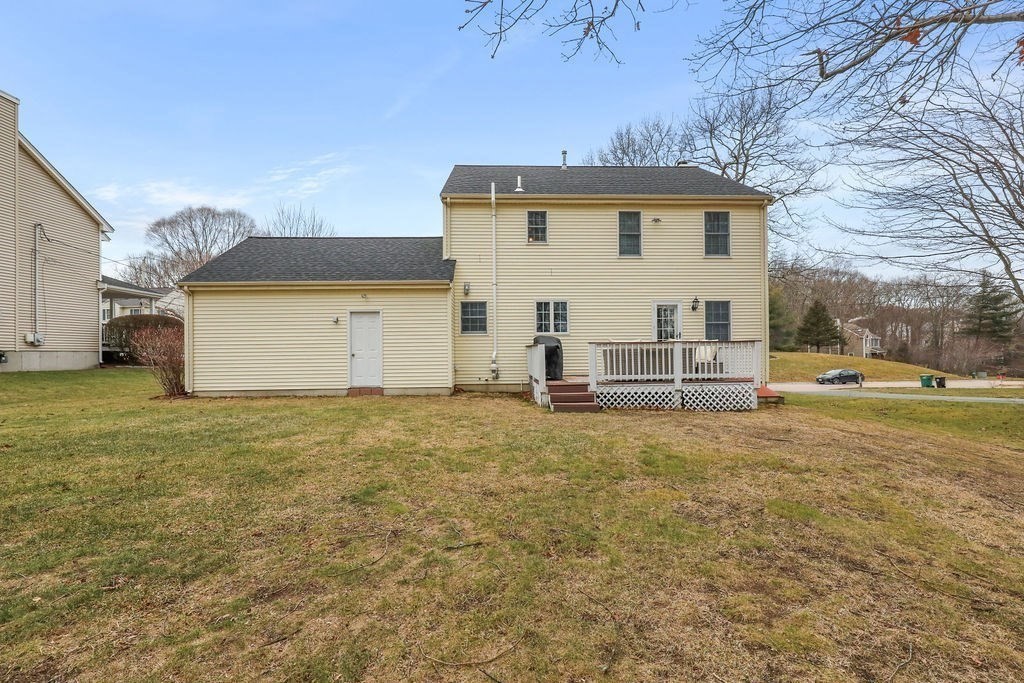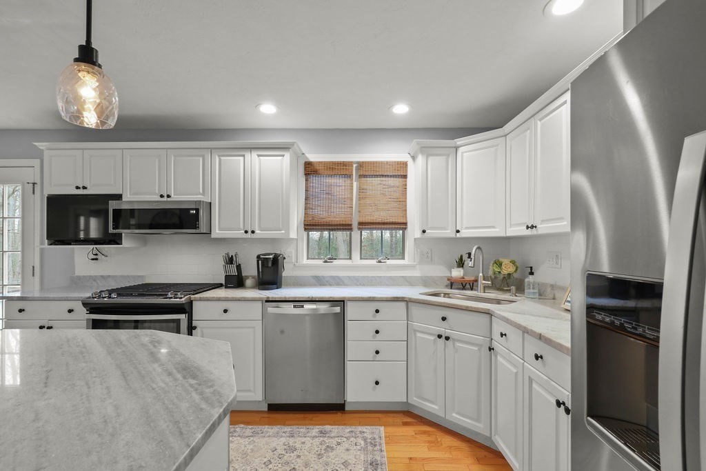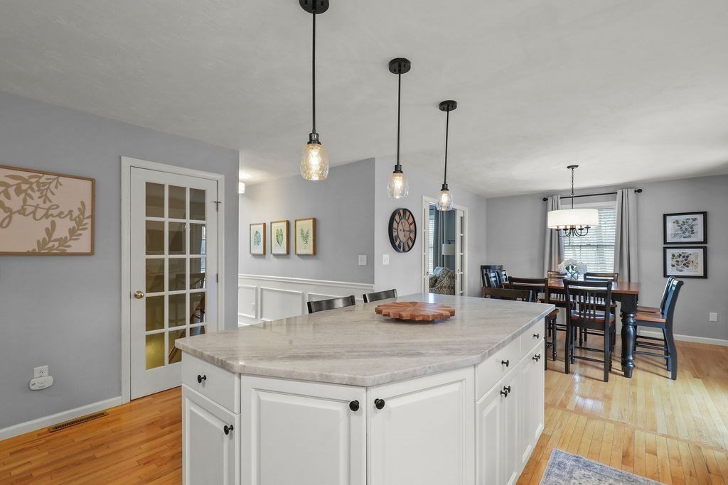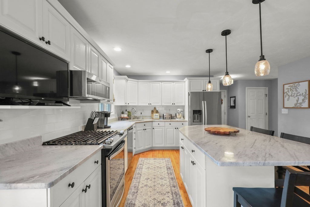 Newly Listed. This beautifully updated 3-bed, 2.5-bath Colonial features an open-concept kitchen with granite countertops, center island, professionally painted cabinets, and new backsplash—perfect for entertaining. Deck opens to a large yard with patio. Front dining room offers flexible use as an office or playroom. Enjoy the fireplaced living room with stone veneer fireplace and mantel. Wood floors throughout first-floor living room, office, and eat-in kitchen. Welcoming foyer with wainscoting and palladium window. Upstairs offers a primary suite with full bath and custom walk-in closet, plus two generous bedrooms and full bath with granite counters. Newer carpet upstairs . Finished lower level includes family room and bonus room; unfinished area provides ample storage. Two-car garage, central air, two-zone heat/A/C with separate units, city water/sewer. Exterior updates include new shutters, arborvitae, and new roof 2025. Located in the desirable Martin School