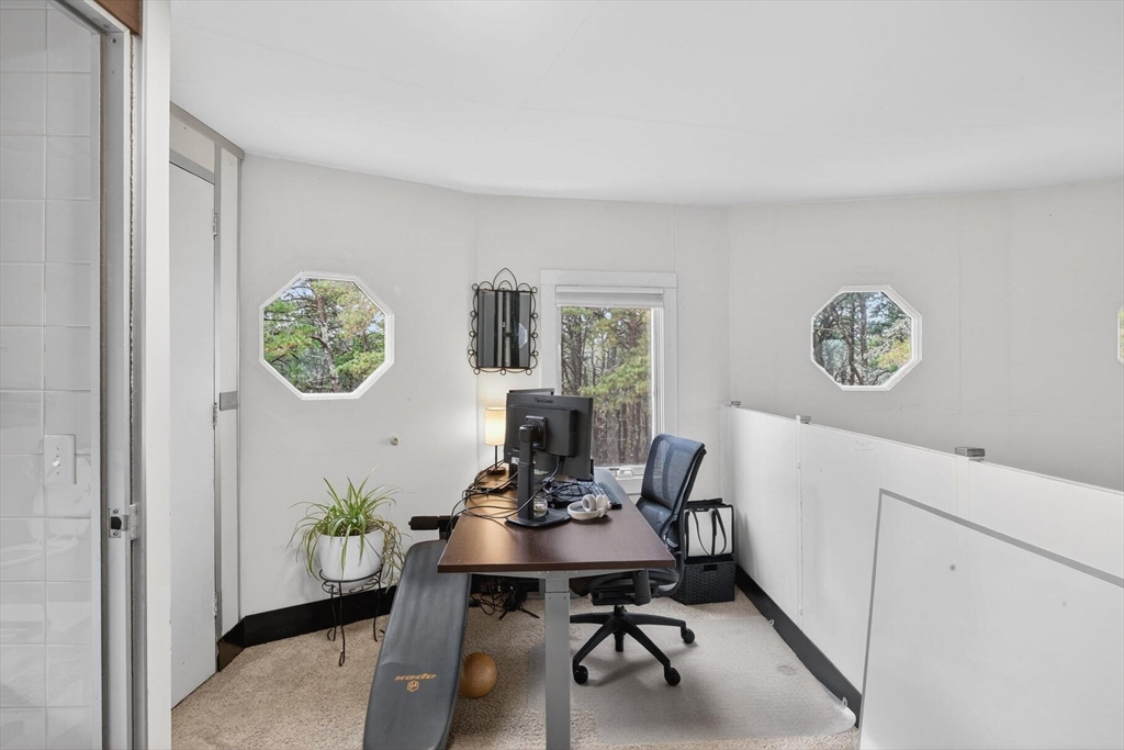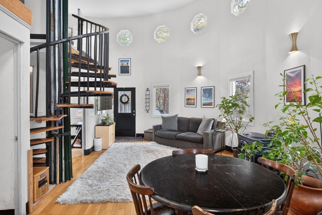 Nestled between the Cape Cod National Seashore and Truro Conservation Land, this distinctive home offers exceptional privacy and architectural character. Designed with a unique circular layout featuring soaring ceilings and a sun-filled loft perfect for a home office or creative workspace, the residence is currently configured as a two-bedroom home with a three-bedroom Title V septic system, providing flexibility for future expansion or reconfiguration. Set on an extremely private 0.86-acre lot surrounded by mature trees, the property offers ample outdoor space with potential for expansion or a pool. Located close to Truro's beautiful bay beaches and situated in one of the town's most desirable areas, the home also benefits from a strong rental history—making it an ideal Cape escape, investment opportunity, or private retreat.