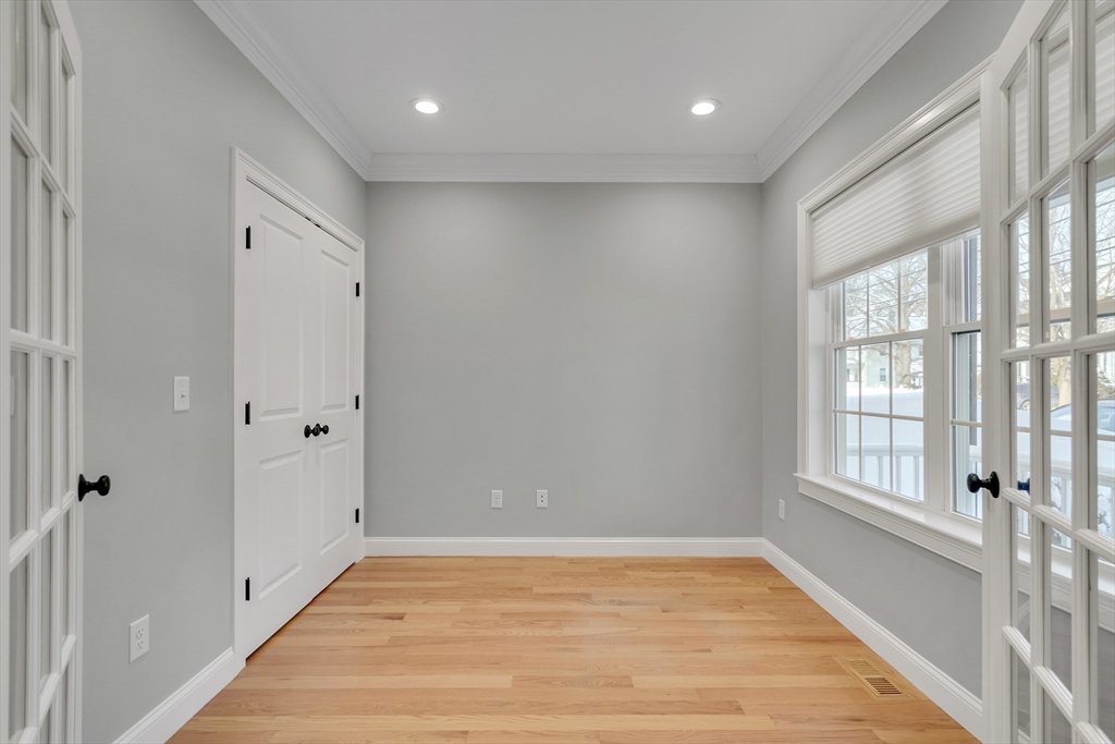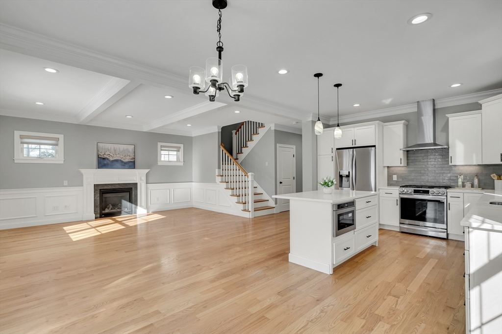 Welcome home to this finely crafted Colonial, thoughtfully designed for modern living. The sun-filled open plan is anchored by a chef-inspired kitchen featuring white cabinetry, Quartz countertops, under-cabinet lighting, and high-end LG stainless appliances. Elegant coffered ceilings, wainscoting, and a fireplace add charm, while the dining area opens to a composite deck and paver patio for seamless entertaining. A main level office with French doors adds versatility. Upstairs, discover a generous Main Bedroom suite with a custom walk-in closet and luxe bath, a convenient laundry room with built-in cabinetry, two additional bedrooms share another well-appointed full bath. The finished walk-out lower level expands your living space with a full bath and sliders to a private, fully fenced yard. Conveniently located near the Waltham Bio Hub, Prospect Hill Park, and vibrant Moody St dining with easy access to commuter routes. This move-in ready home blends style and convenience—a must-see!