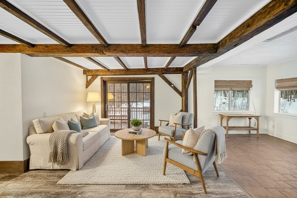 Circa-1720 post & beam home set on over six acres of peaceful woodland with a babbling brook running through the backyard. Exposed beams and vaulted ceilings highlight a sun-filled country kitchen with classic cabinetry, farmhouse sink, and radiant heated floors. A brick hearth with wood-burning stove anchors the inviting living room. The first-floor primary bedroom offers direct access to the deck and connects seamlessly to the main living space. A bright sunroom with abundant natural light features a mini-split system for efficient cooling. The full bath includes a soaking tub and radiant heated flooring. Hardwood and tile floors throughout. Private, scenic setting with wooded views and outdoor space to relax and enjoy nature.