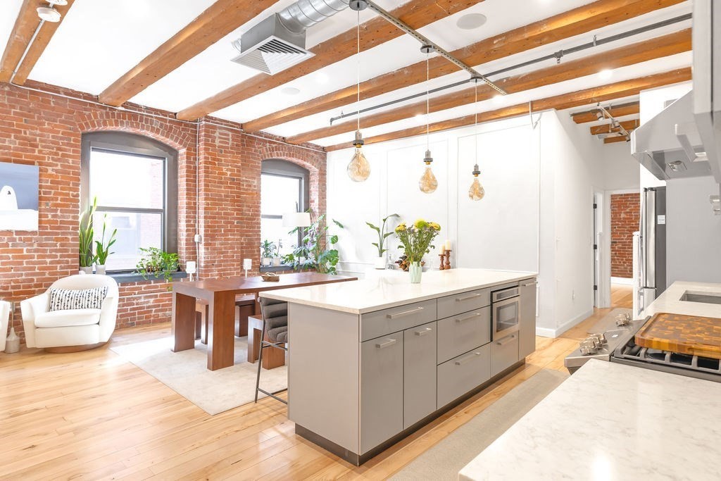 Beautifully updated 3BR/2.5BA brick-and-beam home with a private balcony and soaring 10’ ceilings in the heart of Fort Point. Located in a well-maintained elevator building, this residence offers an open-concept kitchen, living, and dining area ideal for entertaining, featuring quartz countertops, sleek cabinetry, under-cabinet lighting, and newer appliances including a gas range, refrigerator, dishwasher, drawer microwave, and in-unit washer/dryer. Extensive upgrades include soundproofing, recessed lighting, ceiling speakers, custom closets, built-ins with a fireplace, heated bathroom floors, refinished hardwood floors, and new HVAC and water heater. The spa-inspired primary suite features a steam shower and redesigned walk-in closet. Unbeatable location at 21 Wormwood, just steps to the Seaport and South Boston’s top restaurants, shopping, green spaces and waterfront attractions. One tandem garage parking space included, with opportunity to rent the additional tandem parking space.
