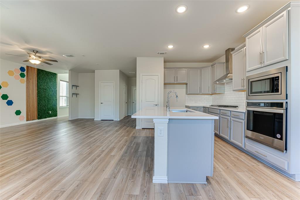 The gourmet kitchen is a chef’s dream, boasting a large island, built-in microwave and oven, gas cooktop, ample cabinetry, and recessed lighting. A dedicated home office with elegant French doors is conveniently located on the first floor, along with an additional loft area upstairs for extra versatility.