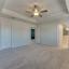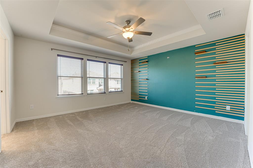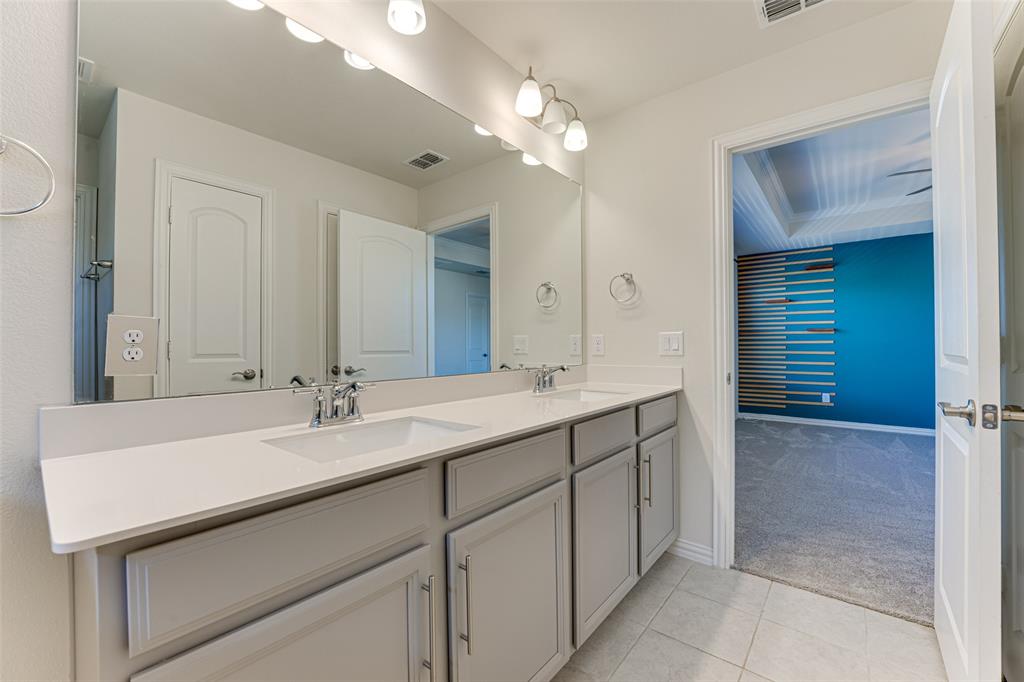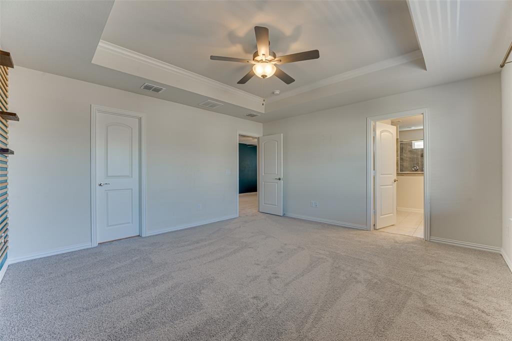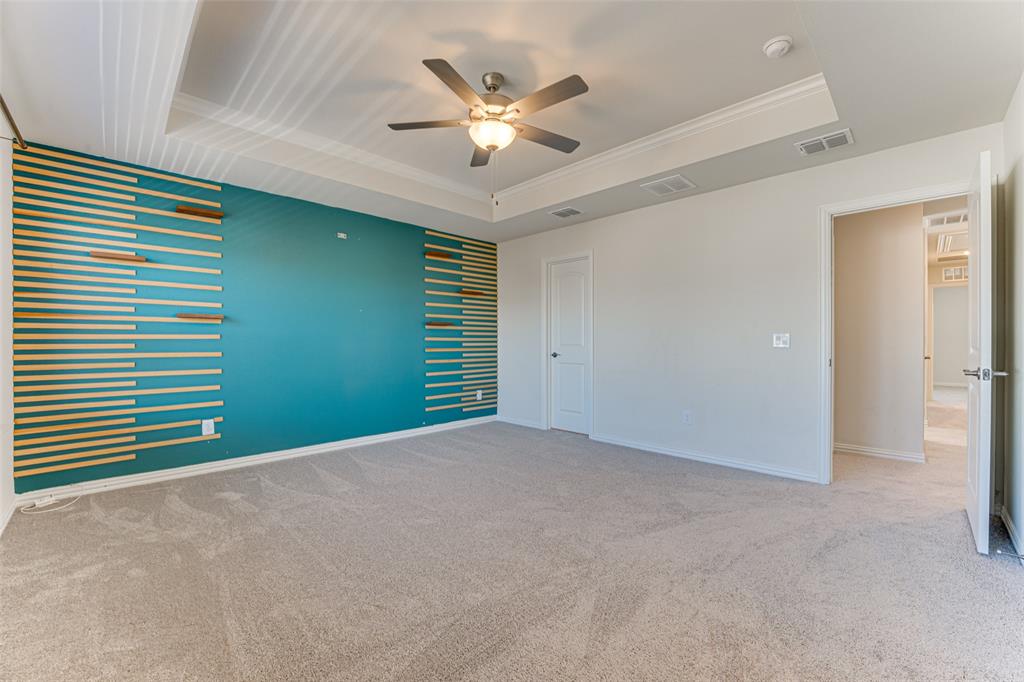 The primary suite is a true retreat, highlighted by a tray ceiling, generous walk-in closet, and luxurious ensuite bath featuring an extra-long double vanity, oversized walk-in shower with bench, and multiple sprayers. Two spacious secondary bedrooms, each with walk-in closets, provide plenty of storage.