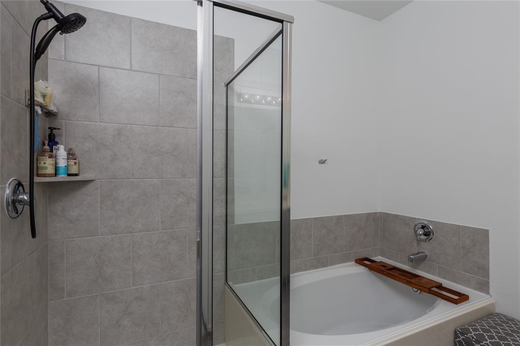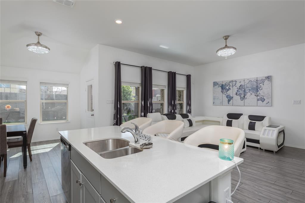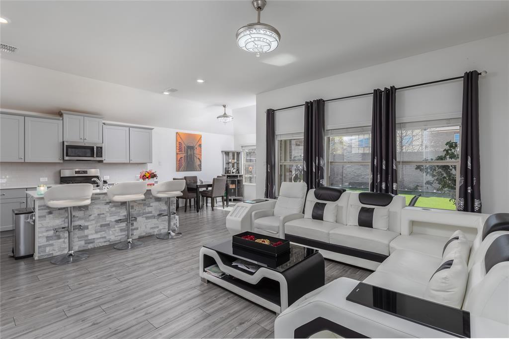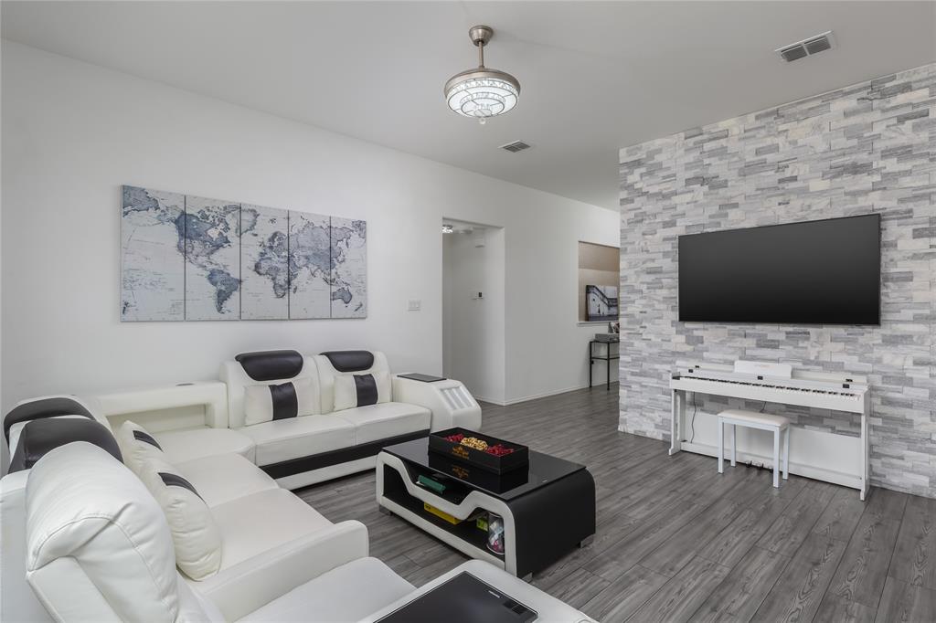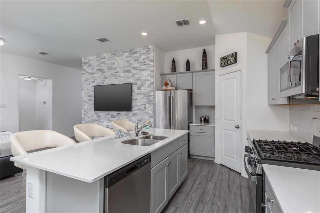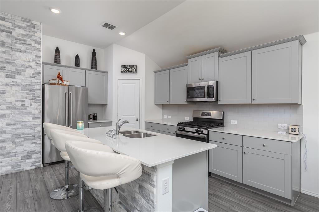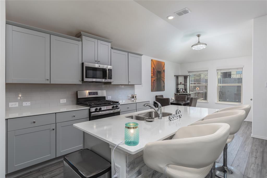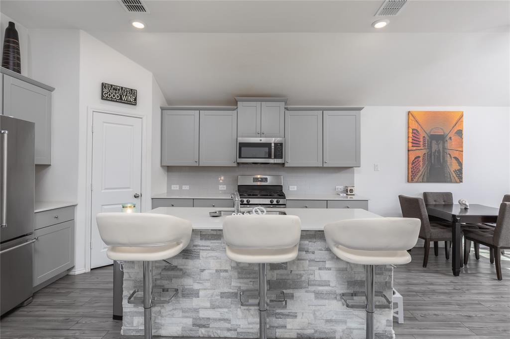 Stylish Comfort Just Steps from the Pool! Discover this impeccably maintained 4-bedroom, 2-bathroom gem in the highly sought-after Hillstone Pointe Subdivision—just two doors down from the community pool! Thoughtfully updated and designed for modern living, this home combines functionality with custom flair. Step inside to a bright, open-concept layout that seamlessly connects the living, dining, and kitchen areas—perfect for entertaining or everyday comfort. The kitchen is a true standout, complete with crisp white quartz countertops, stainless steel appliances, a gas range, walk-in pantry, and a custom stone-accented island that makes a stylish statement. The living room features a striking stone accent wall and distinctive lighting with obscure fan fixtures, adding a unique designer touch. Curb appeal shines with lush landscaping, and the epoxy-coated garage floor adds a polished finish. Retreat to the spacious primary suite, where you’ll find room for a sitting area, dual sinks, a walk-in closet, soaking tub, and separate shower—your personal sanctuary. Three additional bedrooms are located on the opposite side of the home, offering flexible options for guests, a home office, or creative space. Step out back to enjoy the covered patio and a generous backyard ready for relaxing, entertaining, or playtime. A dedicated utility room adds convenience with full-size washer and dryer hookups. This move-in-ready home blends style, comfort, and an unbeatable location!