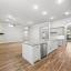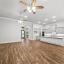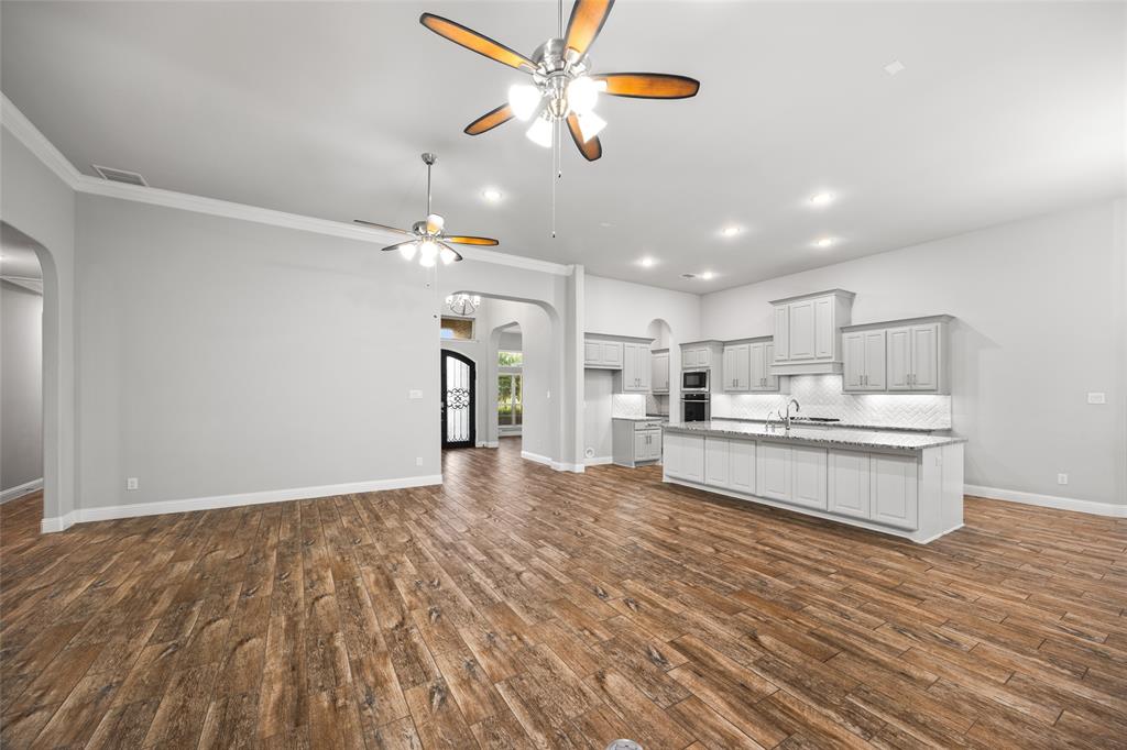 The open-concept living space is anchored by luxurious wood-look tile and a chef’s kitchen featuring an 11-foot island, granite countertops, stainless steel appliances, and generous cabinetry—perfect for entertaining or everyday family life.