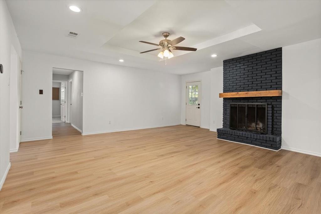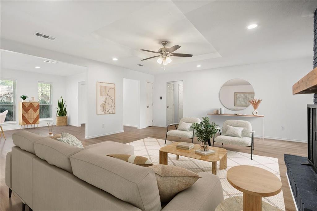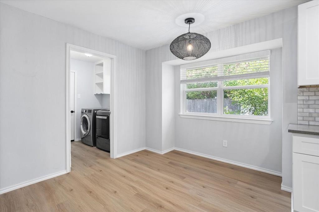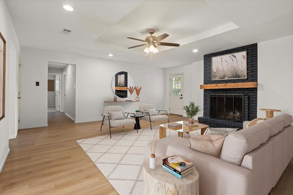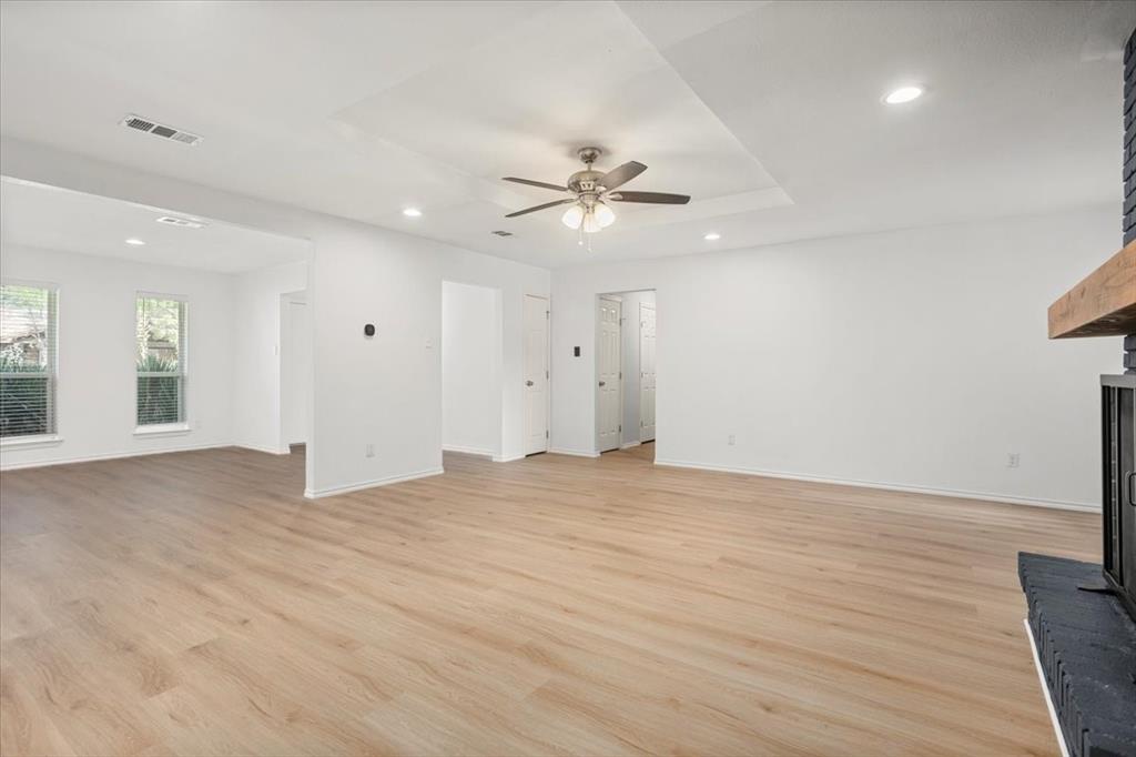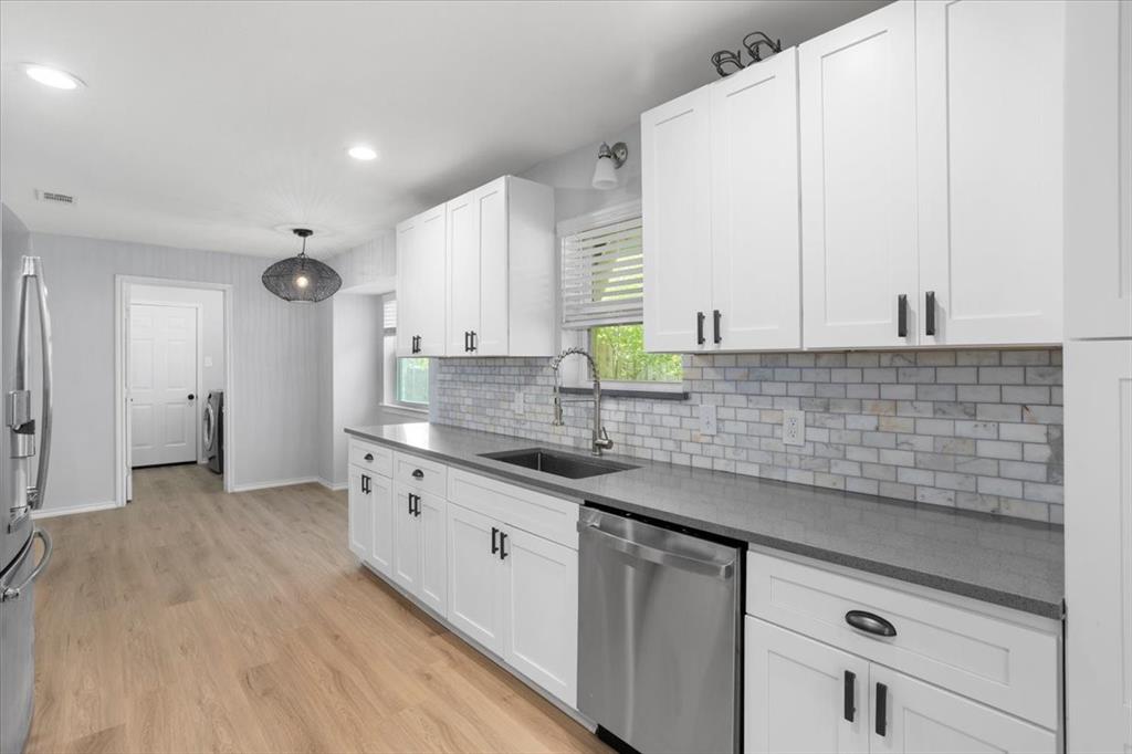 Perfectly situated on nearly a quarter-acre lot in desirable Pantego, this beautifully remodeled 4 bedroom, 2.5 bath home has been carefully updated and maintained, blending modern elegance with everyday comfort. The light-filled kitchen showcases stainless-steel appliances, sleek white cabinetry with black hardware, and a custom designer tile backsplash. New luxury vinyl plank flooring flows seamlessly throughout spacious living areas, including an inviting living room anchored by a dramatic floor-to-ceiling black brick fireplace with a custom mantle. The dining area offers effortless flow for both entertaining and daily living.