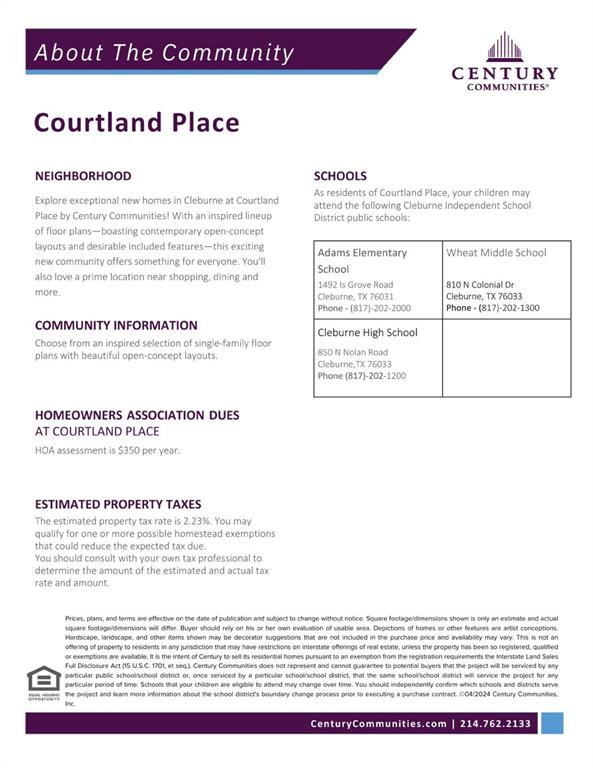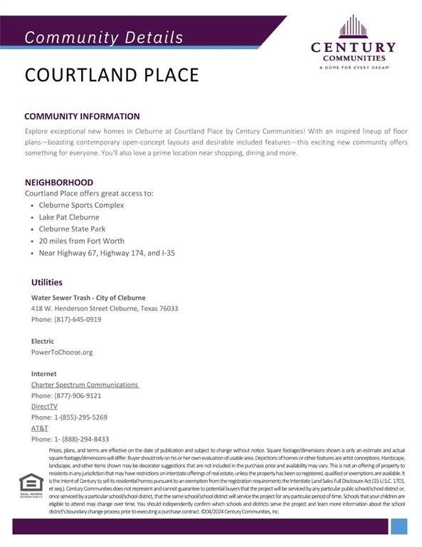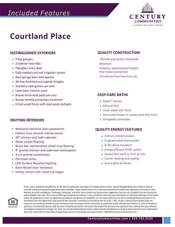 MOVE IN READY! The Arlington at Courtland Place welcomes you with an inviting open-concept layout, anchored by a wide-open great room, a charming dining area with direct access to a patio and a well-equipped kitchen—boasting a walk-pantry. You’ll also appreciate two secondary bedrooms that flank a full hall bath. Secluded at the rear of the home, the elegant primary suite showcases a spacious walk-in closet and a private bath with dual sinks and a walk-in shower. Courtland Place offers something for everyone in a prime location near shopping, dining, and more!