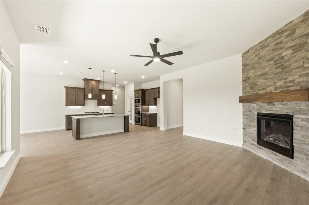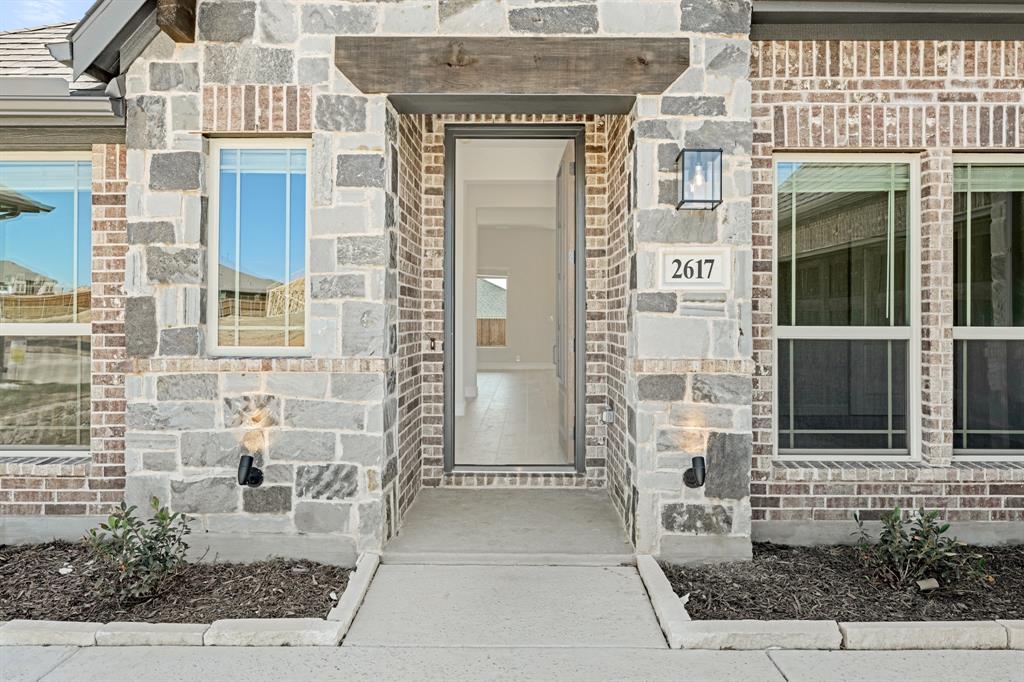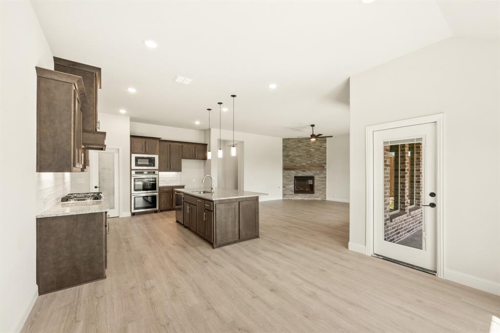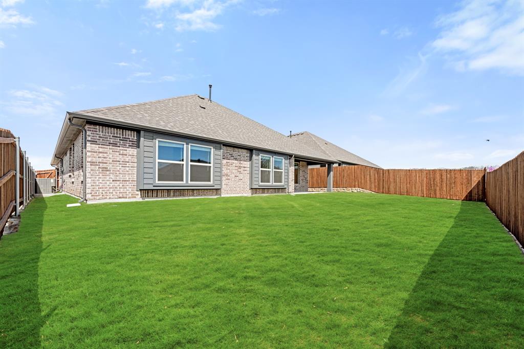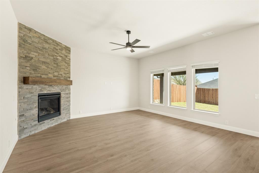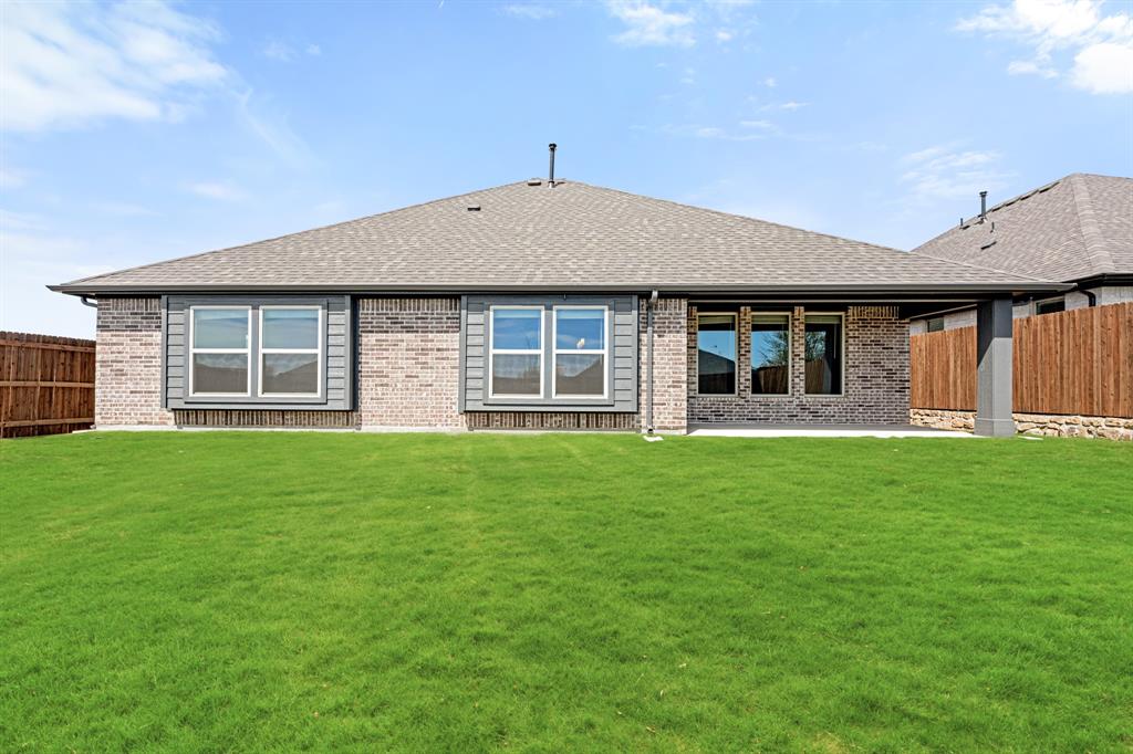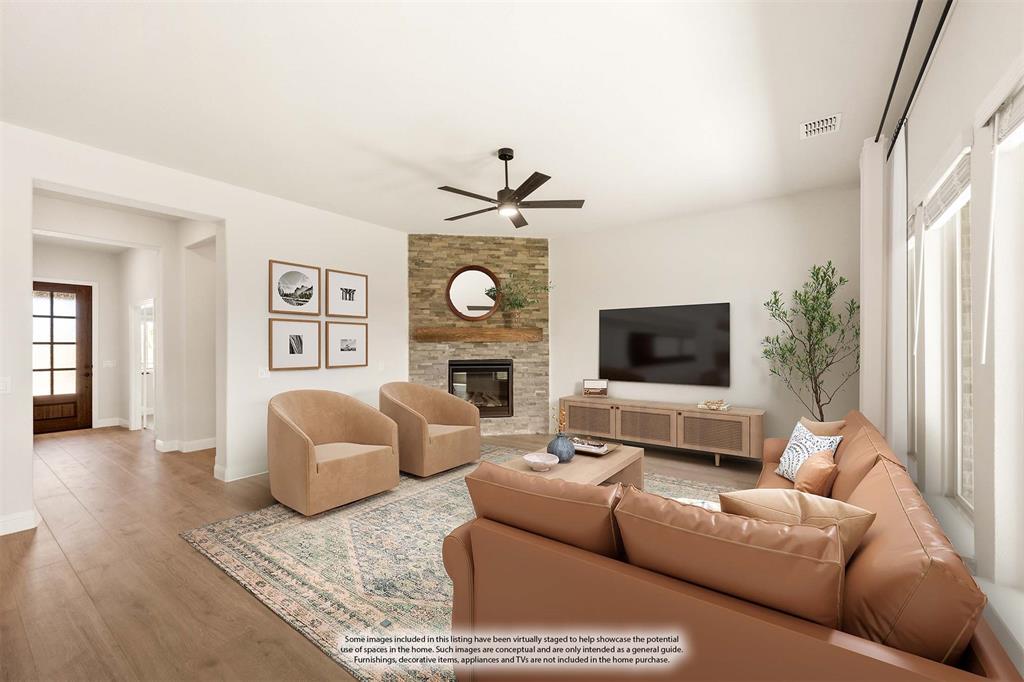 Ready NOW, Bloomfield’s single-story Rockcress is nestled in a master-planned community with amenities galore. This elegant home boasts a brick and stone exterior, a cedar garage door, and an 8' Mahogany front door with glass and iron. Inside, discover 3 spacious bedrooms, a study, 2 full baths, and a guest powder bath all in a soft-contemporary color palette. The Deluxe Kitchen is a culinary dream with shaker cabinets, a double oven, a gas cooktop, and Granite countertops. Gather around the Stone-to-Ceiling Fireplace in the living area with laminate floors flowing through main areas, tiled bath and utility rooms, and plush carpet in bedrooms. The covered back patio is perfect for entertaining, complete with a gas hookup for the grill. Practical touches include a gas tankless water heater, 2in Faux wood blinds, full rain gutters, and a 6’ stained wood fence with metal posts and two gates. Extensive energy features ensure year-round comfort. Plus, enjoy top-rated Joshua schools, a community pool, a playground, trails, and neighborhood activities.
