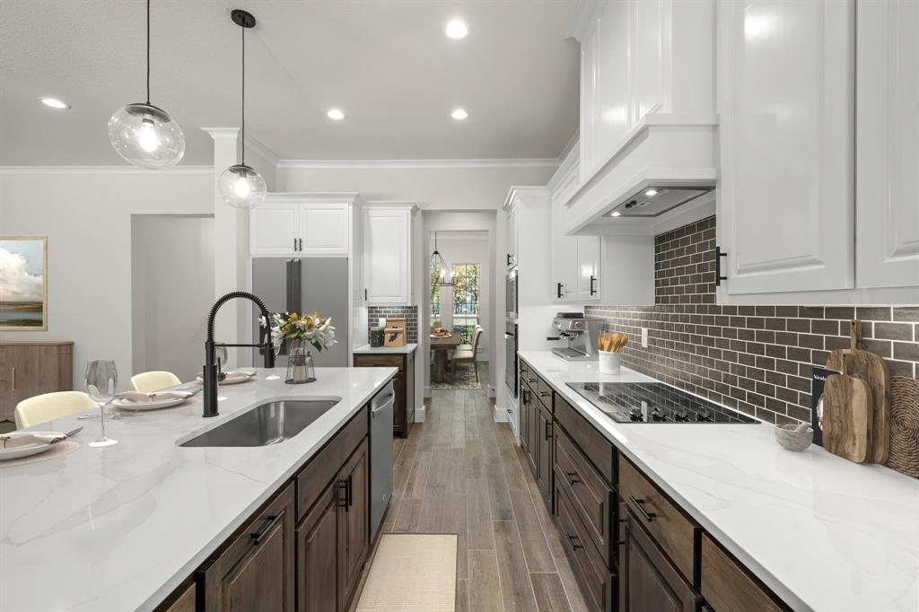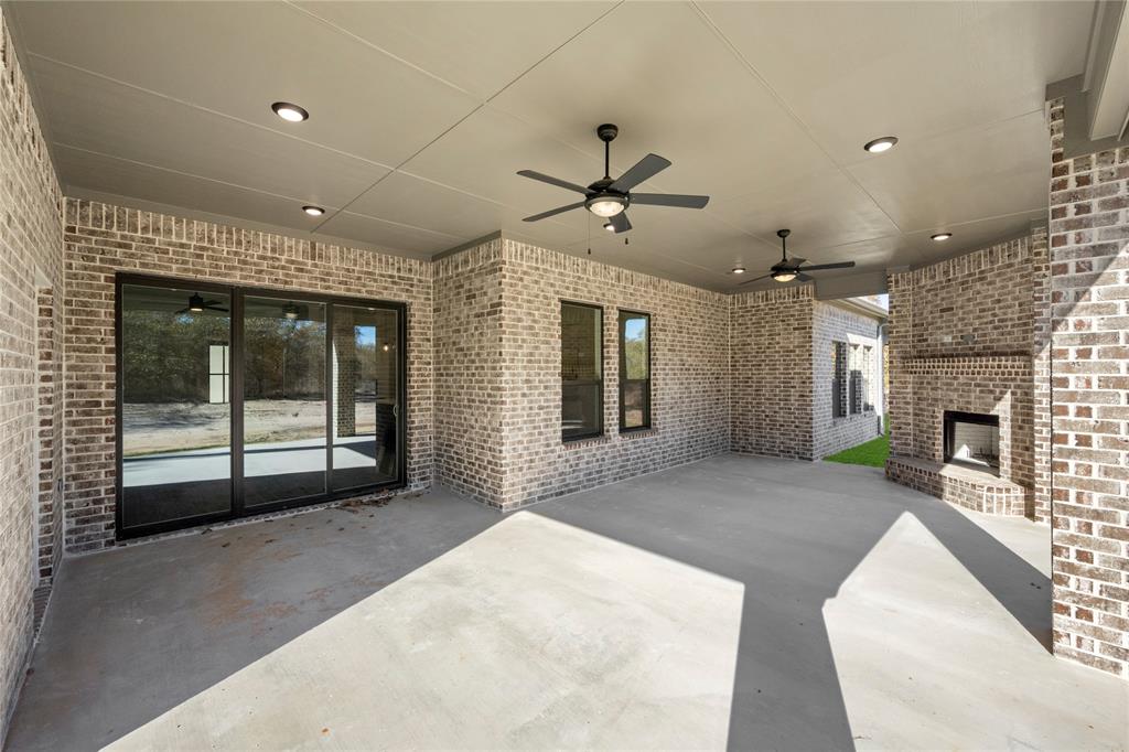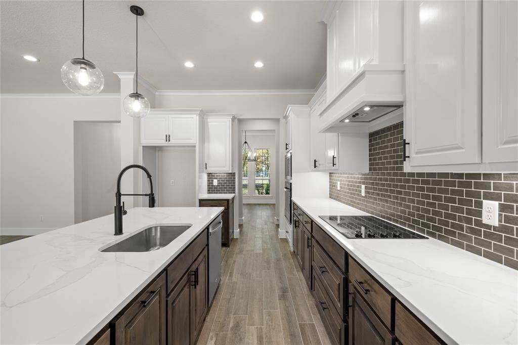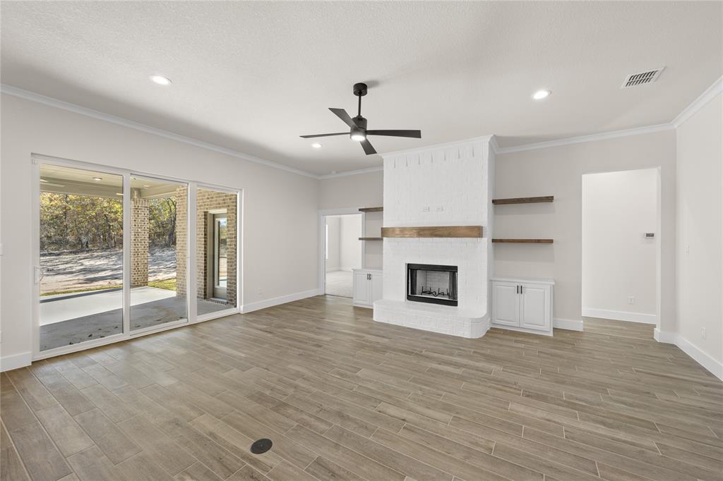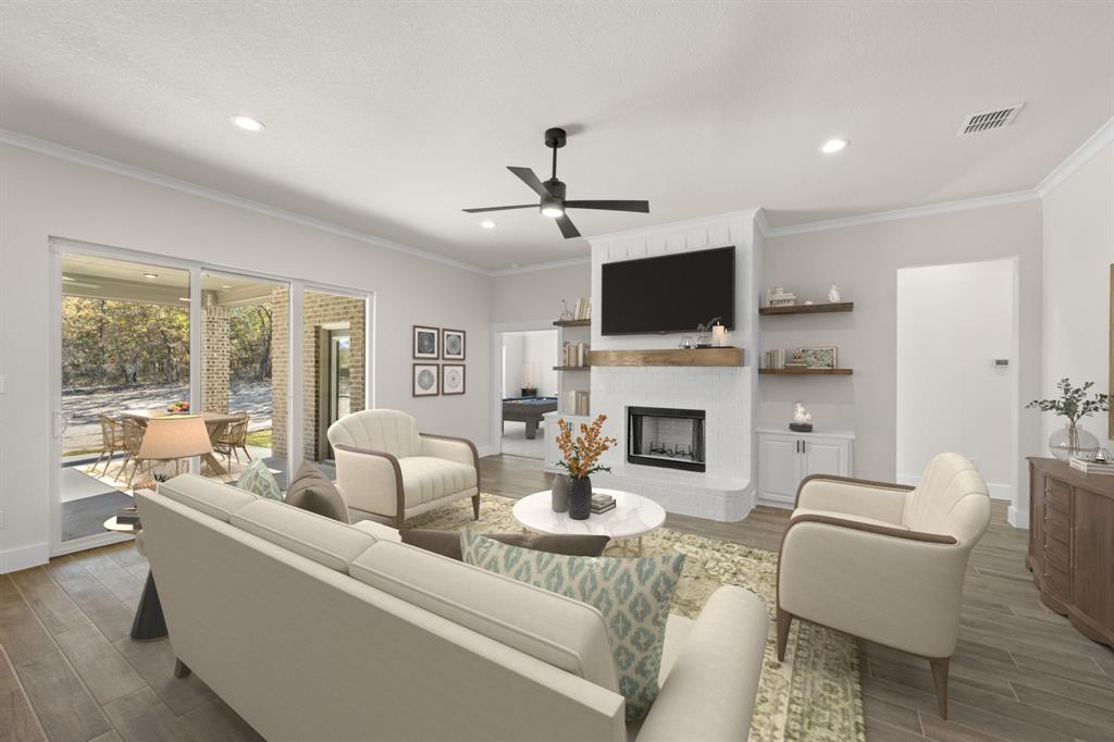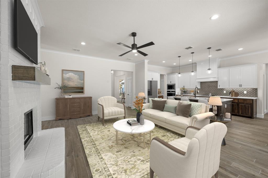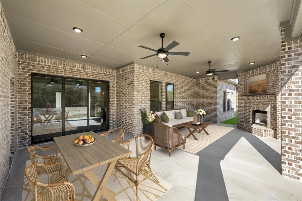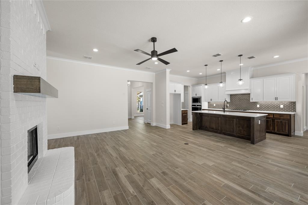 MLS# 20724555 - Built by Brookson Builders - Ready Now! ~ Four uplights illuminate the elegant painted brick exterior, welcoming you through a custom front door. Inside, the living room impresses with a floor-to-ceiling painted brick fireplace, wood-wrapped mantel, and built-in cabinetry. The kitchen dazzles with under-cabinet lighting, and a decorative backsplash. Enjoy practical touches like a pull-out trash can and crown molding in the kitchen and nook. A custom 3-panel sliding door floods the space with natural light, leading to a back patio with an exterior fireplace and ceiling fan. In the master suite, a barn door with a mirror on the bath side opens to a luxurious bathroom featuring custom tile and square sinks. Recessed lighting in the master bedroom and game room adds modern flair. Additional highlights include a custom mud bench with a shiplap back wall, wood-look tile throughout!