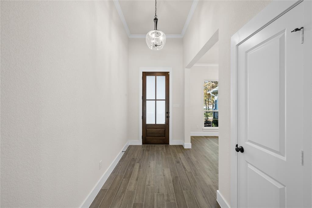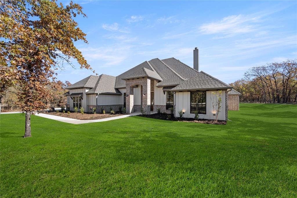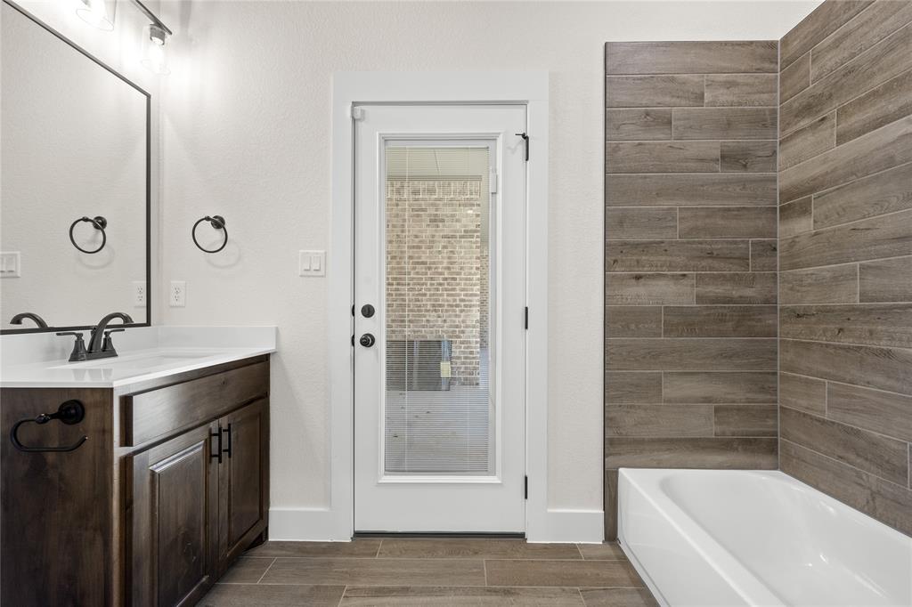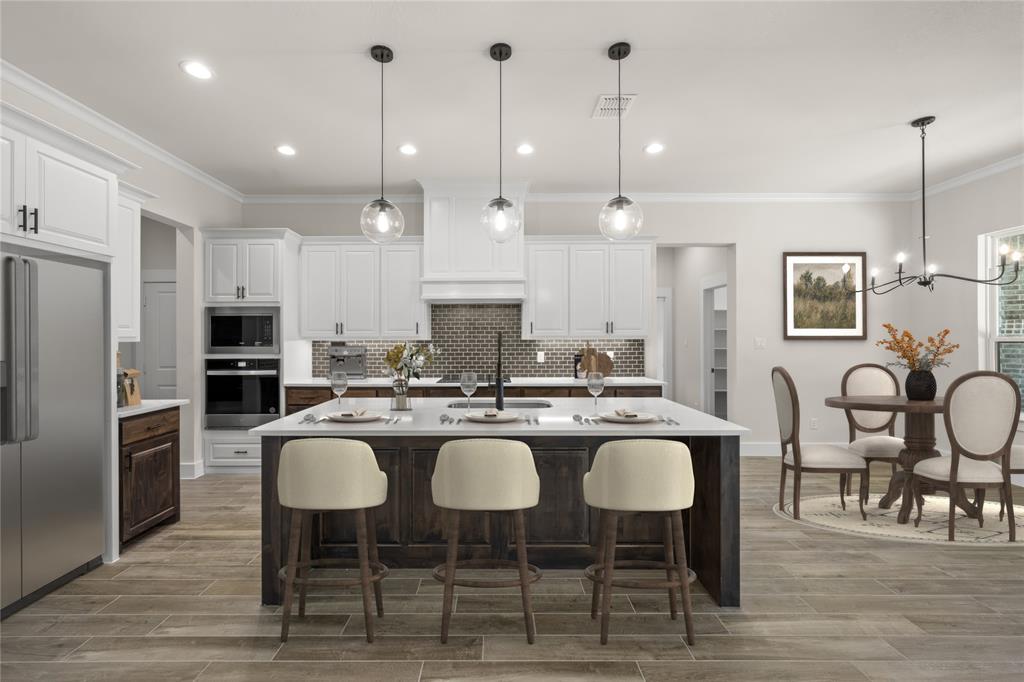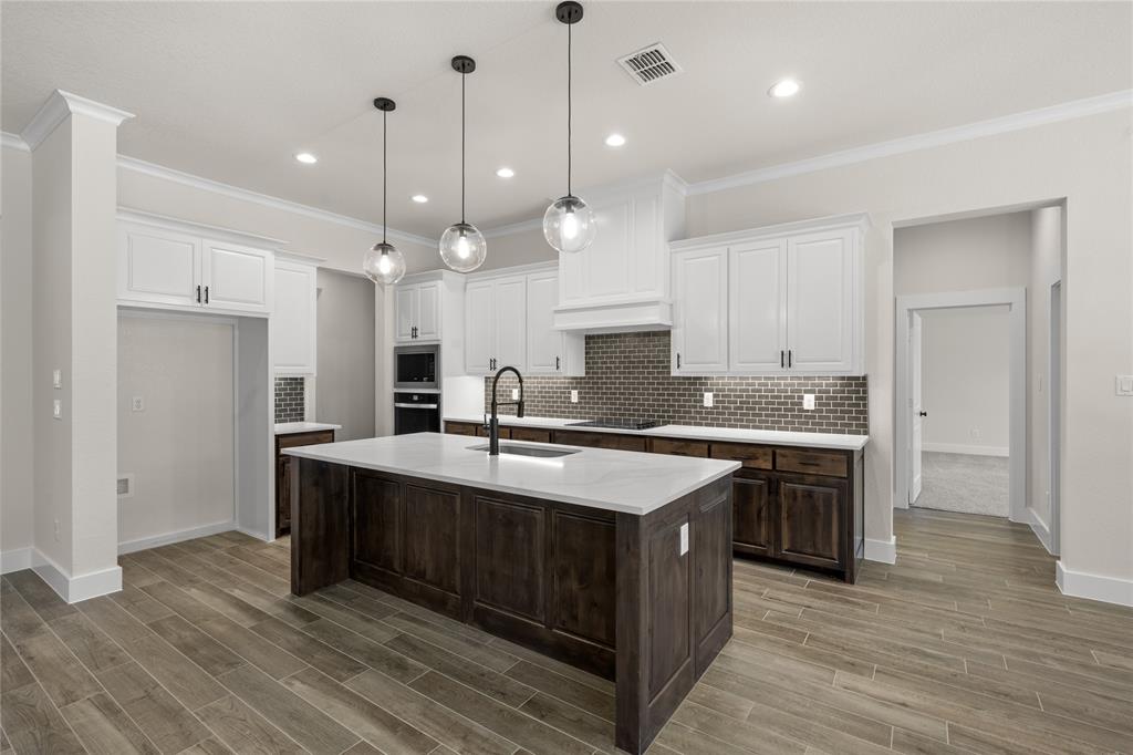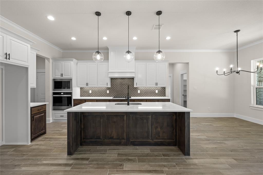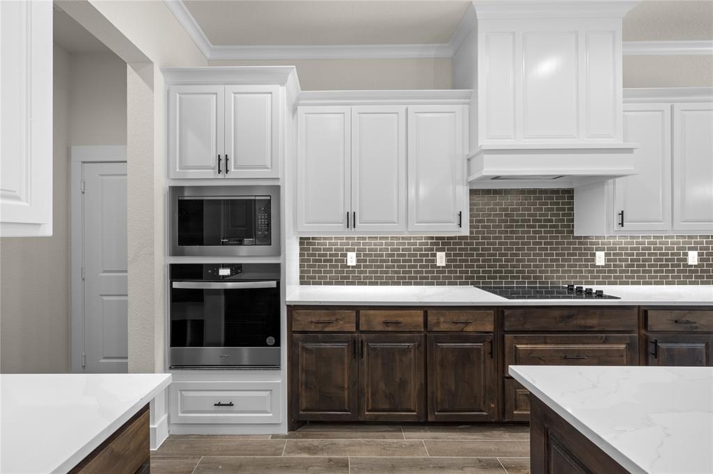 MLS# 20724555 - Built by Brookson Builders - Ready Now! ~ Four uplights illuminate the elegant painted brick exterior, welcoming you through a custom front door. Inside, the living room impresses with a floor-to-ceiling painted brick fireplace, wood-wrapped mantel, and built-in cabinetry. The kitchen dazzles with under-cabinet lighting, and a decorative backsplash. Enjoy practical touches like a pull-out trash can and crown molding in the kitchen and nook. A custom 3-panel sliding door floods the space with natural light, leading to a back patio with an exterior fireplace and ceiling fan. In the master suite, a barn door with a mirror on the bath side opens to a luxurious bathroom featuring custom tile and square sinks. Recessed lighting in the master bedroom and game room adds modern flair. Additional highlights include a custom mud bench with a shiplap back wall, wood-look tile throughout!