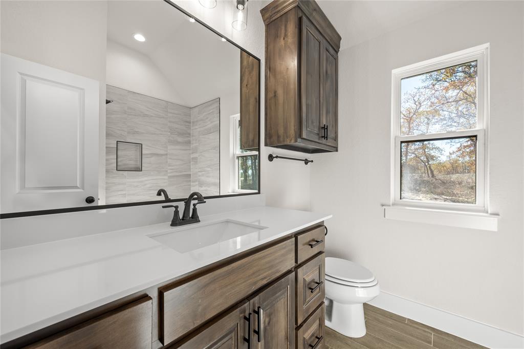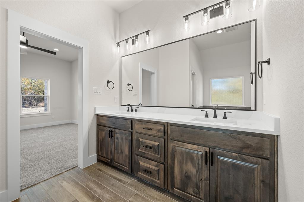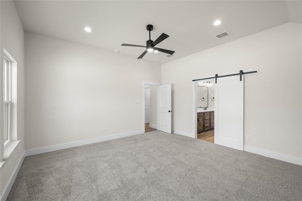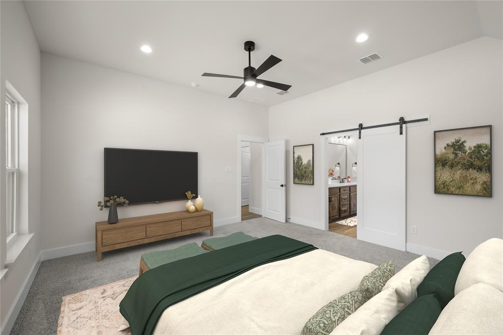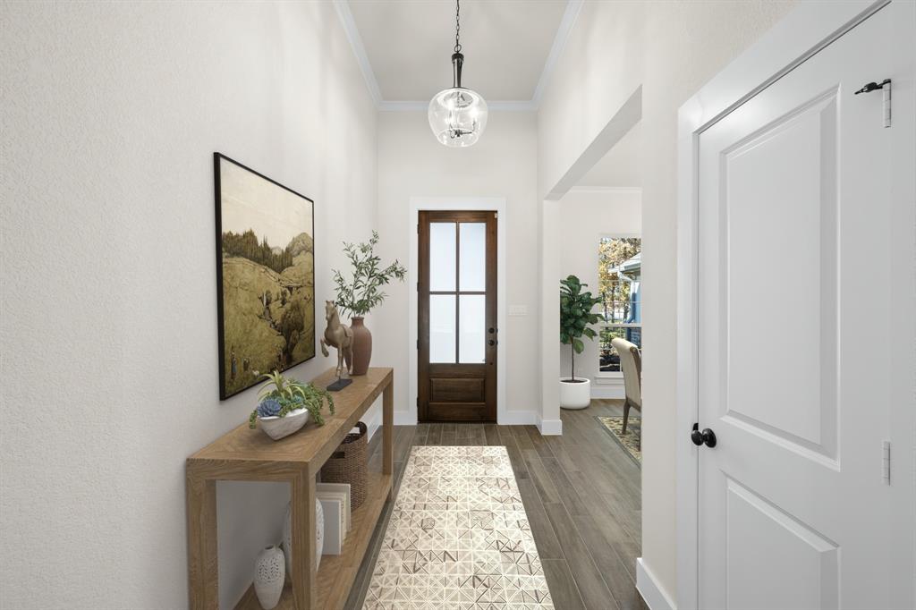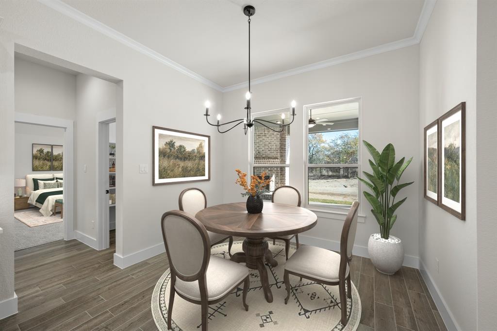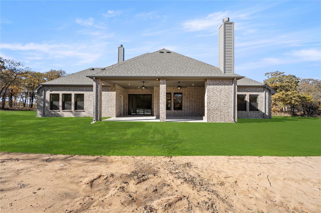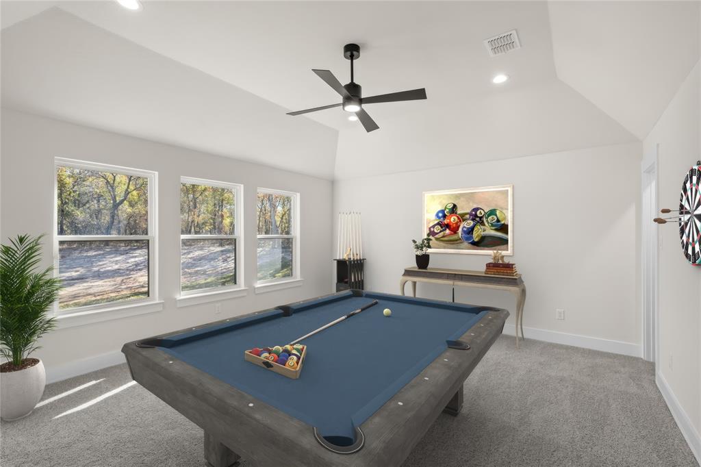 MLS# 20724555 - Built by Brookson Builders - Ready Now! ~ Four uplights illuminate the elegant painted brick exterior, welcoming you through a custom front door. Inside, the living room impresses with a floor-to-ceiling painted brick fireplace, wood-wrapped mantel, and built-in cabinetry. The kitchen dazzles with under-cabinet lighting, and a decorative backsplash. Enjoy practical touches like a pull-out trash can and crown molding in the kitchen and nook. A custom 3-panel sliding door floods the space with natural light, leading to a back patio with an exterior fireplace and ceiling fan. In the master suite, a barn door with a mirror on the bath side opens to a luxurious bathroom featuring custom tile and square sinks. Recessed lighting in the master bedroom and game room adds modern flair. Additional highlights include a custom mud bench with a shiplap back wall, wood-look tile throughout!