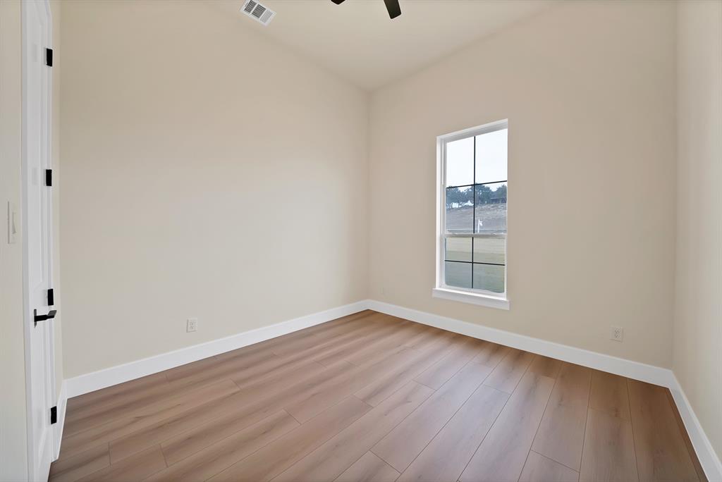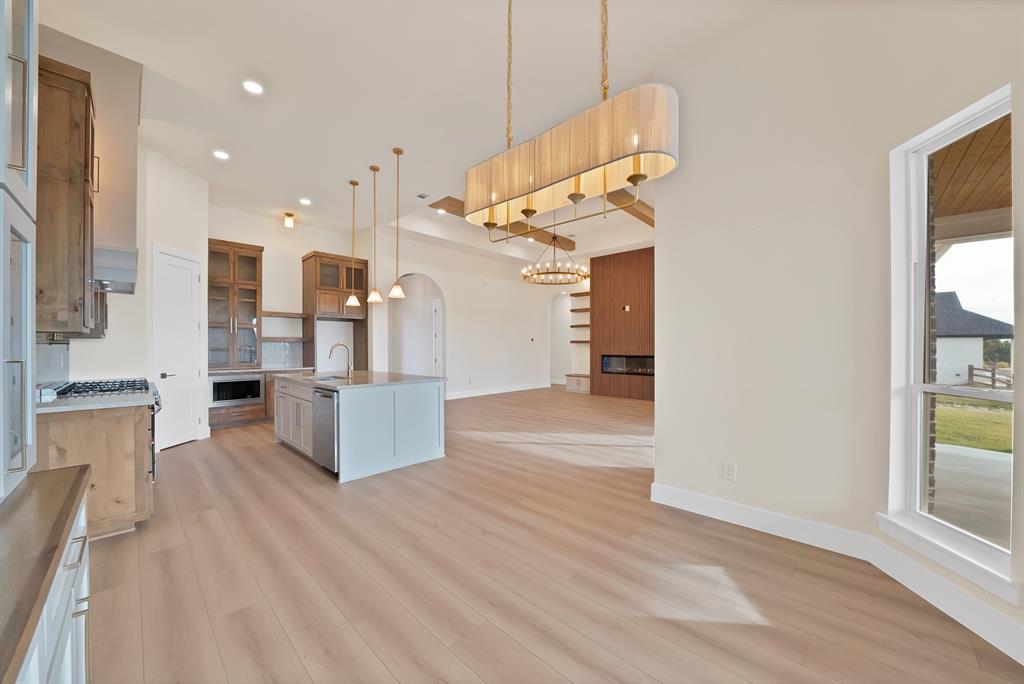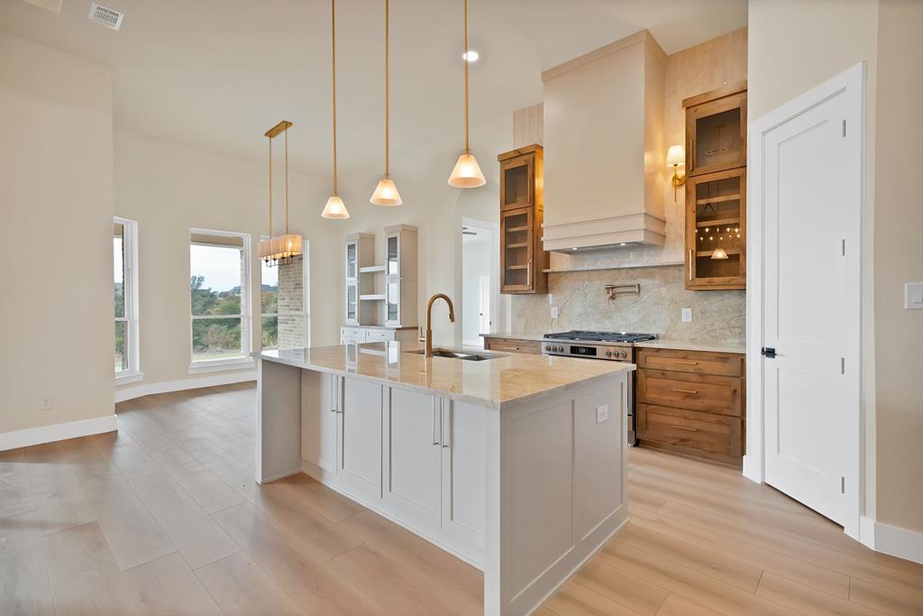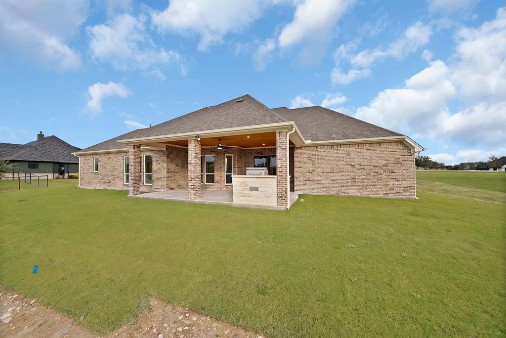 Located in a gated community, this custom designed 4 bedroom, 3 bath home offers the perfect blend of modern farmhouse charm and luxury finishes. Set on 2 acres in highly sought after Brock ISD. The open concept layout features soaring ceilings, wood beam accents, and an abundance of natural light. The living area boasts a striking floor to ceiling fireplace wall with built-ins, flowing seamlessly into the gourmet kitchen with an oversized island, pot filler, walk-in pantry, and custom cabinetry. The dining area showcasing panoramic views of the expansive backyard and opens to a covered patio with an outdoor kitchen ideal for entertaining. Retreat to the private primary suite with a spa inspired bath featuring a freestanding tub, walk-in shower, dual vanities, and a massive custom closet. Additional bedrooms are generously sized, with designer baths and a split floor plan offering privacy for guests. A mudroom, oversized laundry with built-ins, and 3-car garage adding functionality to the luxury. Enjoy peaceful country living with modern amenities, all within minutes of schools, shopping, and dining.