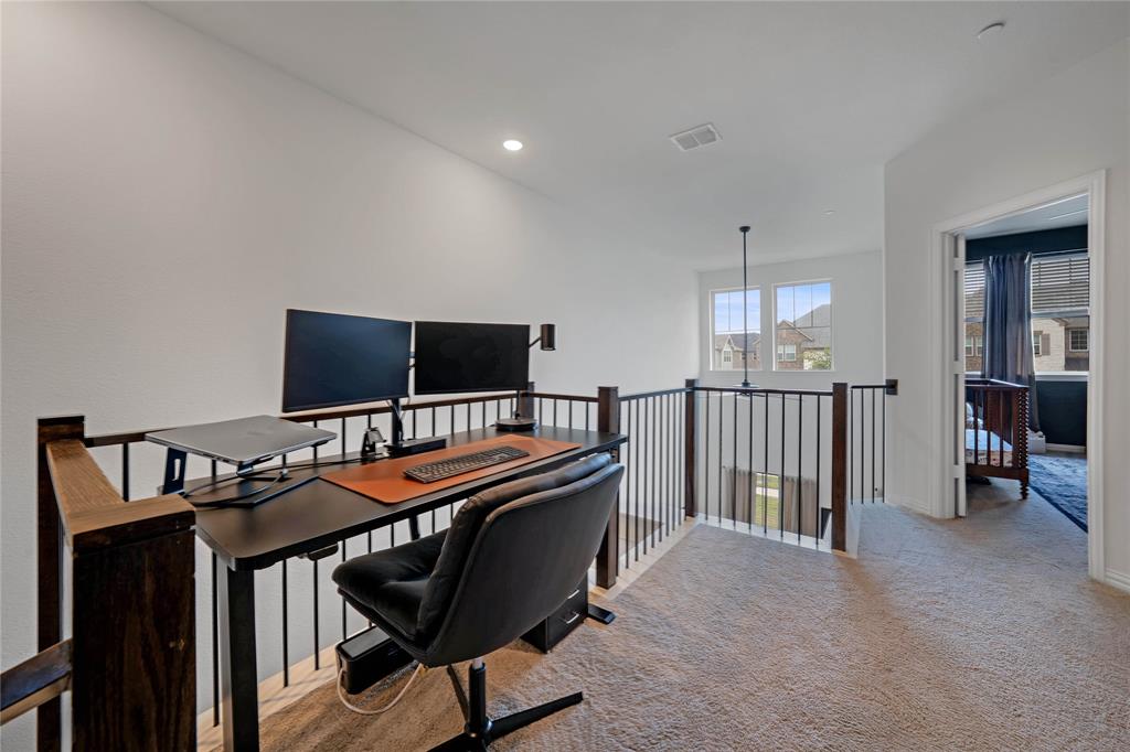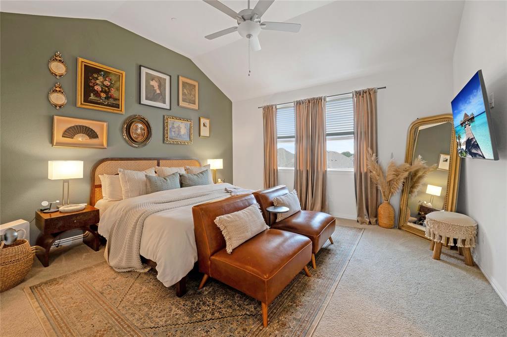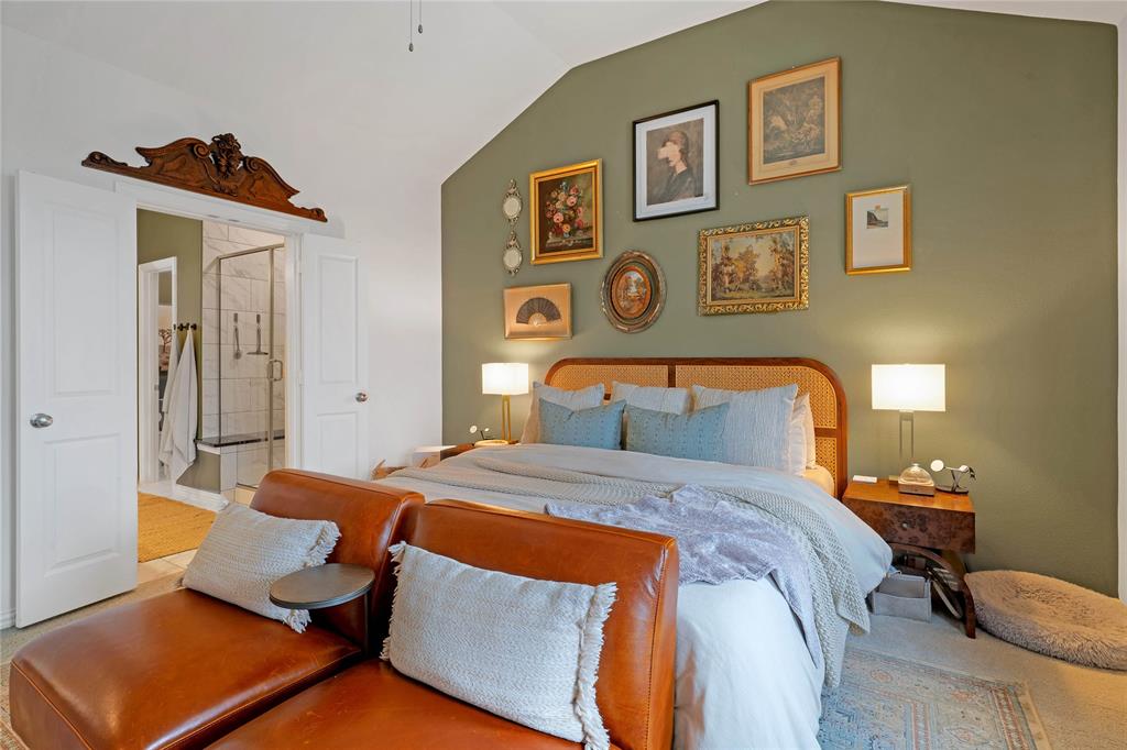 Upstairs, a versatile loft provides the perfect setting for a home office, reading retreat, or lounge. The expansive primary suite is a luxurious private escape, boasting vaulted ceilings and a spa-inspired ensuite with dual vanities, a dedicated makeup counter, and a walk-in shower with bench seating.