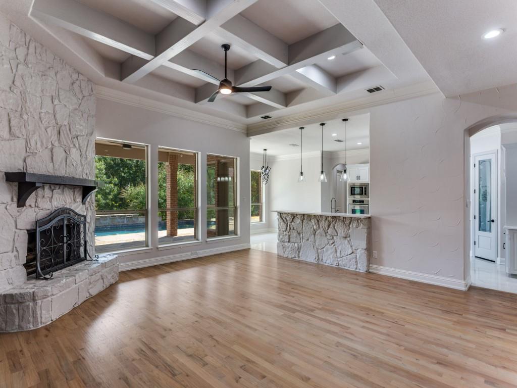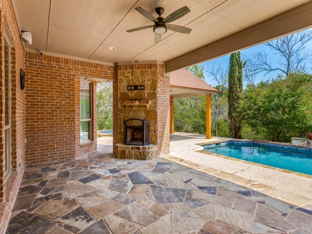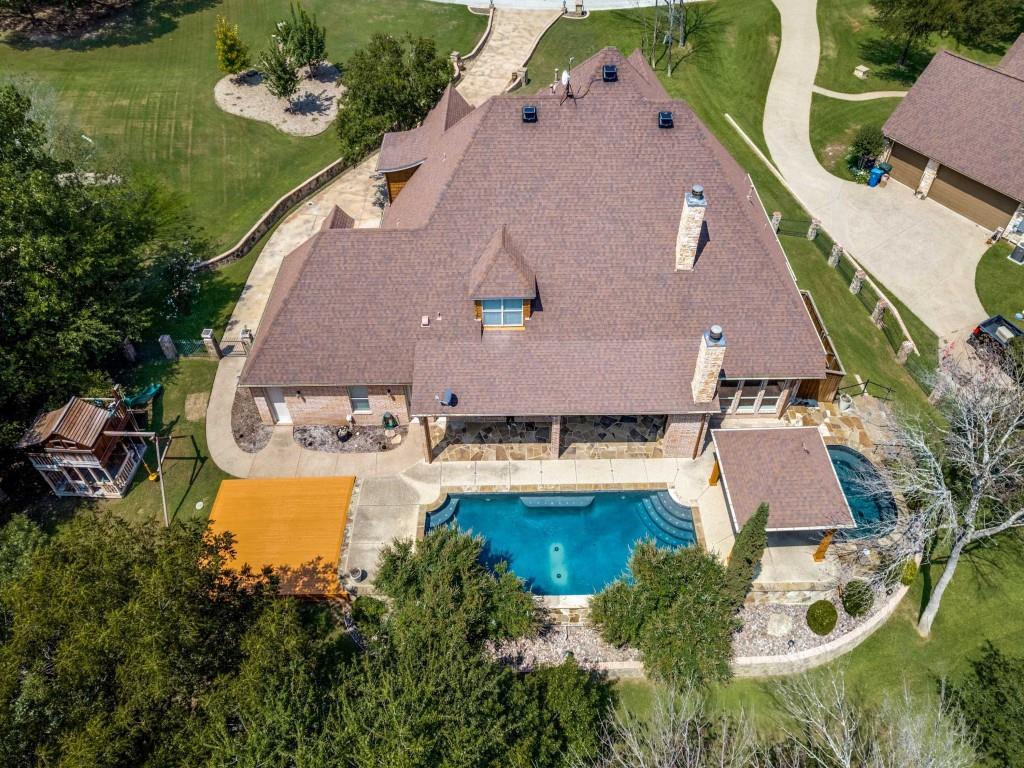 Aledo Schools! Fabulous custom brick and stone home in the highly desired Covered Bridge Canyon subdivision. With approximately 4494 sq. ft. this home sits on a 1.3 acre treed lot with a resort style private backyard. Spacious 4 bedroom, 4 bath home with 3 living areas, formal dining, study-office and oversized 3 car garage. Eat-in kitchen with stainless appliances, walk-in pantry, butlers pantry & breakfast bar open to the family room. Family room features beamed ceiling with stone fireplace. Primary suite with sitting area, dual vanities, separate shower, jet-tub & large walk-in closet. Guest suite downstairs. Upstairs includes: game-room with built-ins, media-room, 2 secondary bedrooms. Covered outdoor living area with fireplace, pool & spa with amazing views. Community pool and park. This one will not disappoint!